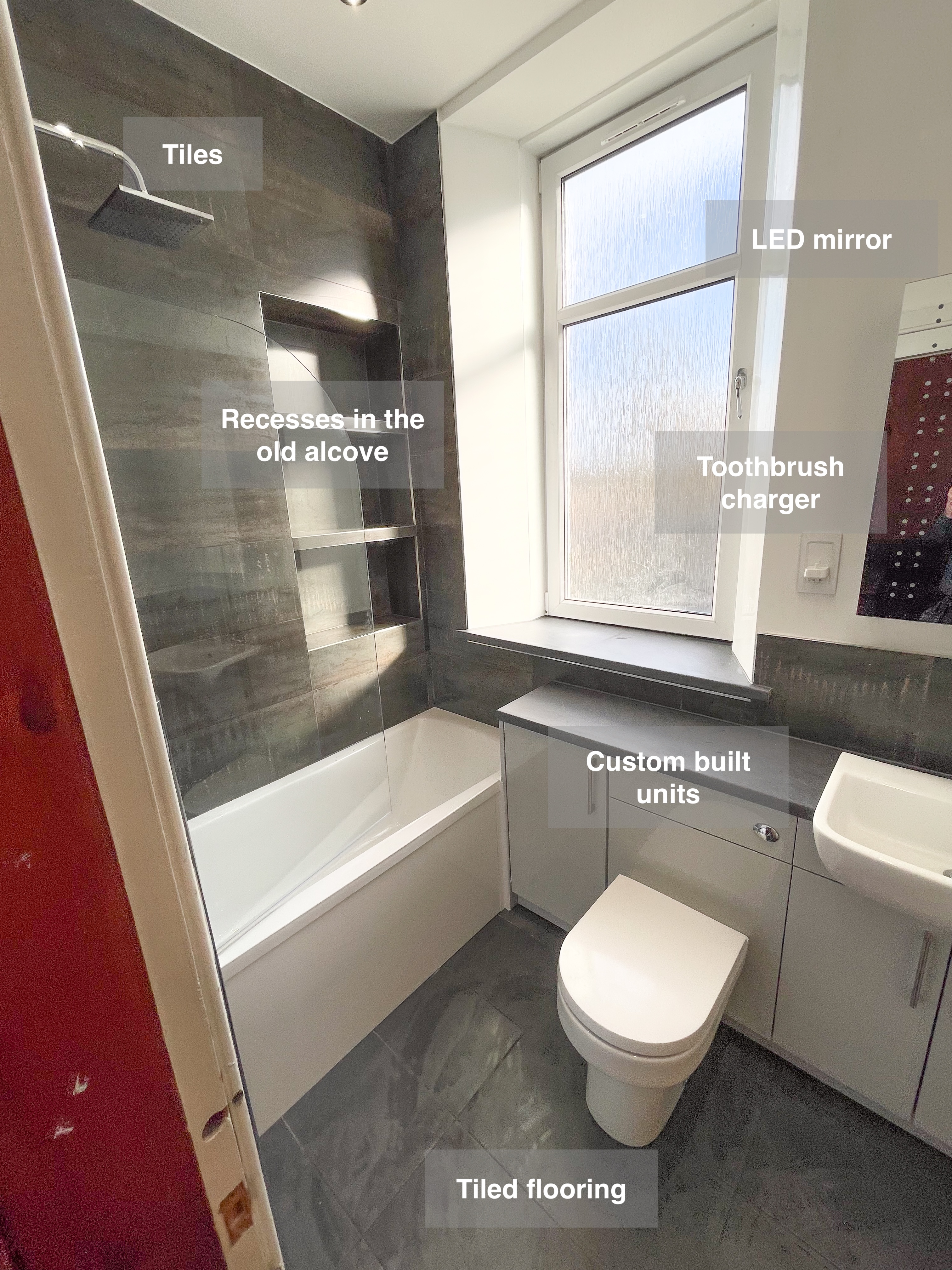 Full refurbishment with tiles all around the room, shower enclosure and freestanding bathtub. https://youtu.be/JSfBaK4XJ2k