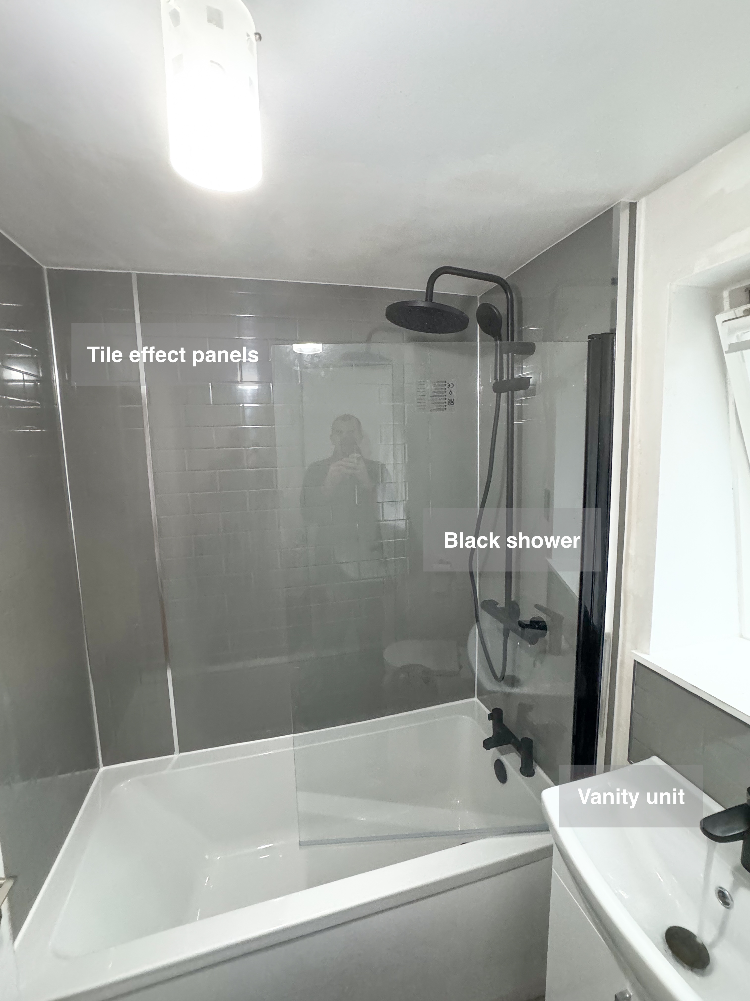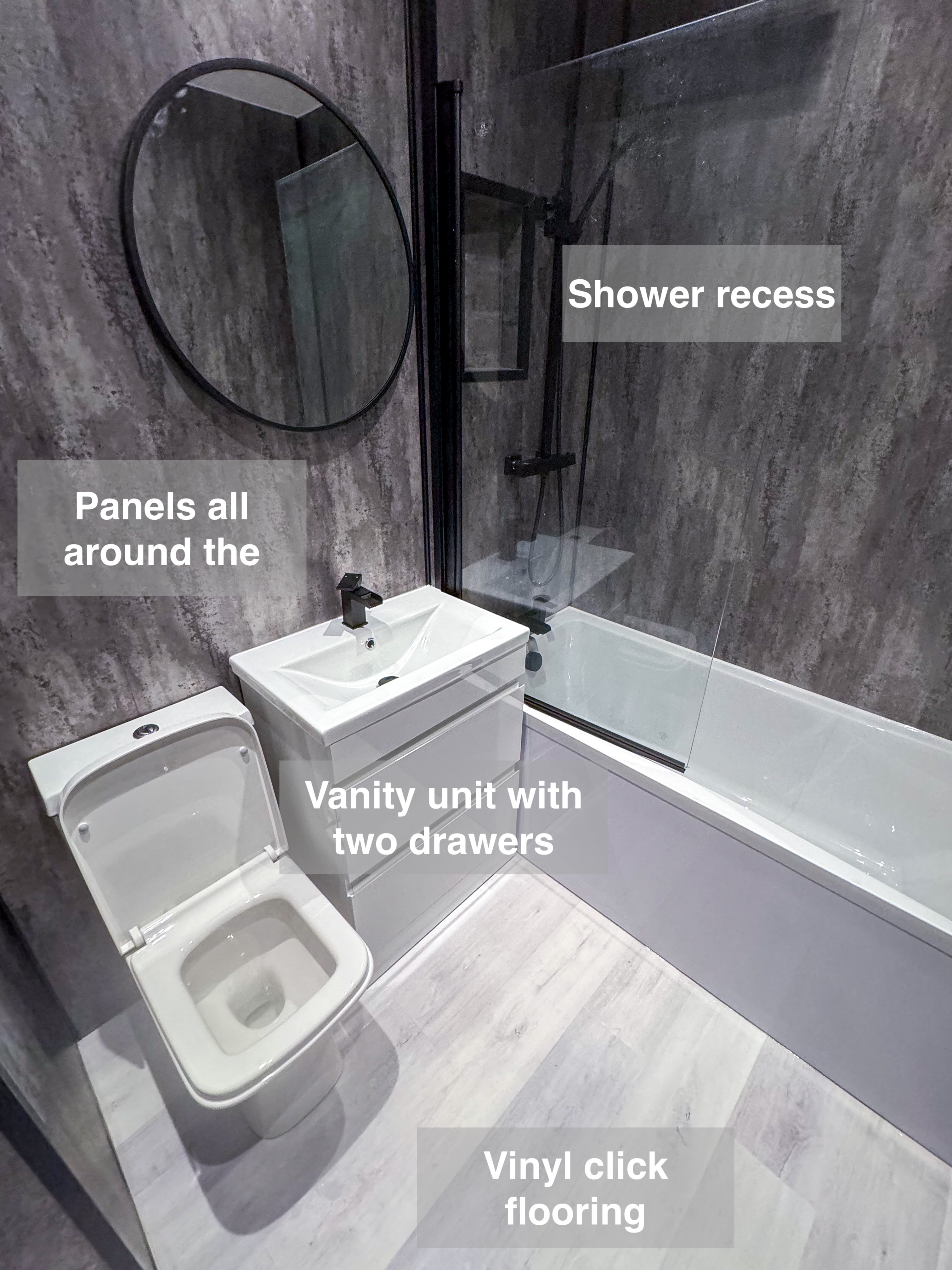 Bathroom refurbishment with tiles effect panels. This is from the more expensive range of panels, which is more expensive than tiles, with a tile effect…
