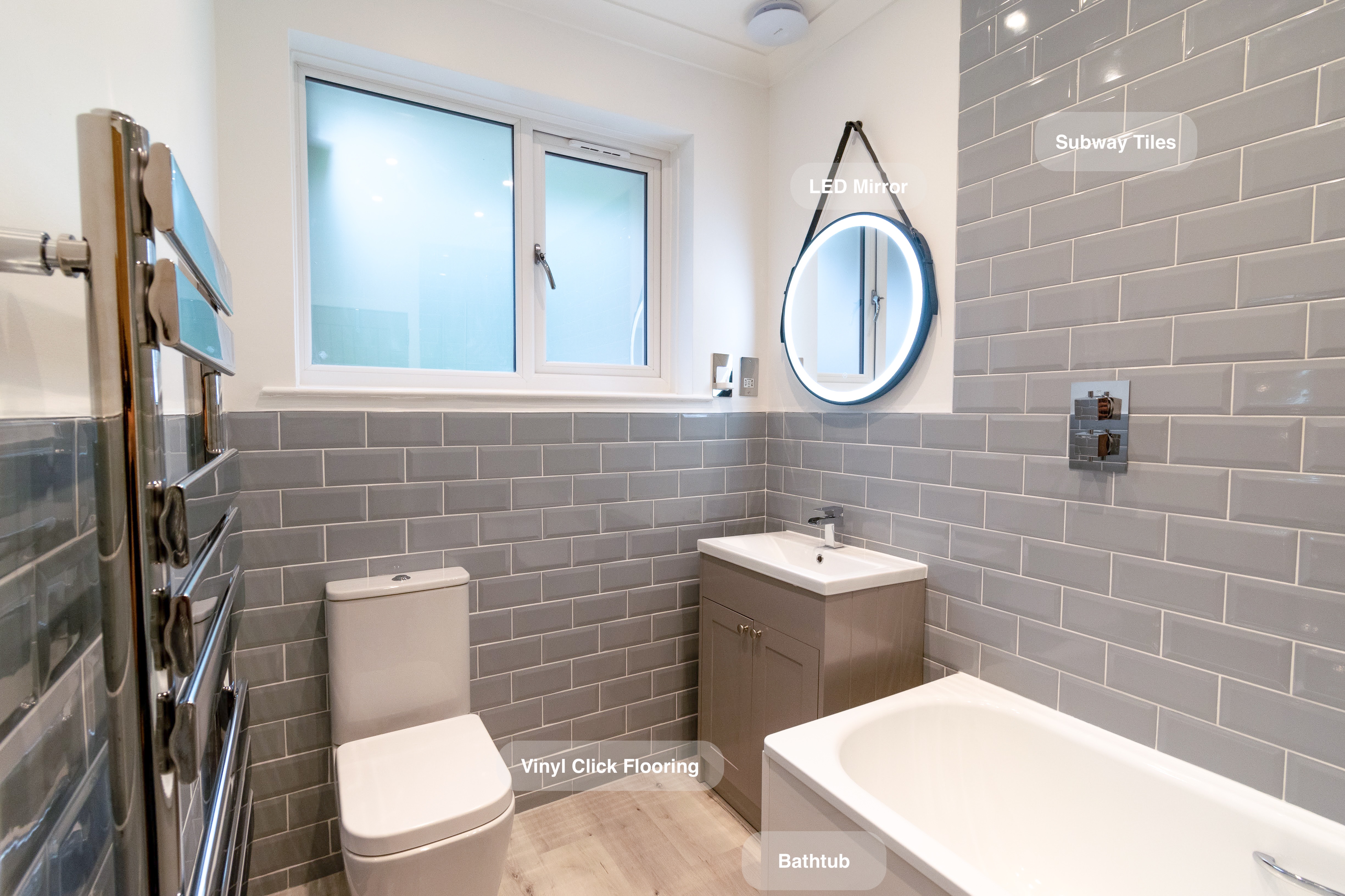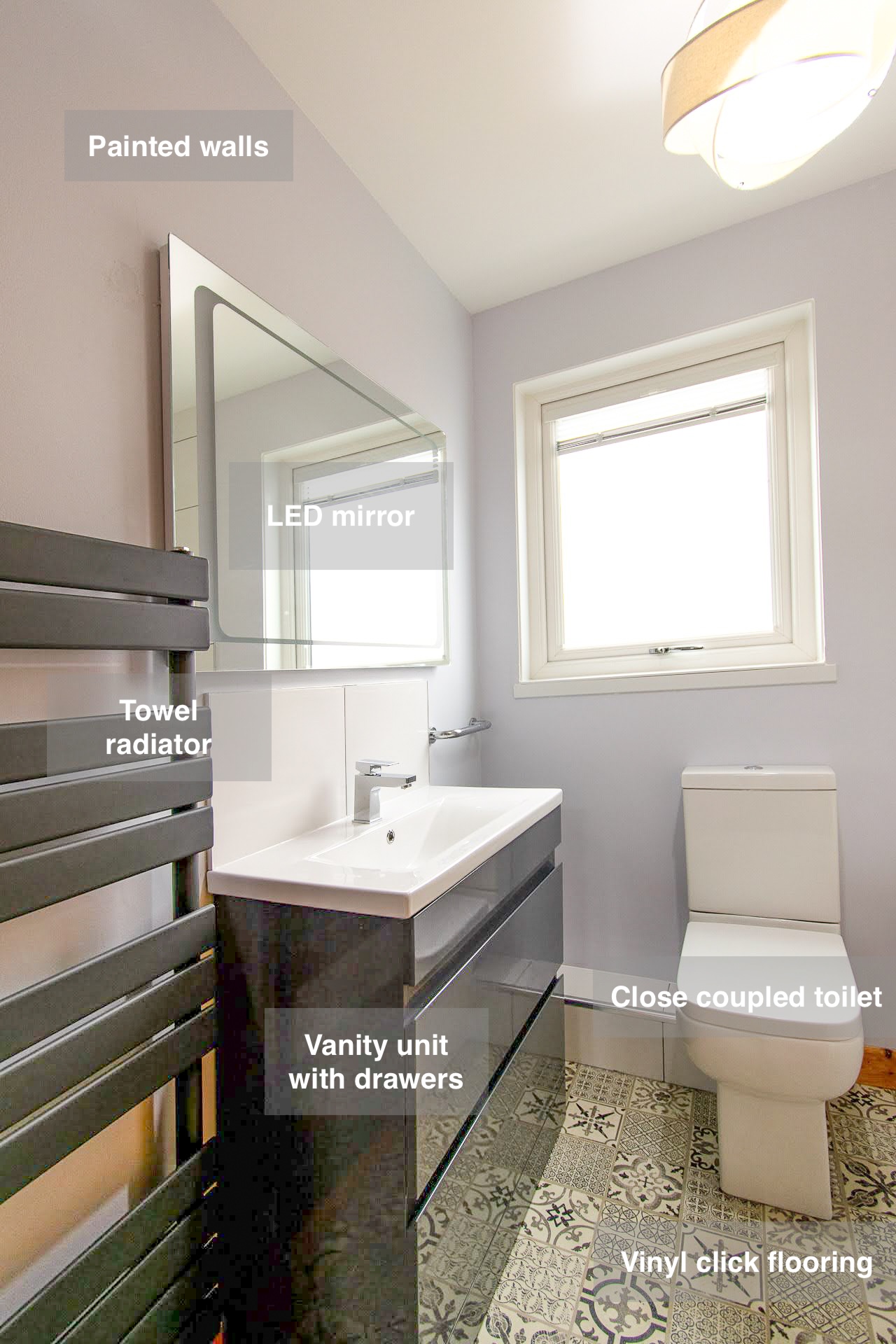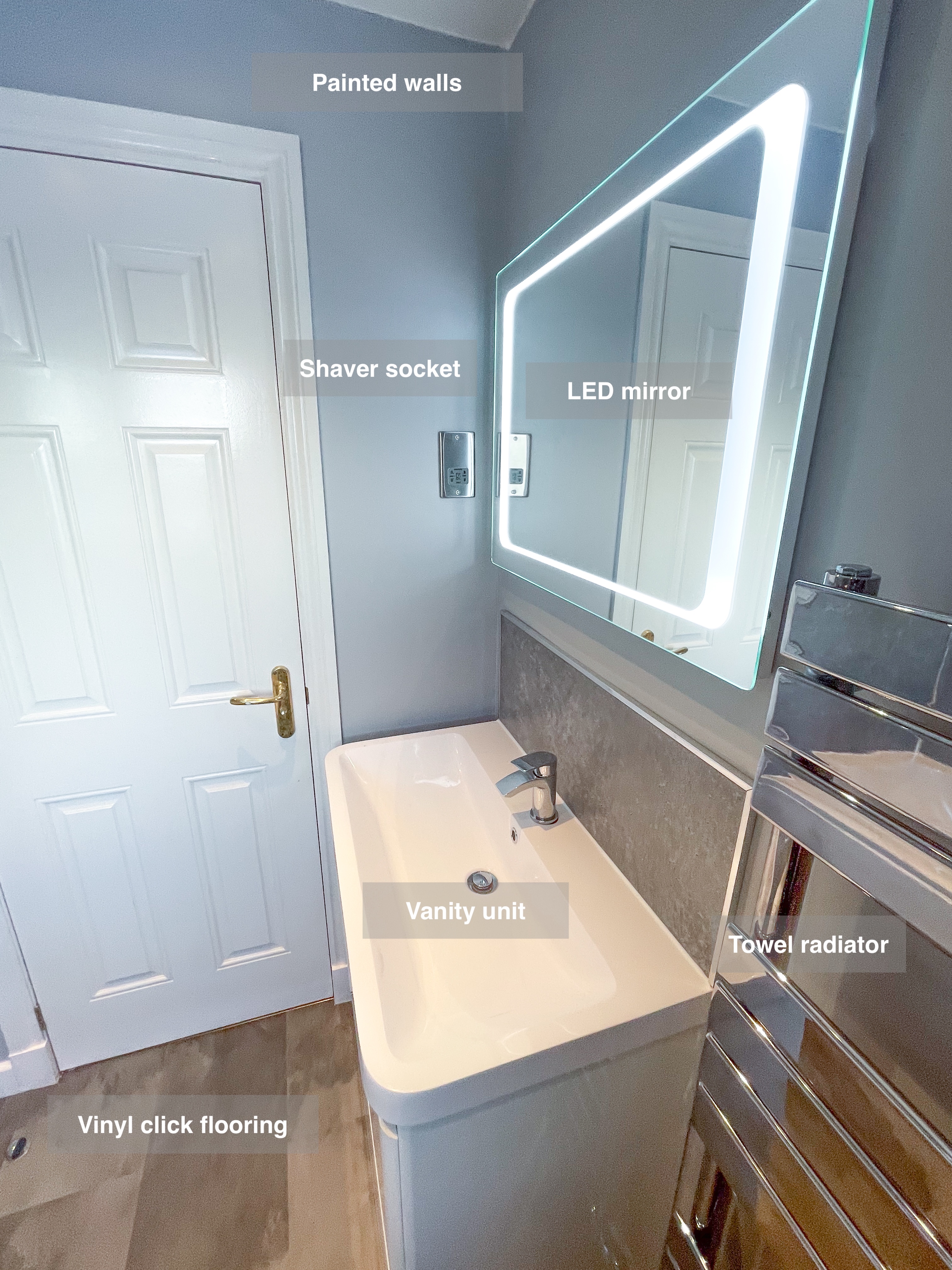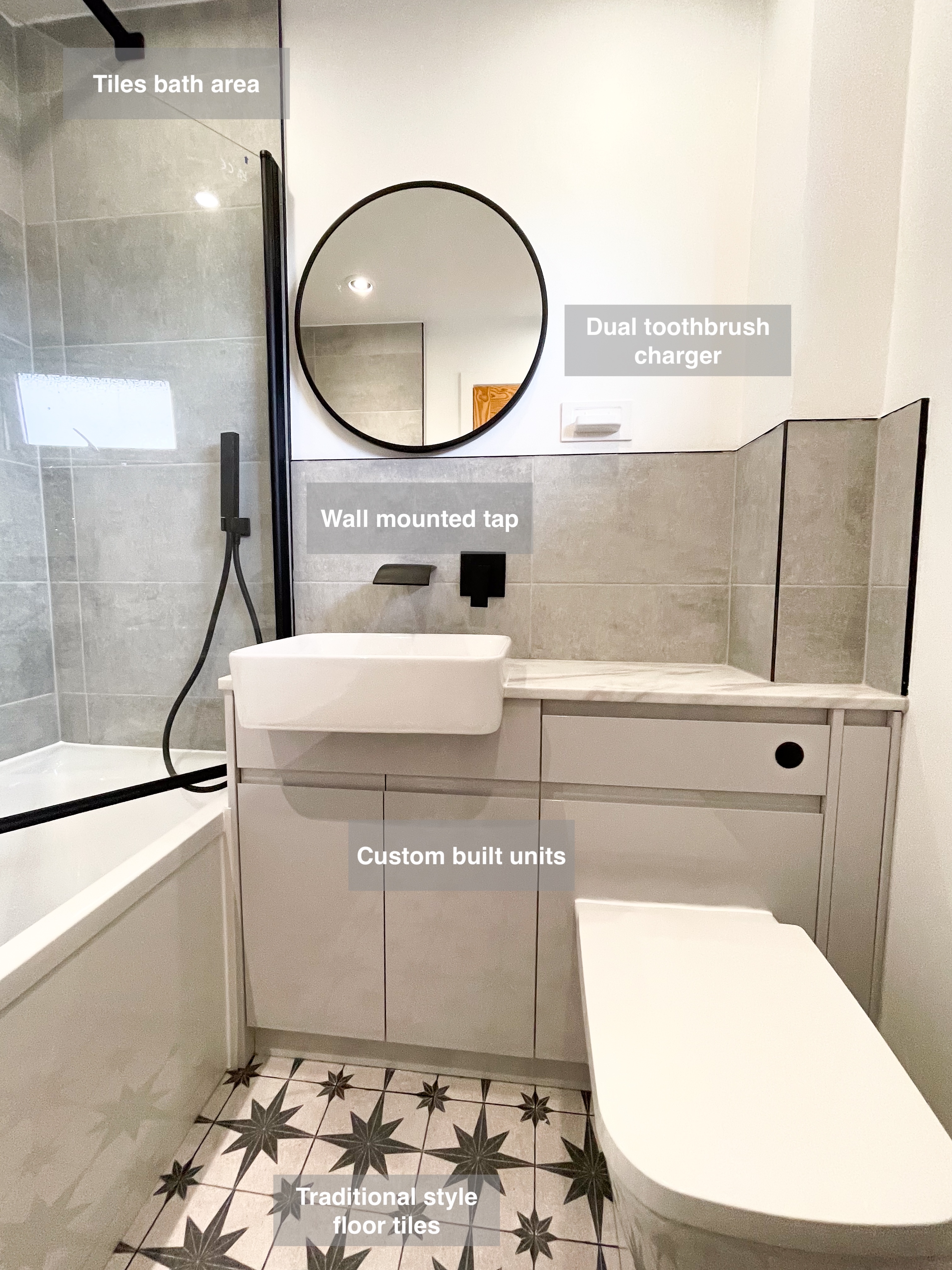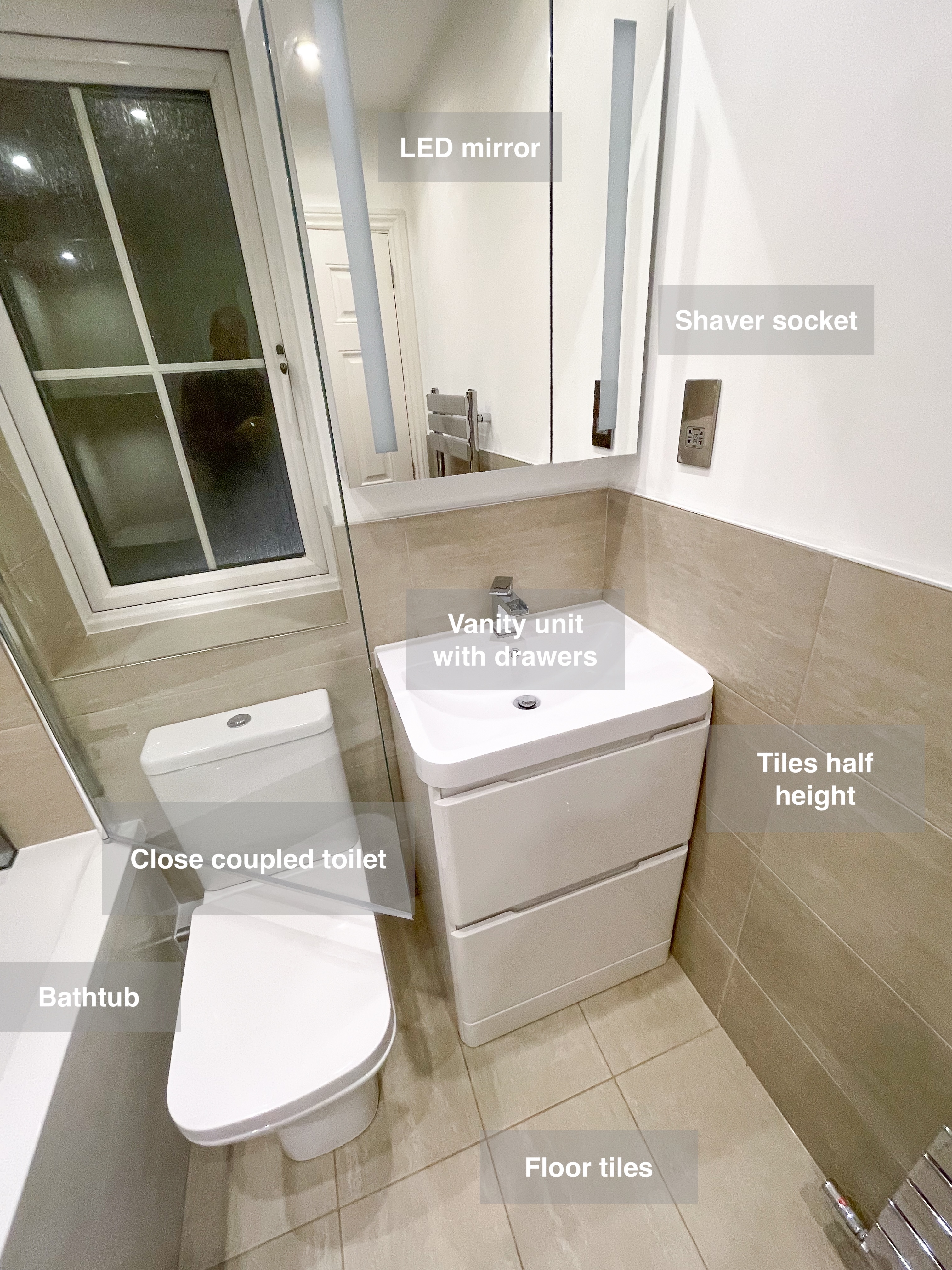 Full refurbishment with tiles all around the room, shower enclosure, wall mounted vanity unit. 3D Scan https://www.youtube.com/watch?v=5LxkD4HsDII