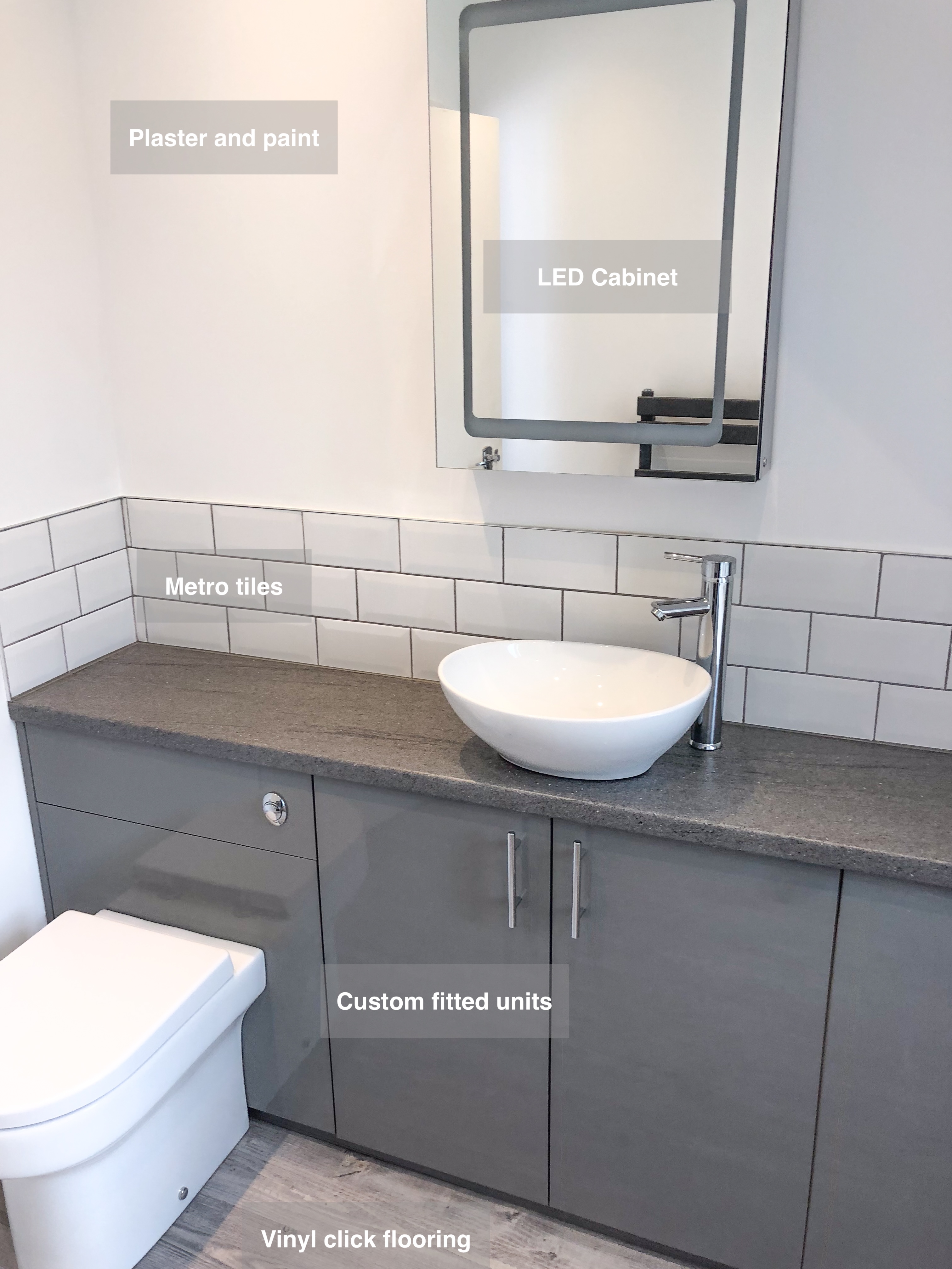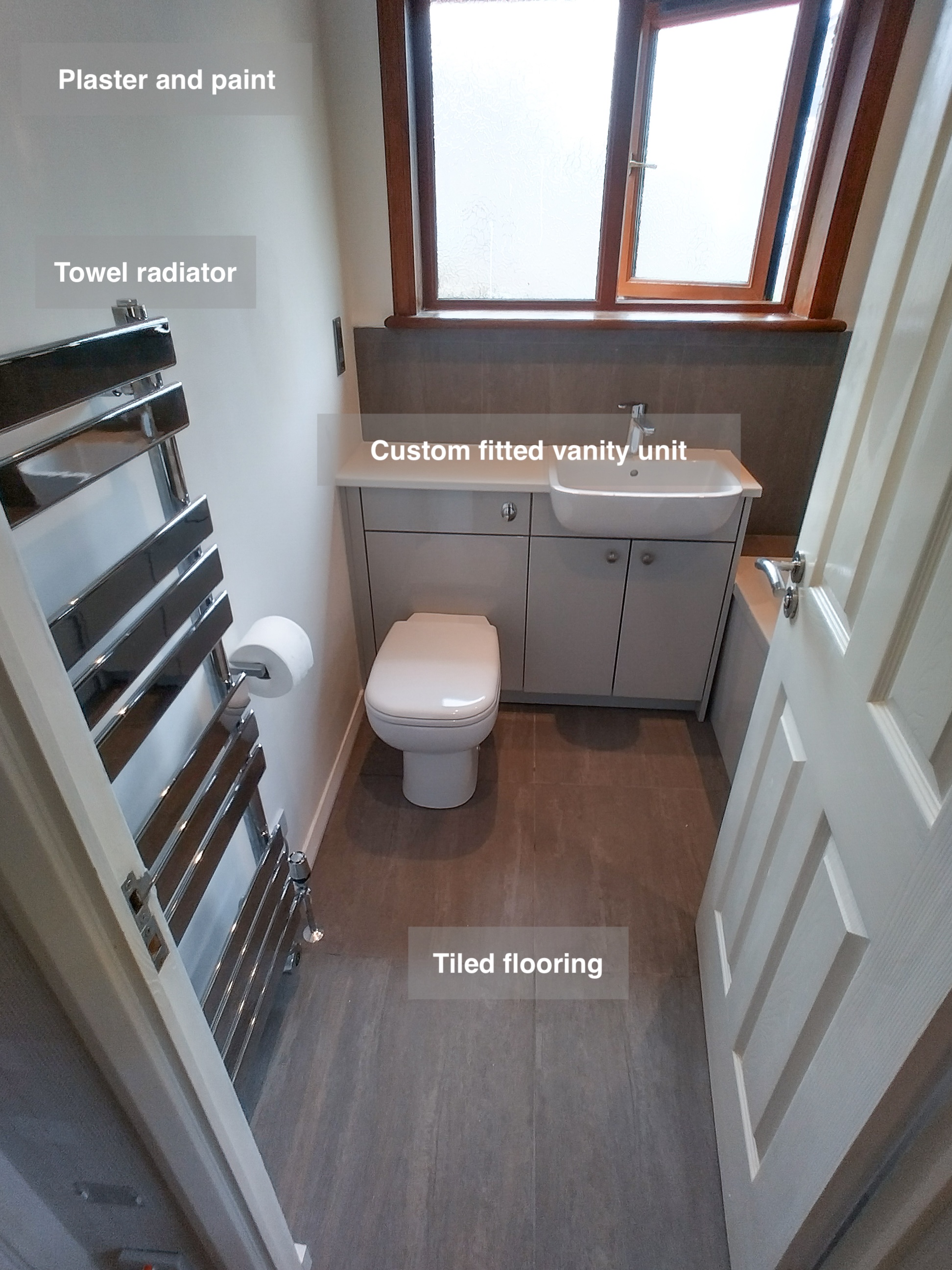 Simple bathroom refurbishment, keeping the layout similar to before. Custom fit units, towel radiator (with dual fuel conversion), some tiling and plaster and paint the…