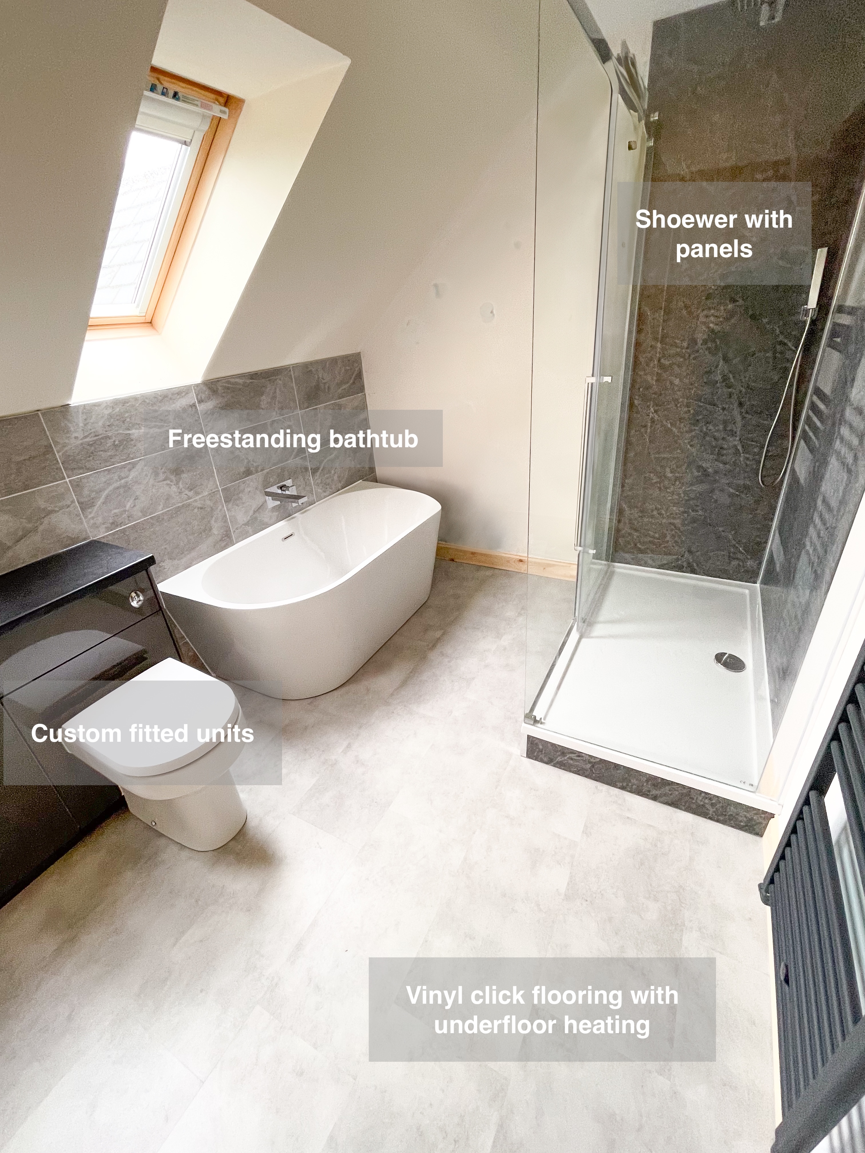 Complete bathroom reconfiguration featuring tiled flooring with underfloor heating. Includes a walk-in shower with recessed shelving at one end, a freestanding bathtub with a wall-mounted…