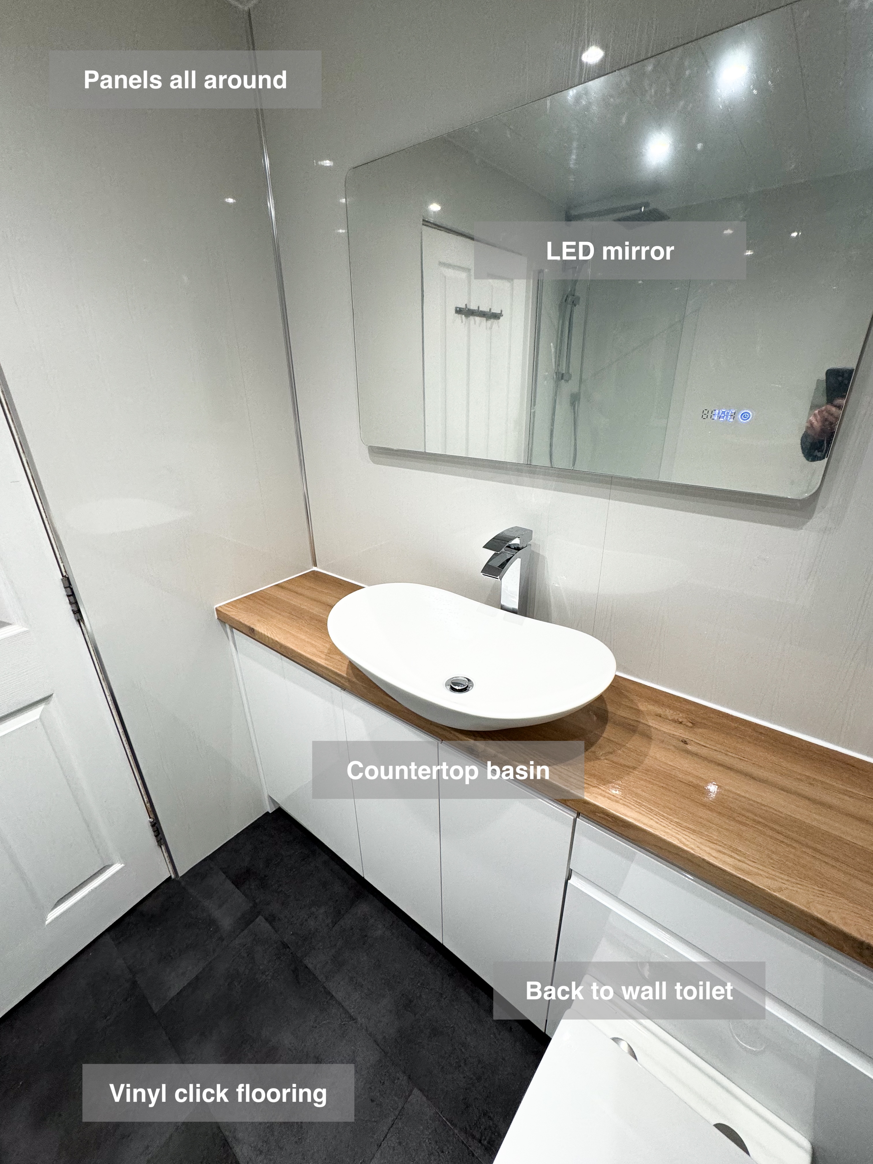 A complete bathroom refurbishment featuring fully waterproof units and panels throughout, with specialised panels in the bath area. The room has tiled flooring, and an…