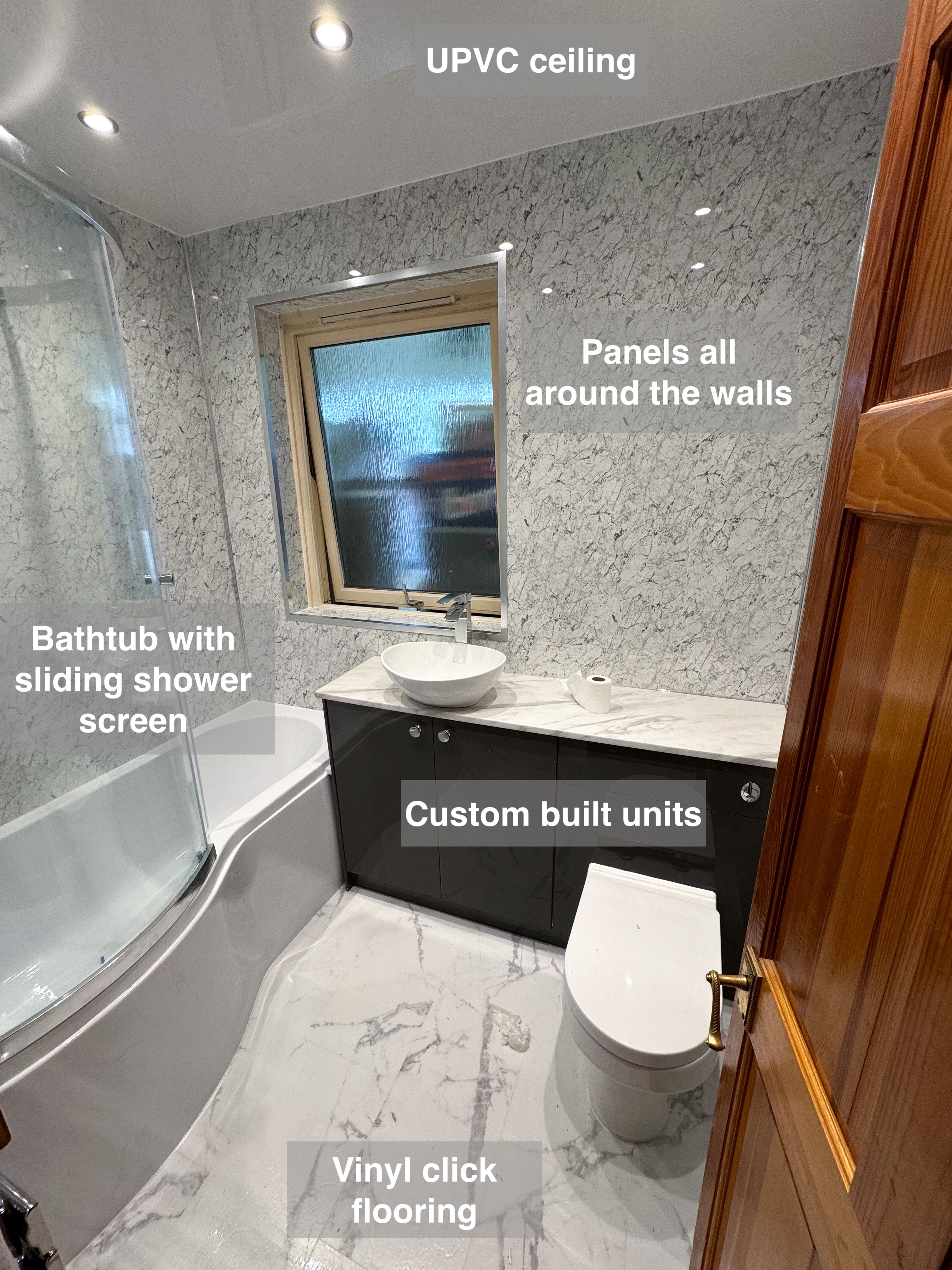 Full bathroom refurbishment with panels all around, vinyl click flooring, custom built units, P shaped bathtub, electric shower, towel radiator, UPVC ceiling, new window. https://youtube.com/shorts/yGkrFVTG9F8