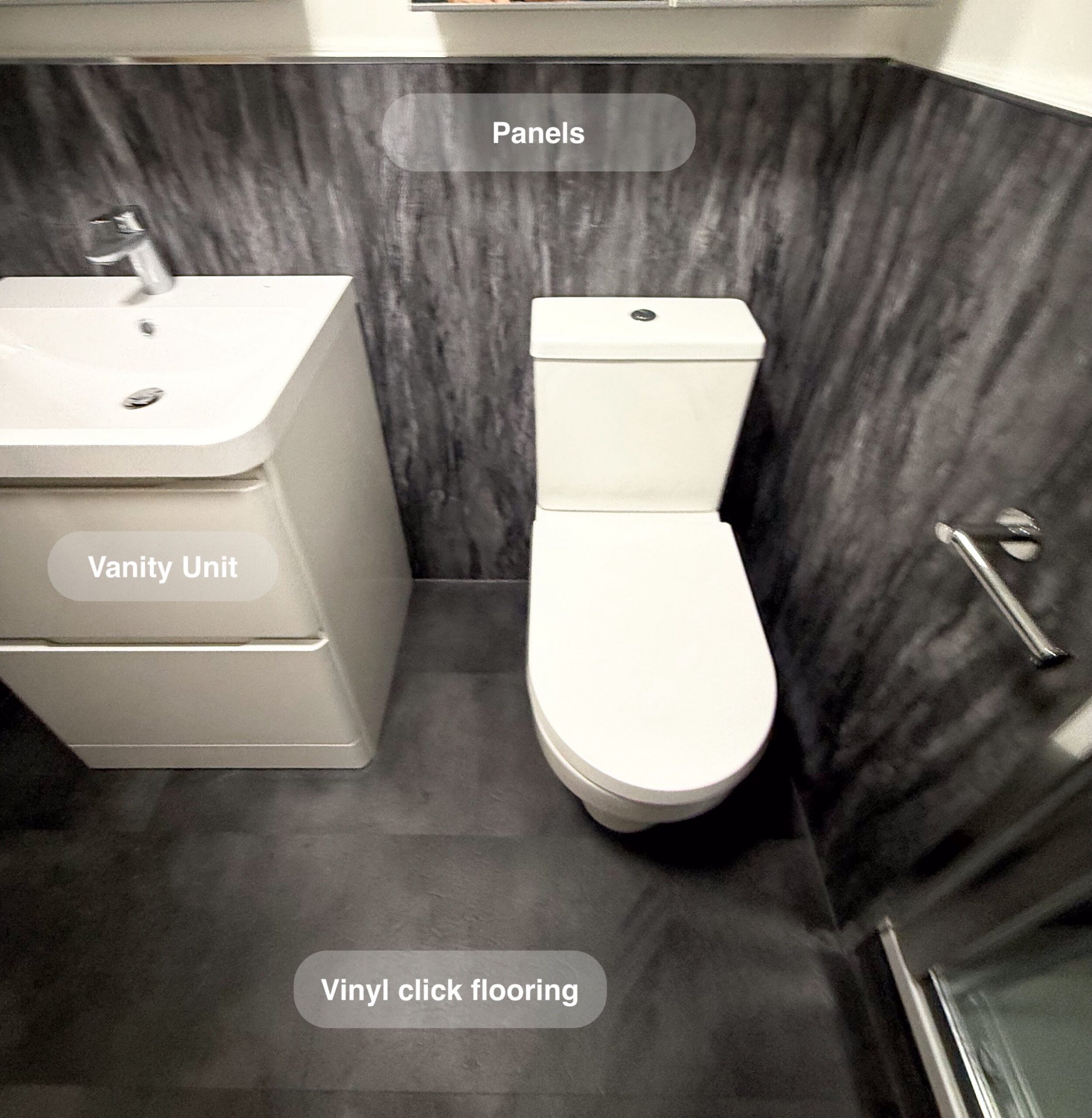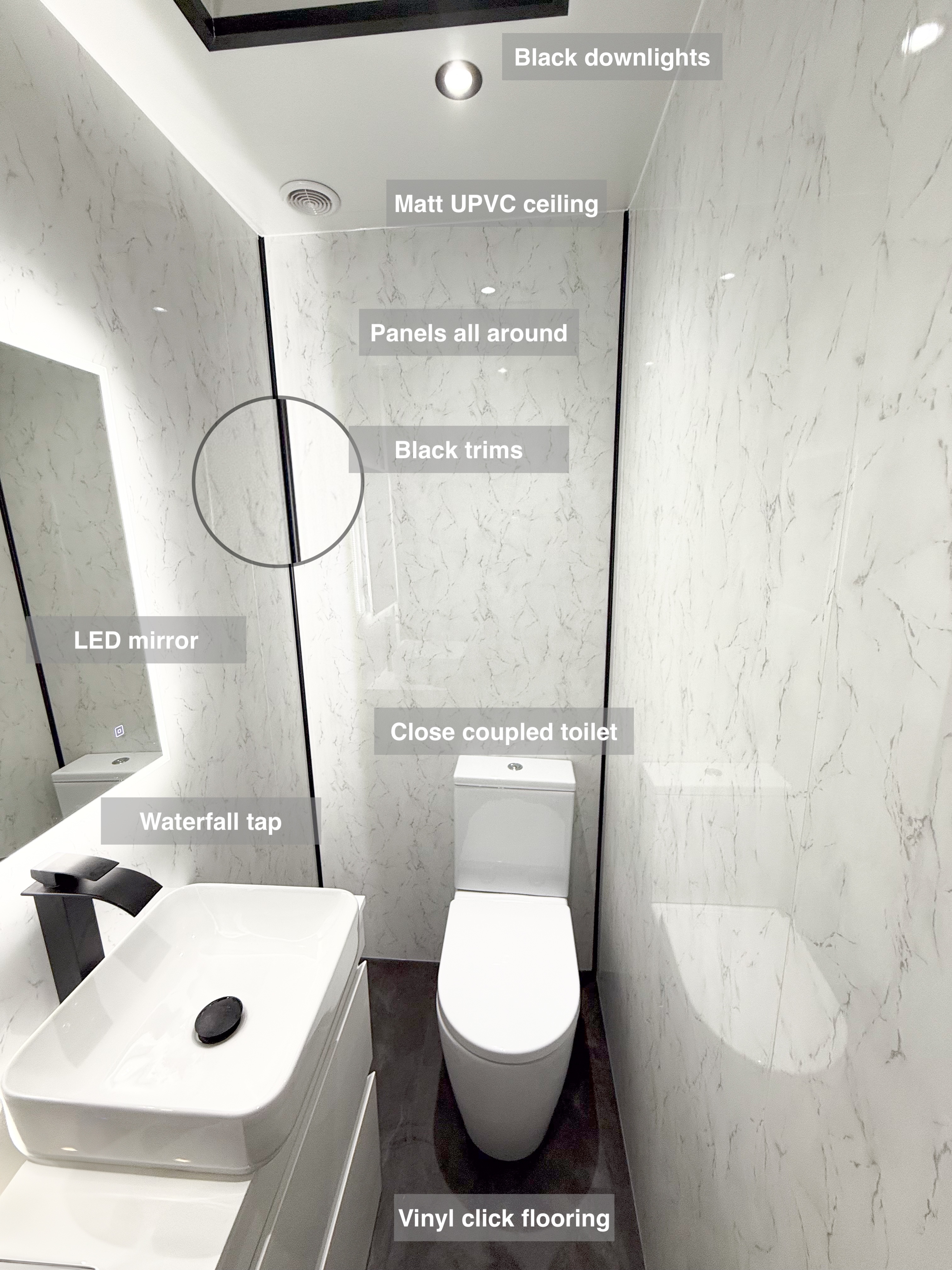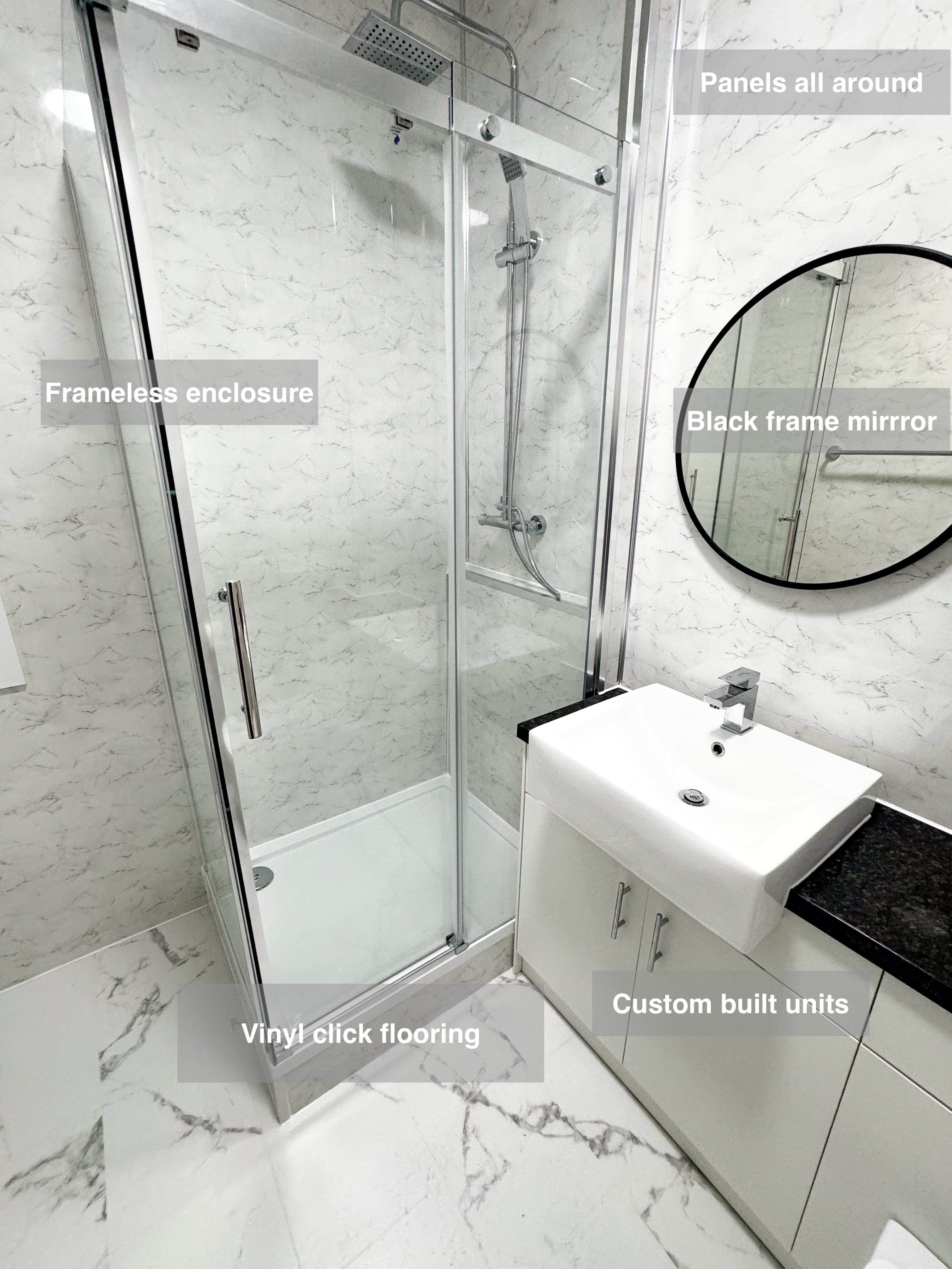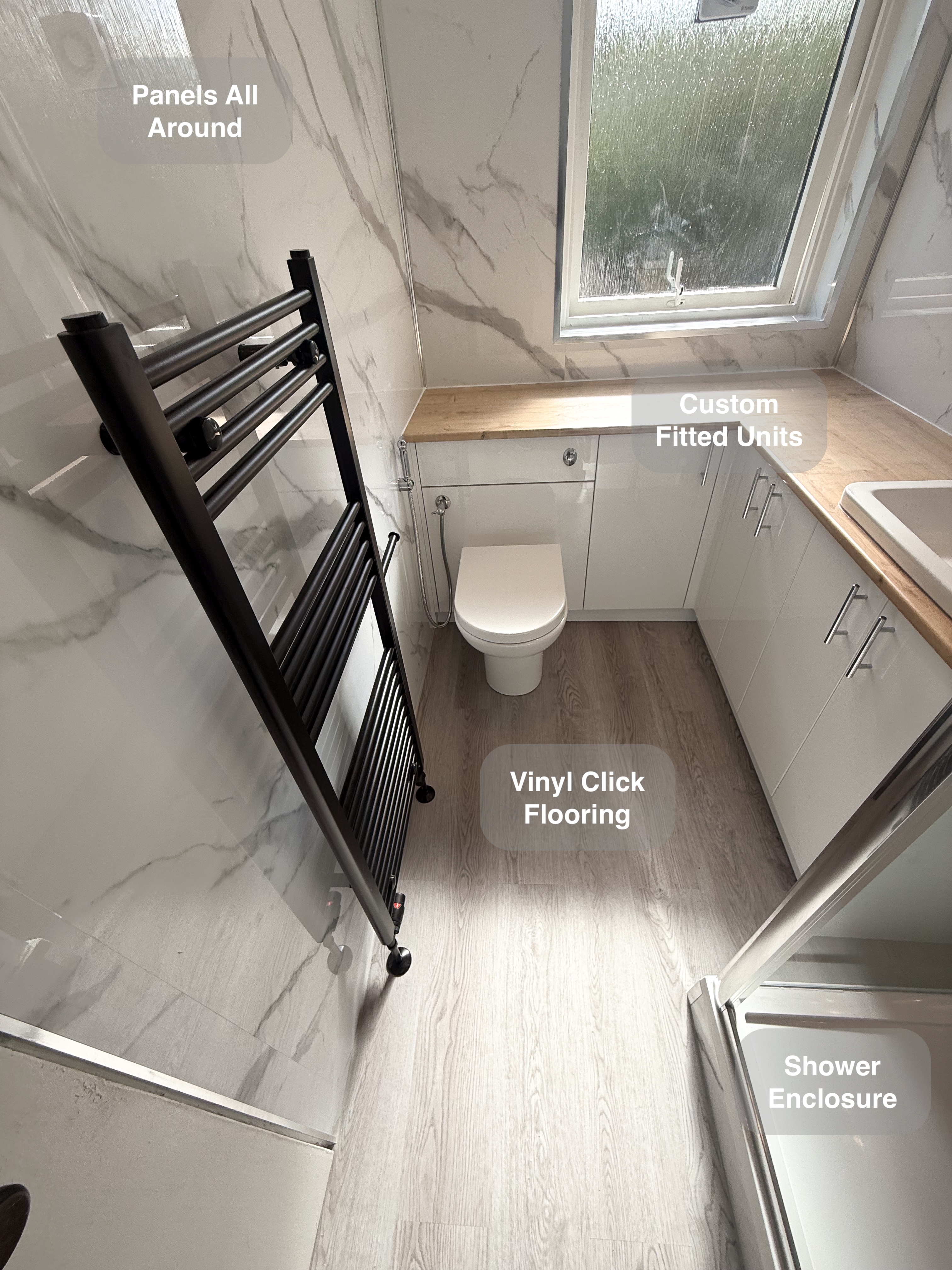 Modern & Practical Ensuite Transformation This full ensuite refurbishment combines style with functionality. Carrara marble effect wall panels create an elegant, easy-to-clean surface, while the dark slate vinyl flooring adds durability and slip resistance. A black electric towel radiator ensures cosy, warm towels, and sleek black bifold shower doors save space. The dual thermostatic…