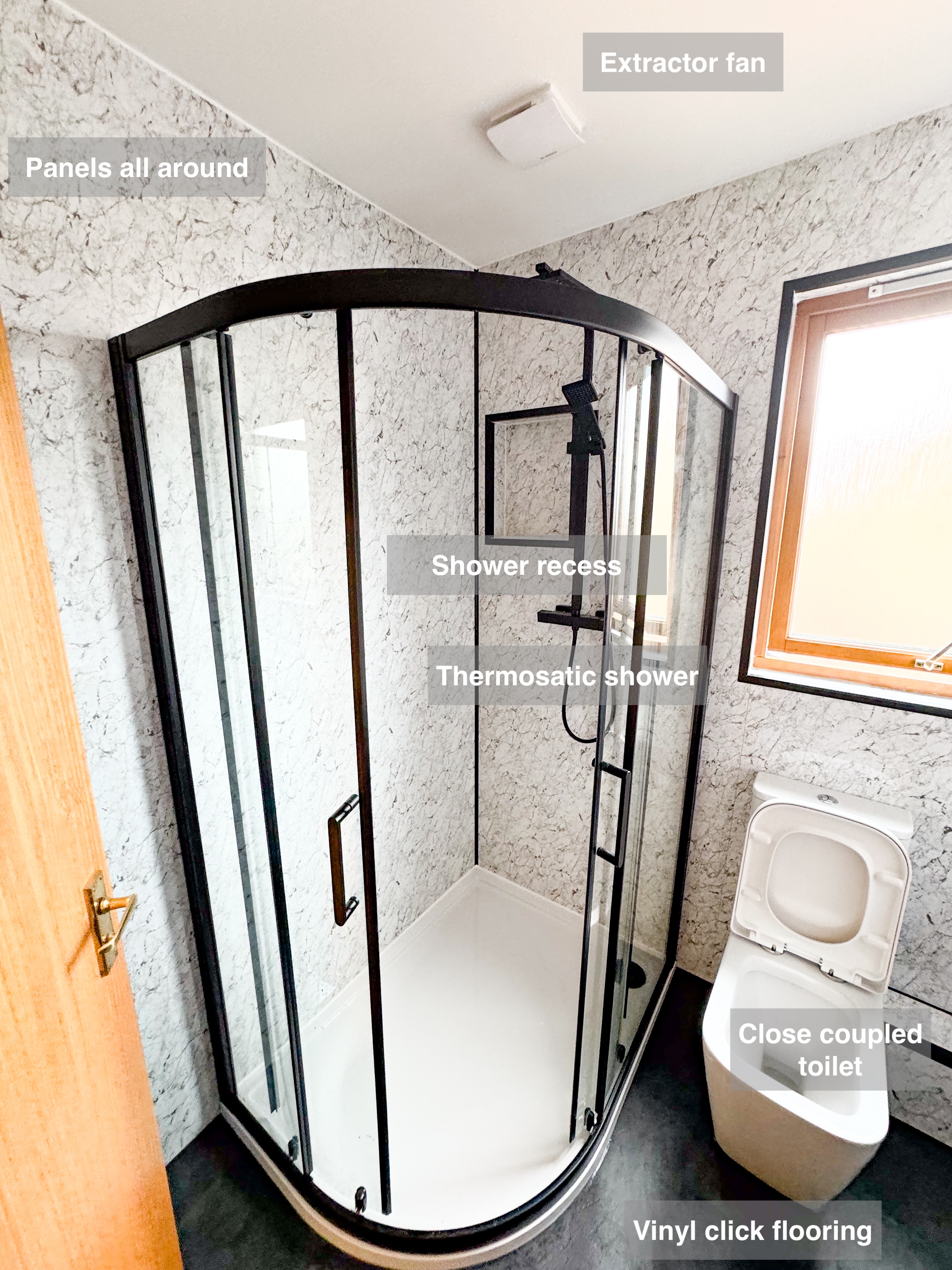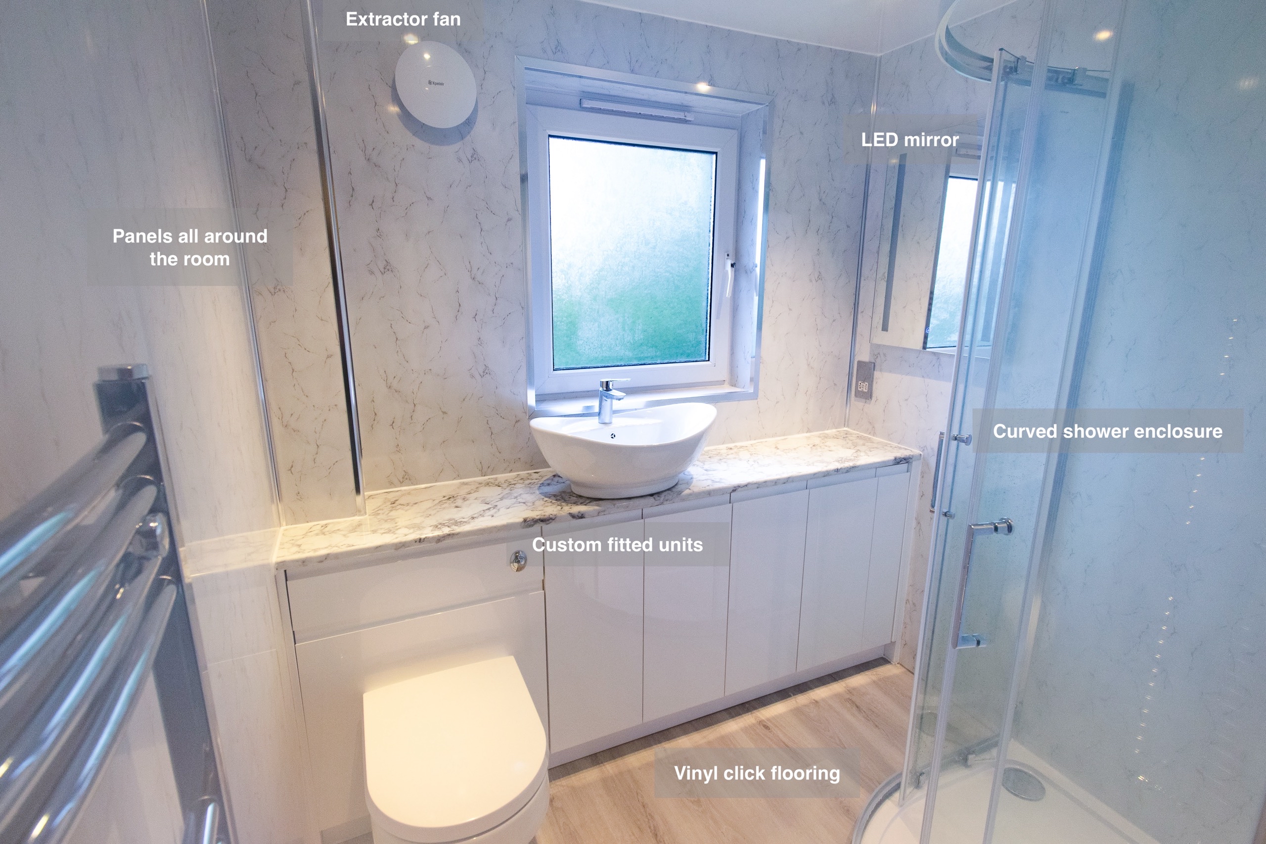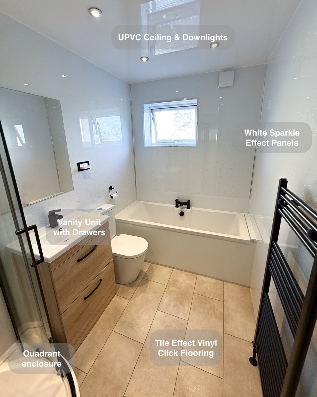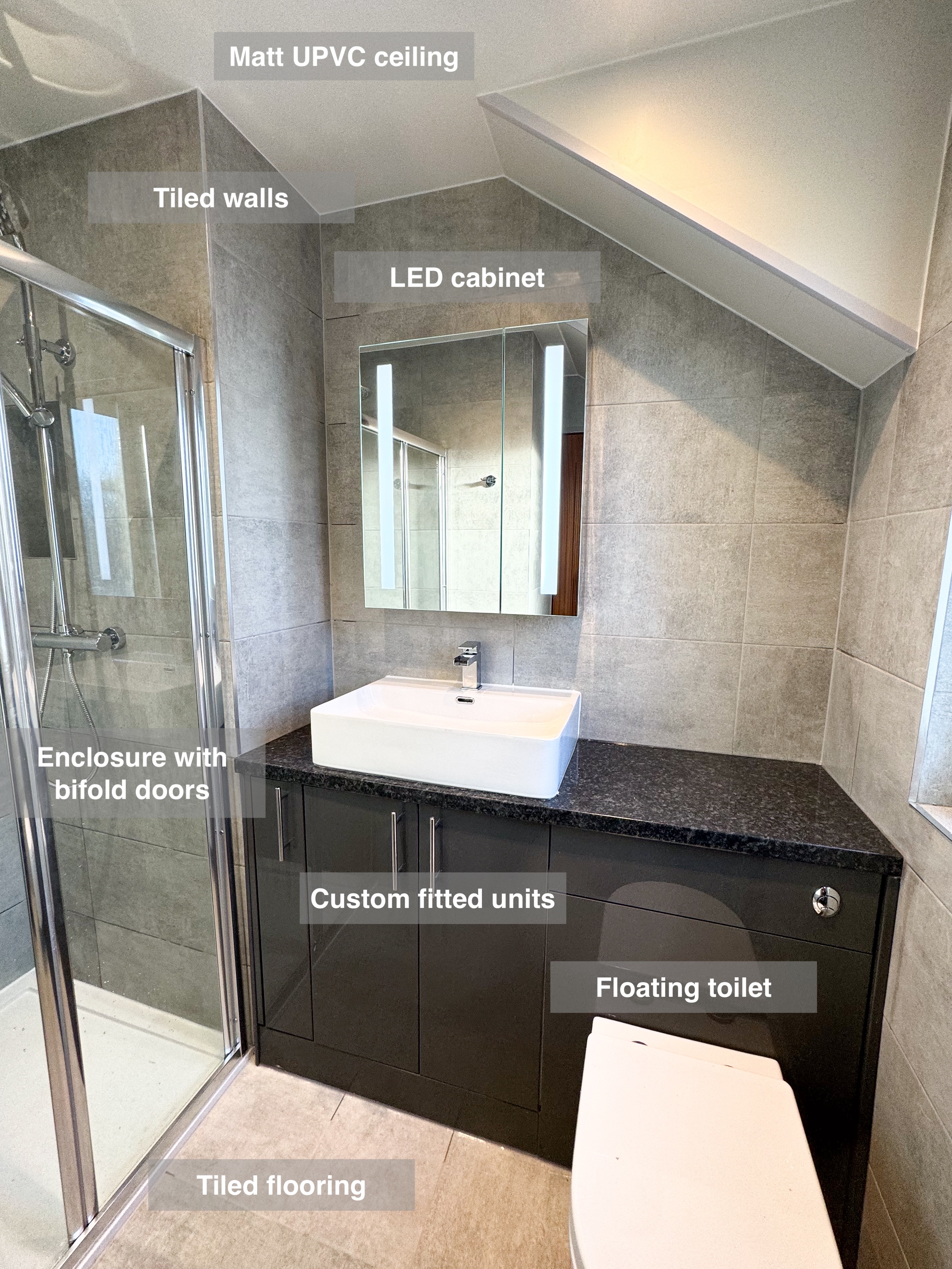 Modern & Practical Ensuite Transformation This full ensuite refurbishment combines style with functionality. Carrara marble effect wall panels create an elegant, easy-to-clean surface, while the dark slate vinyl flooring adds durability and slip resistance. A black electric towel radiator ensures cosy, warm towels, and sleek black bifold shower doors save space. The dual thermostatic…