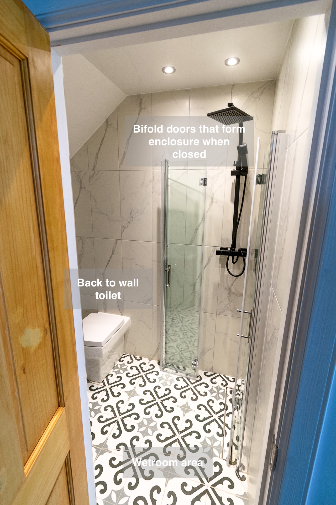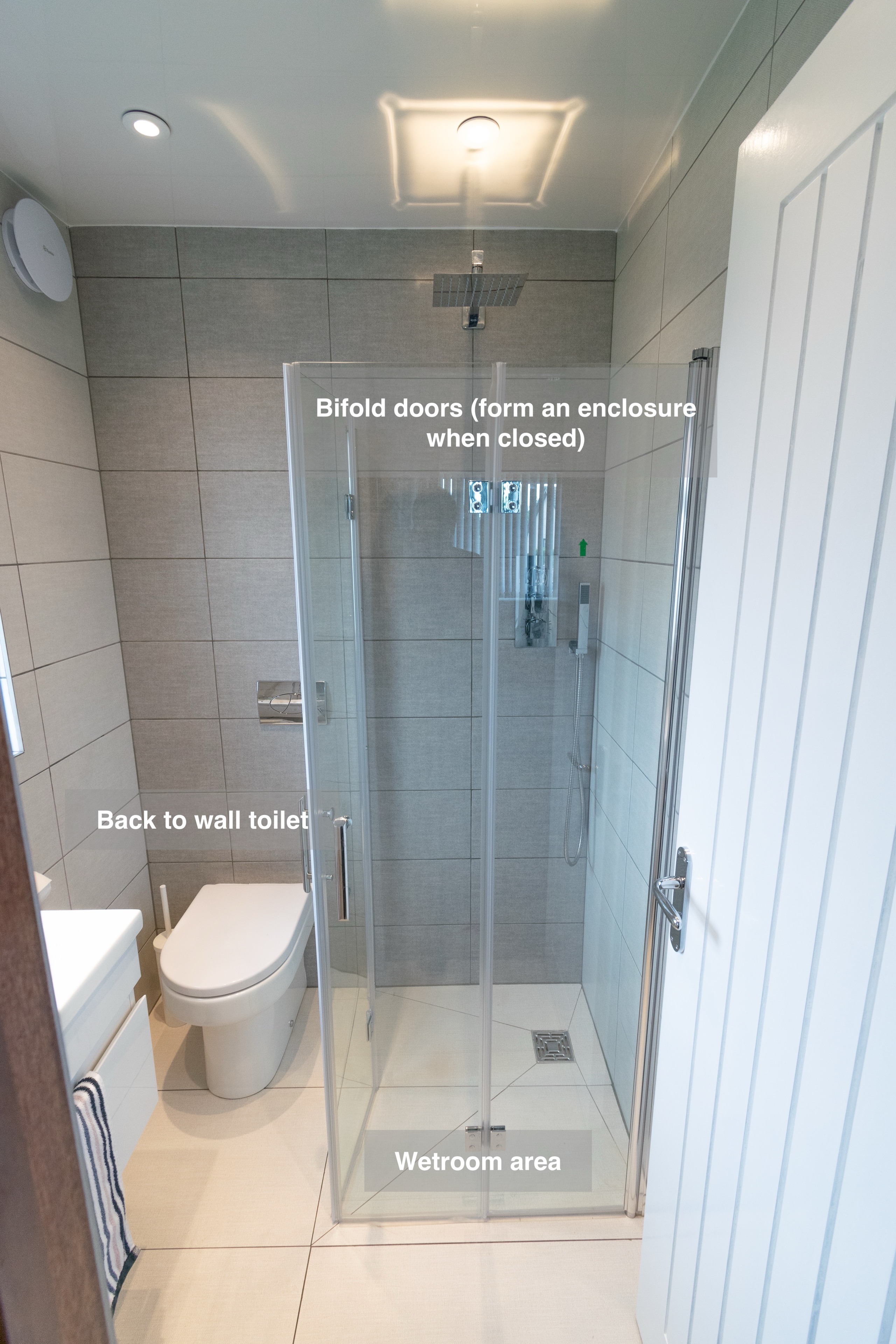 Small wetroom, with bifold shower doors forming an enclosure when closed. https://www.youtube.com/watch?v=X8uERWzkzWY