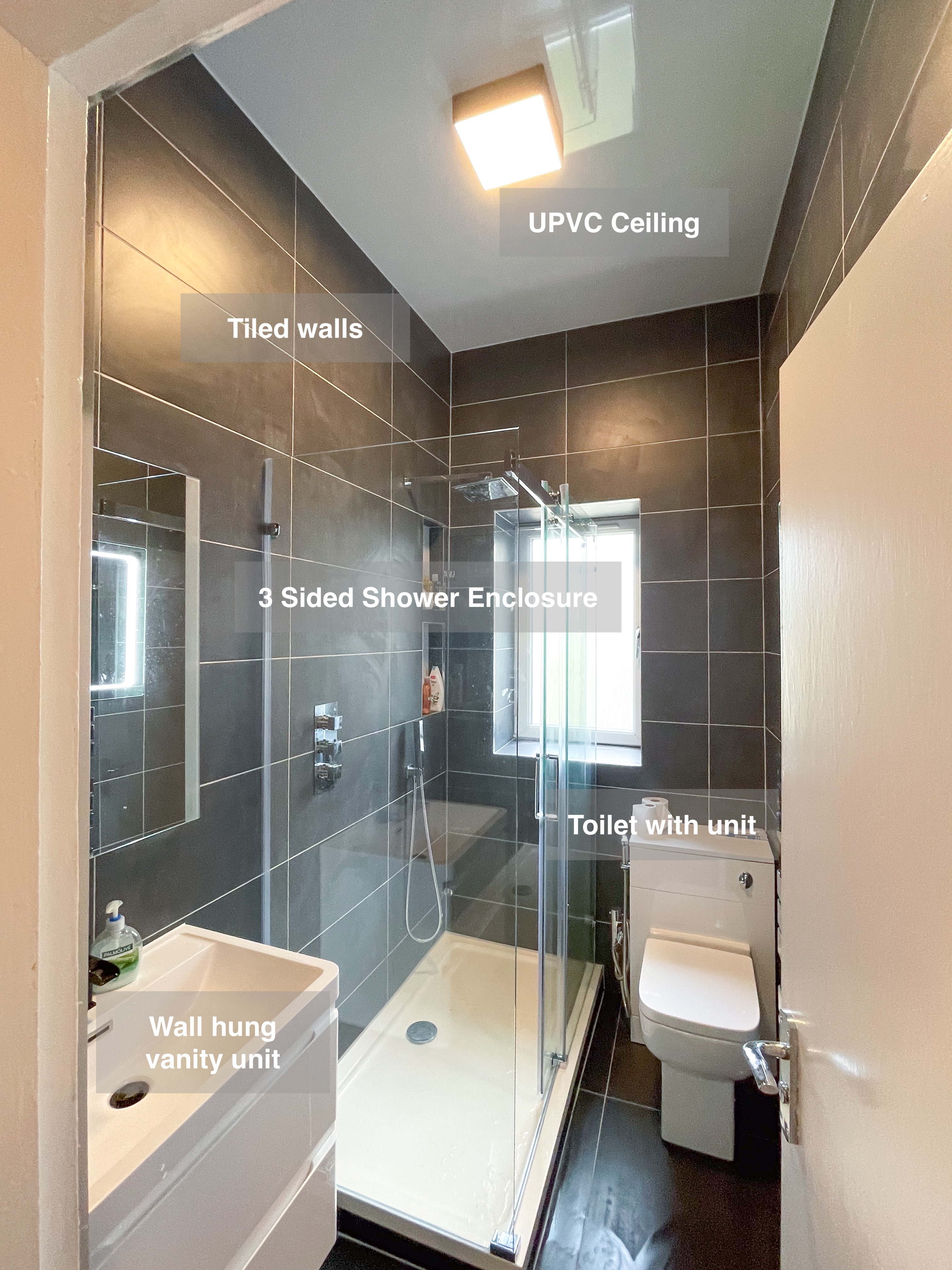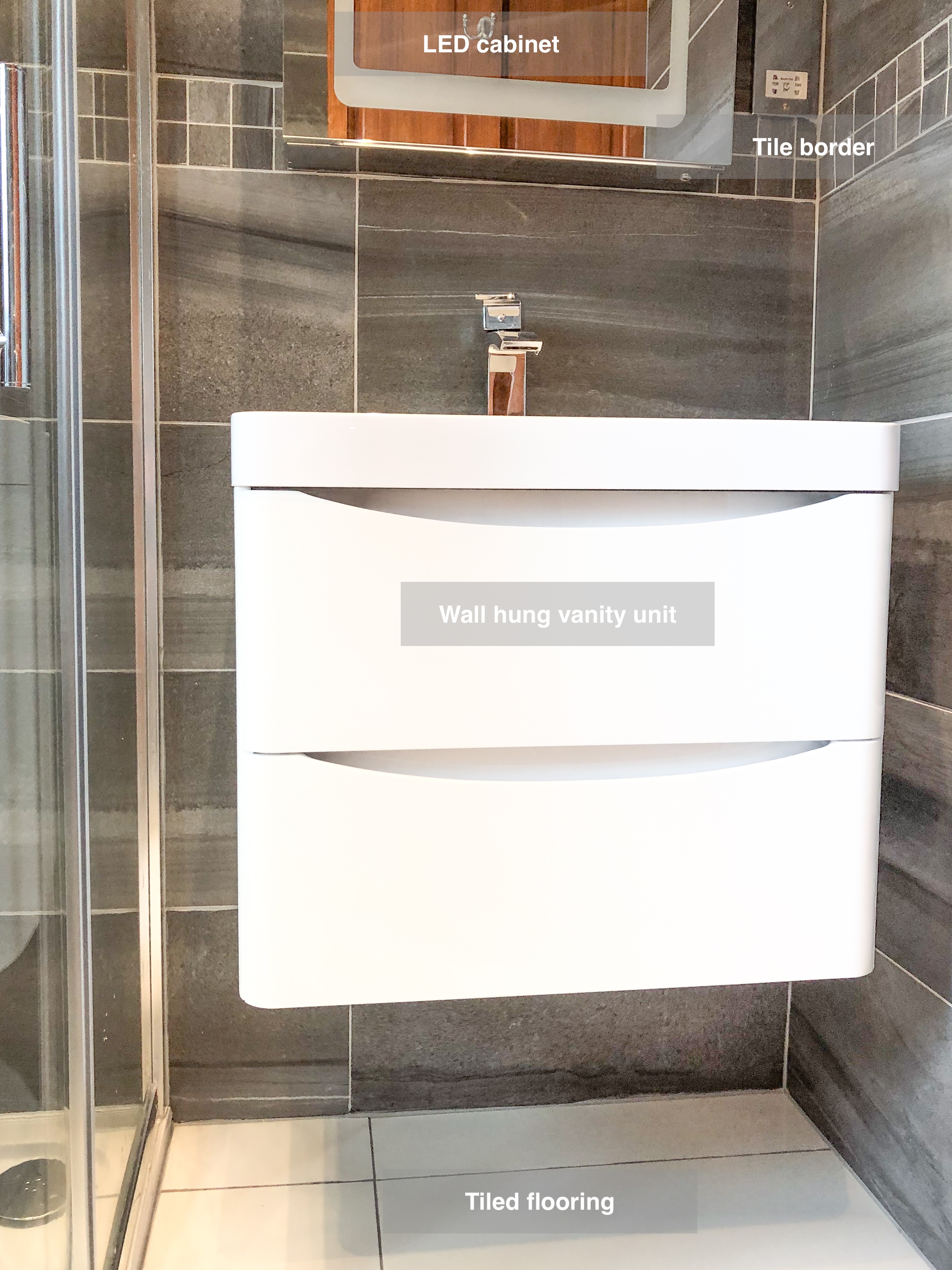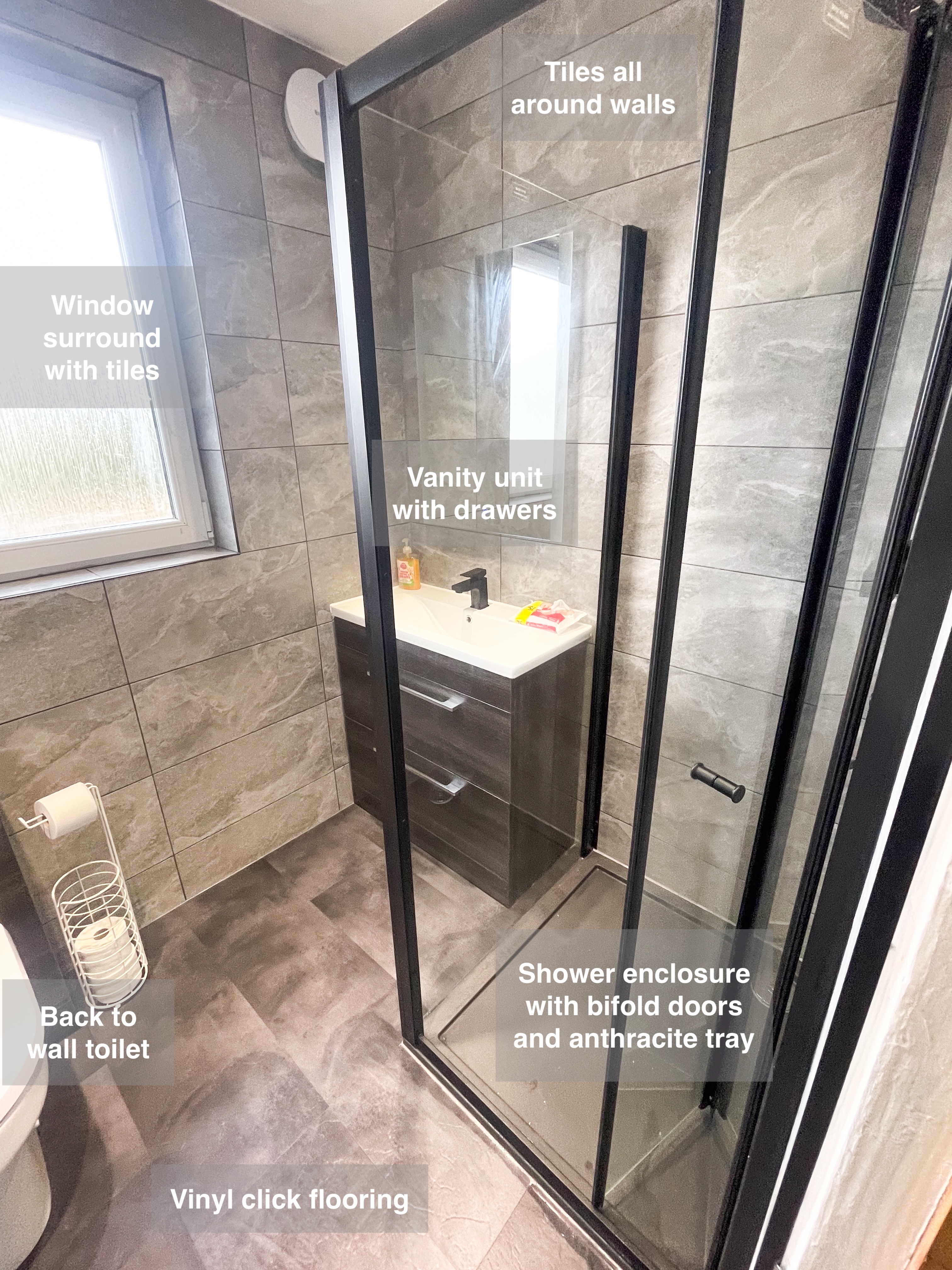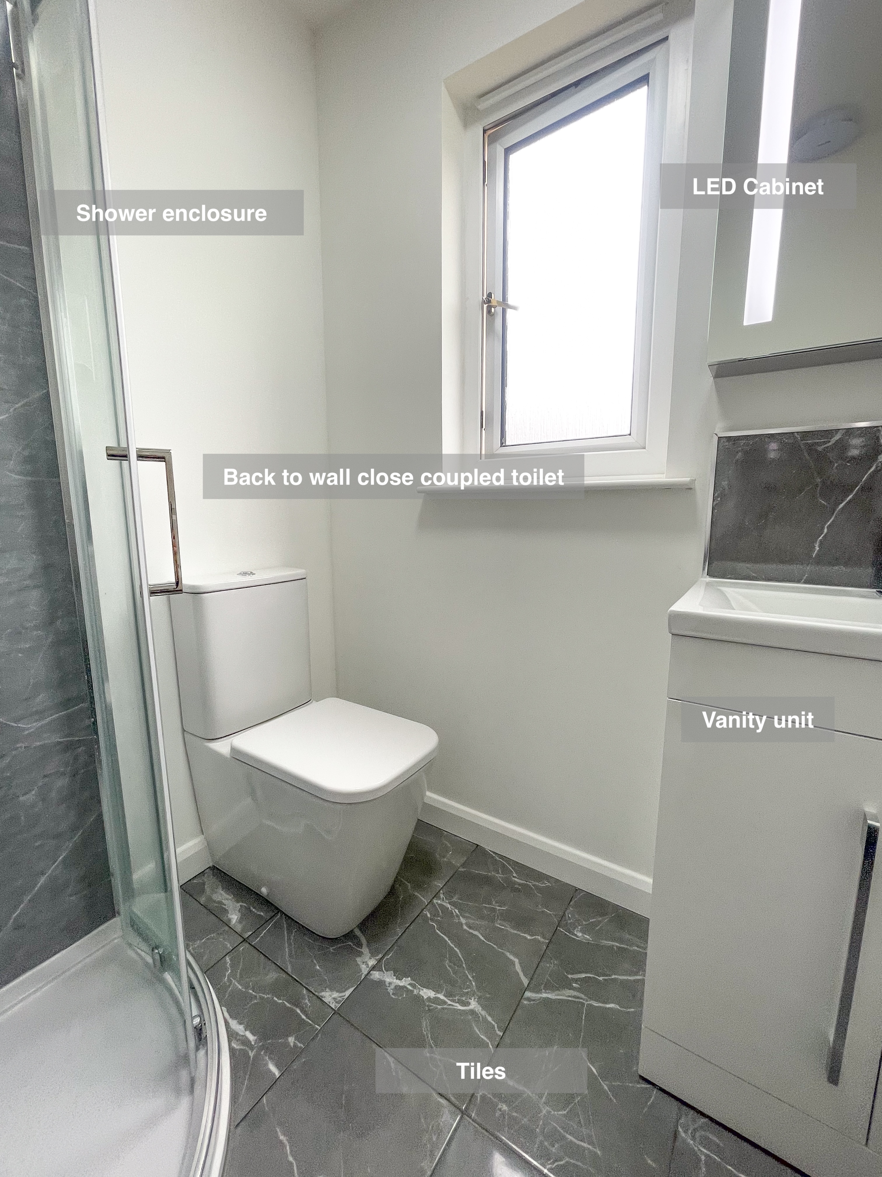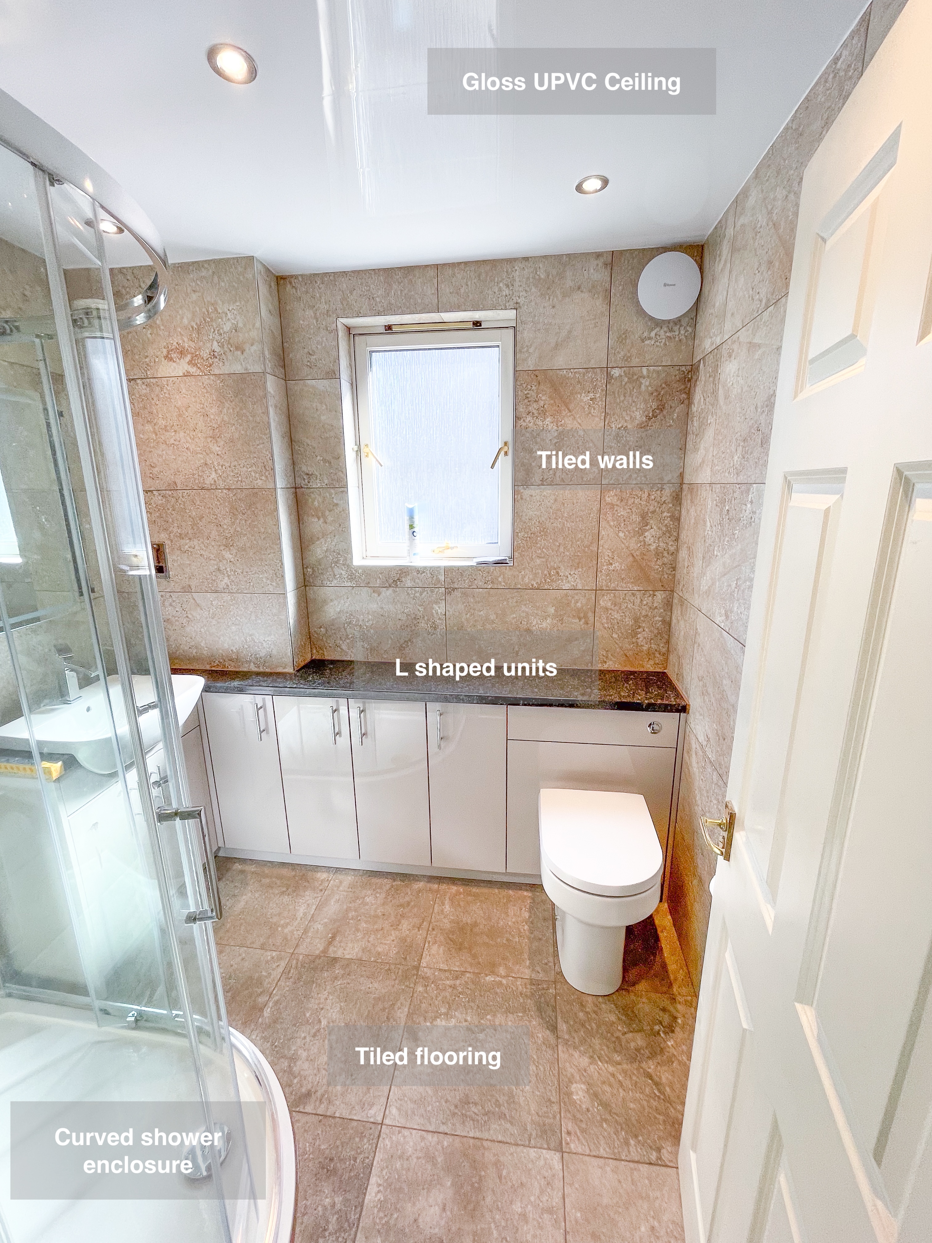 Full refurbishment with tiles all around the room, shower enclosure, wall mounted vanity unit. 3D Scan https://www.youtube.com/watch?v=5LxkD4HsDII