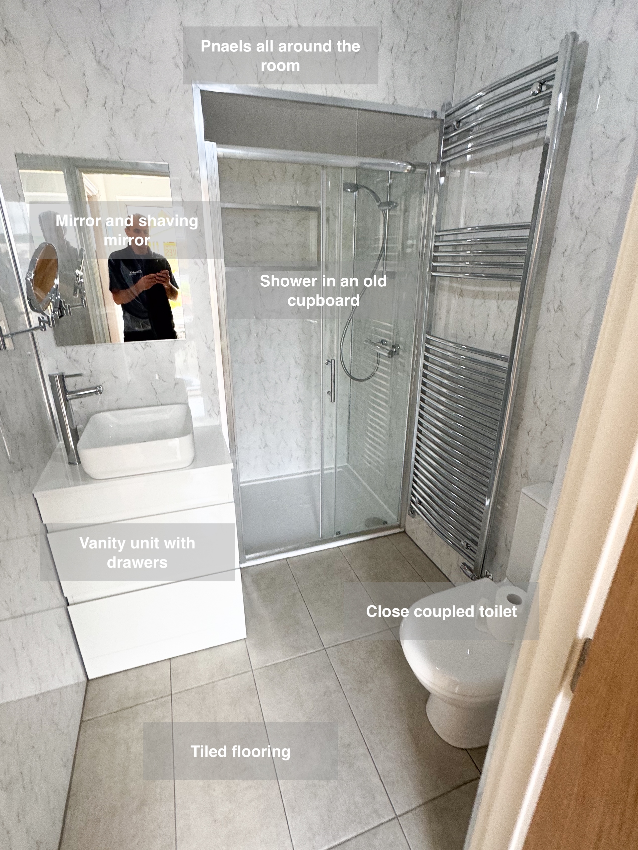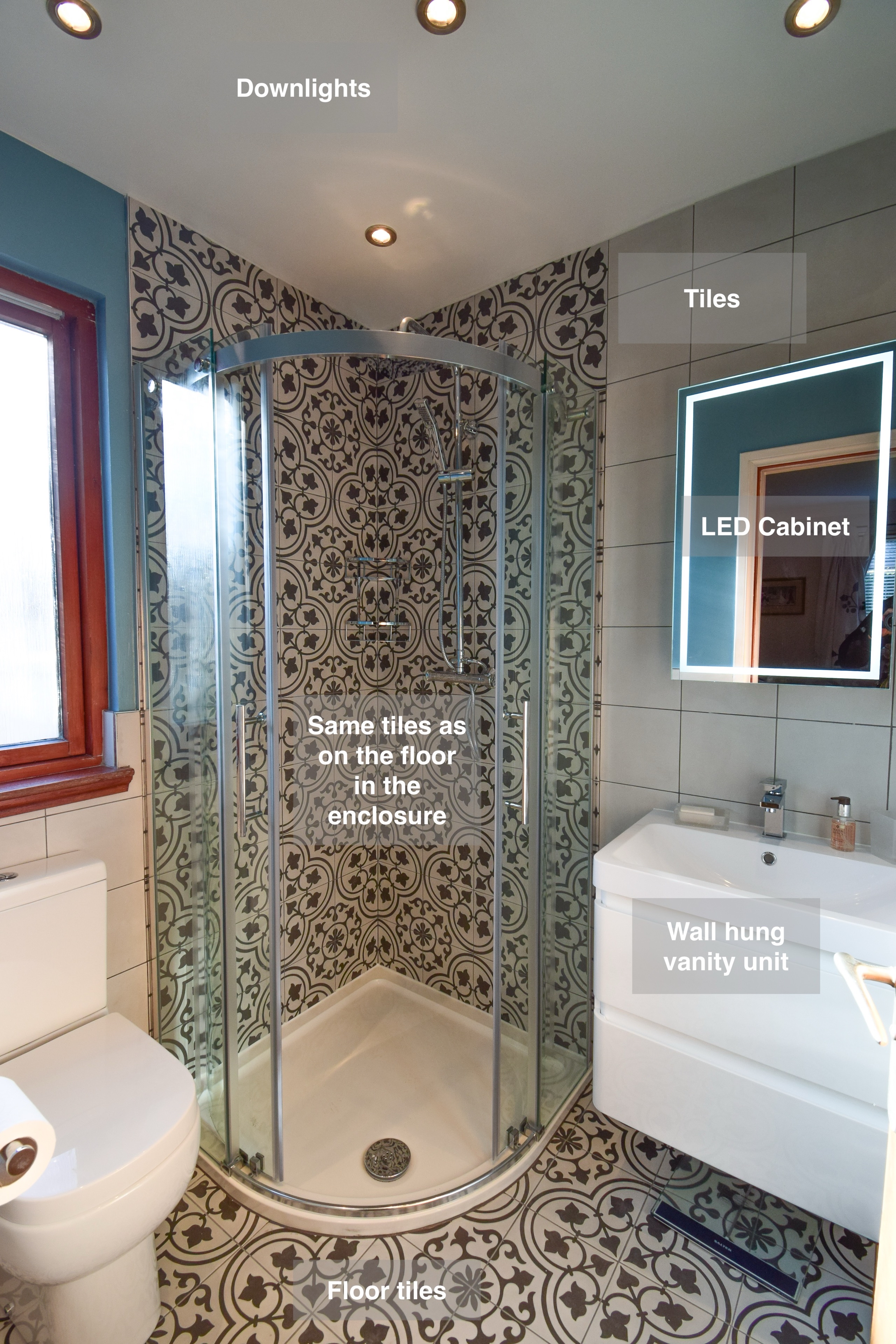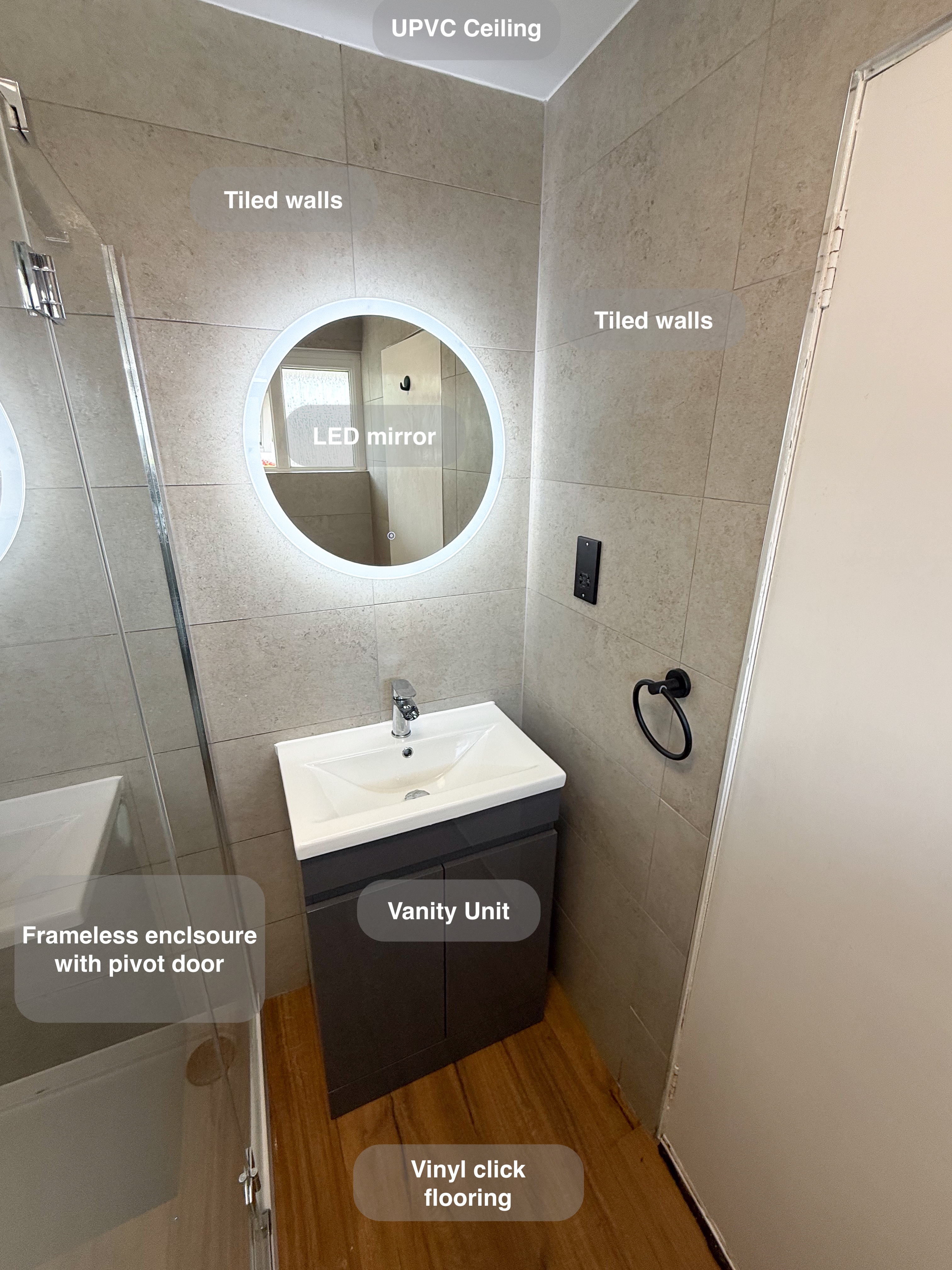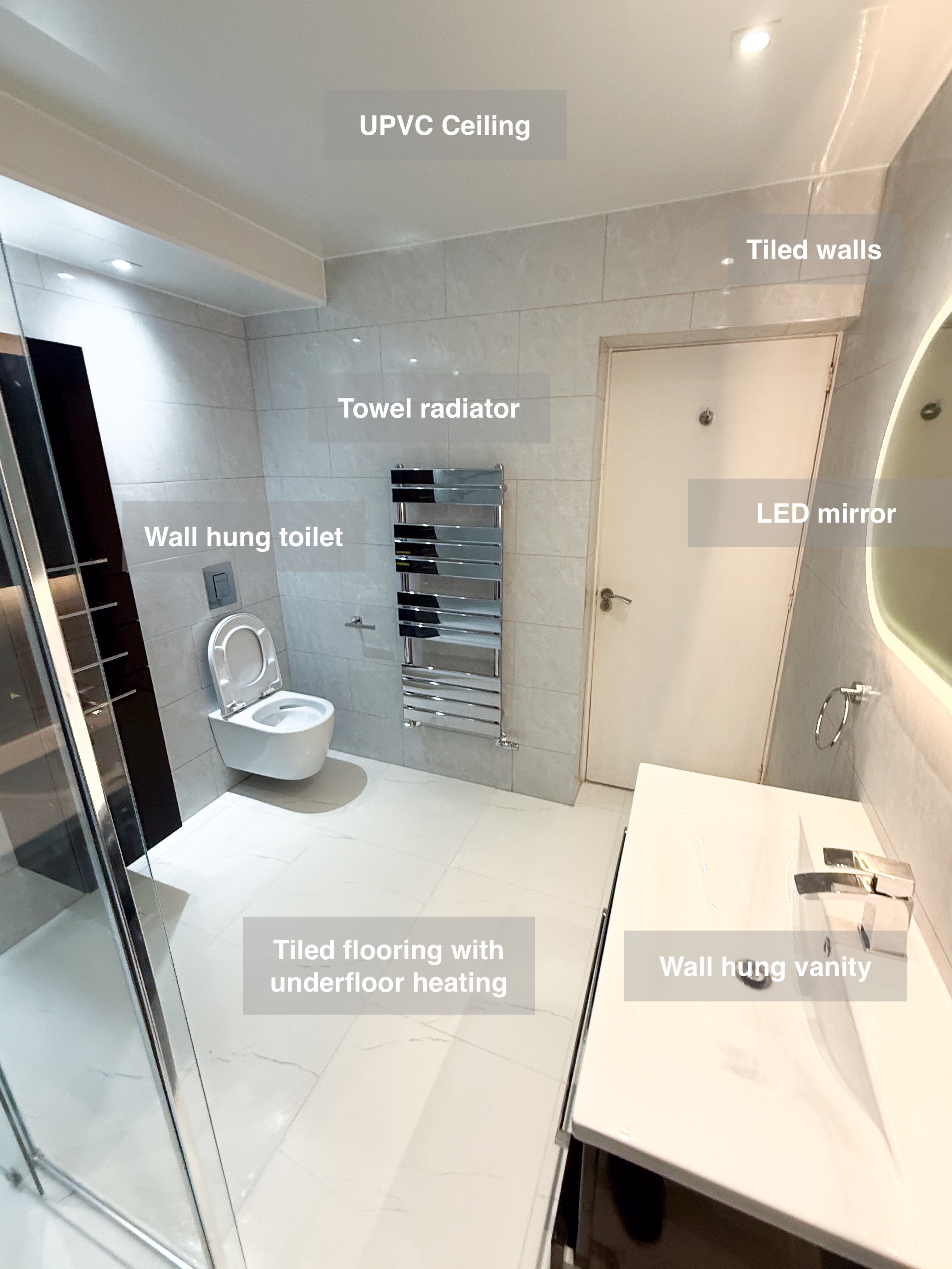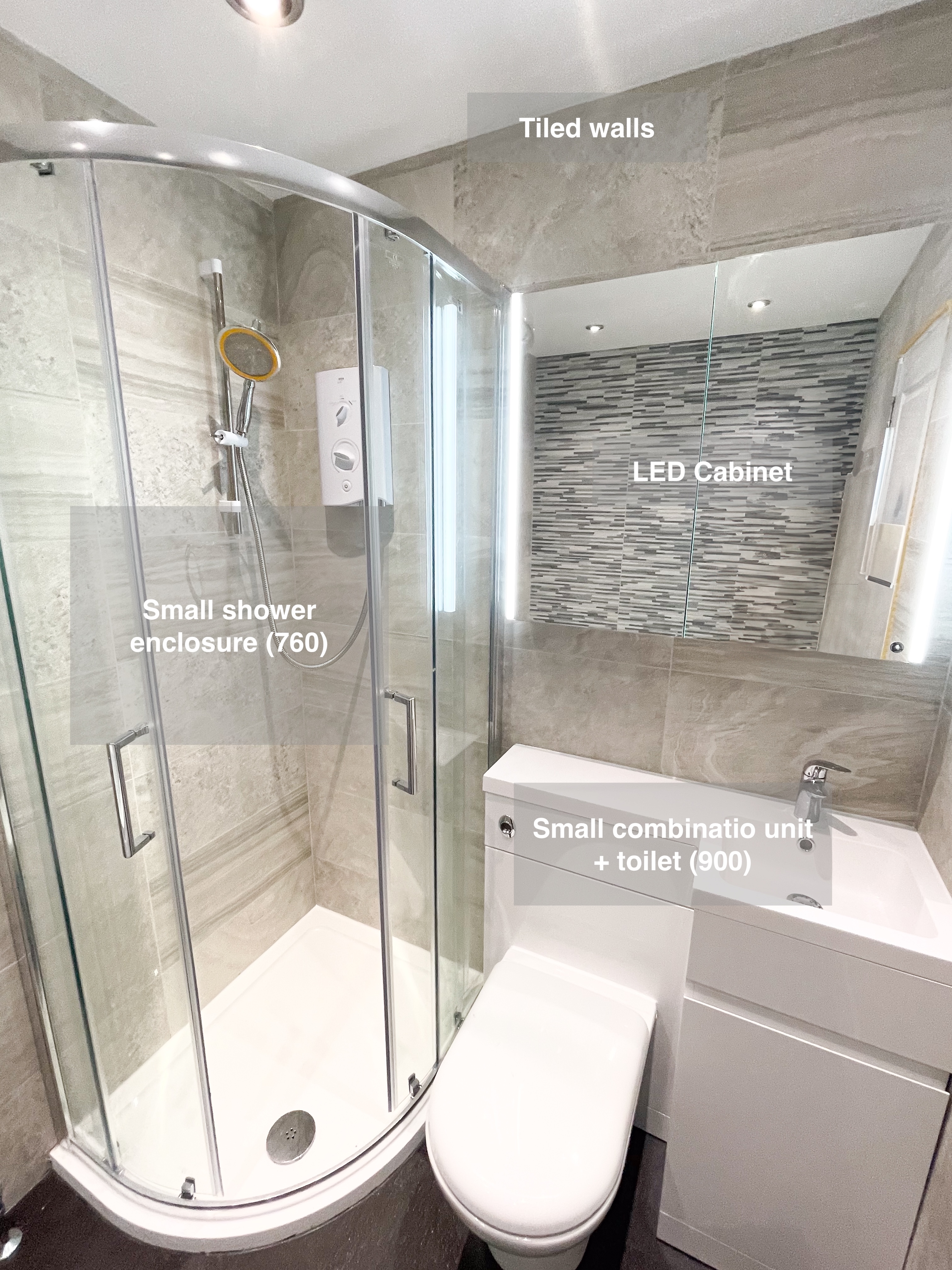 Full refurbishment with tiles all around the room, shower enclosure, wall mounted vanity unit. 3D Scan https://www.youtube.com/watch?v=5LxkD4HsDII