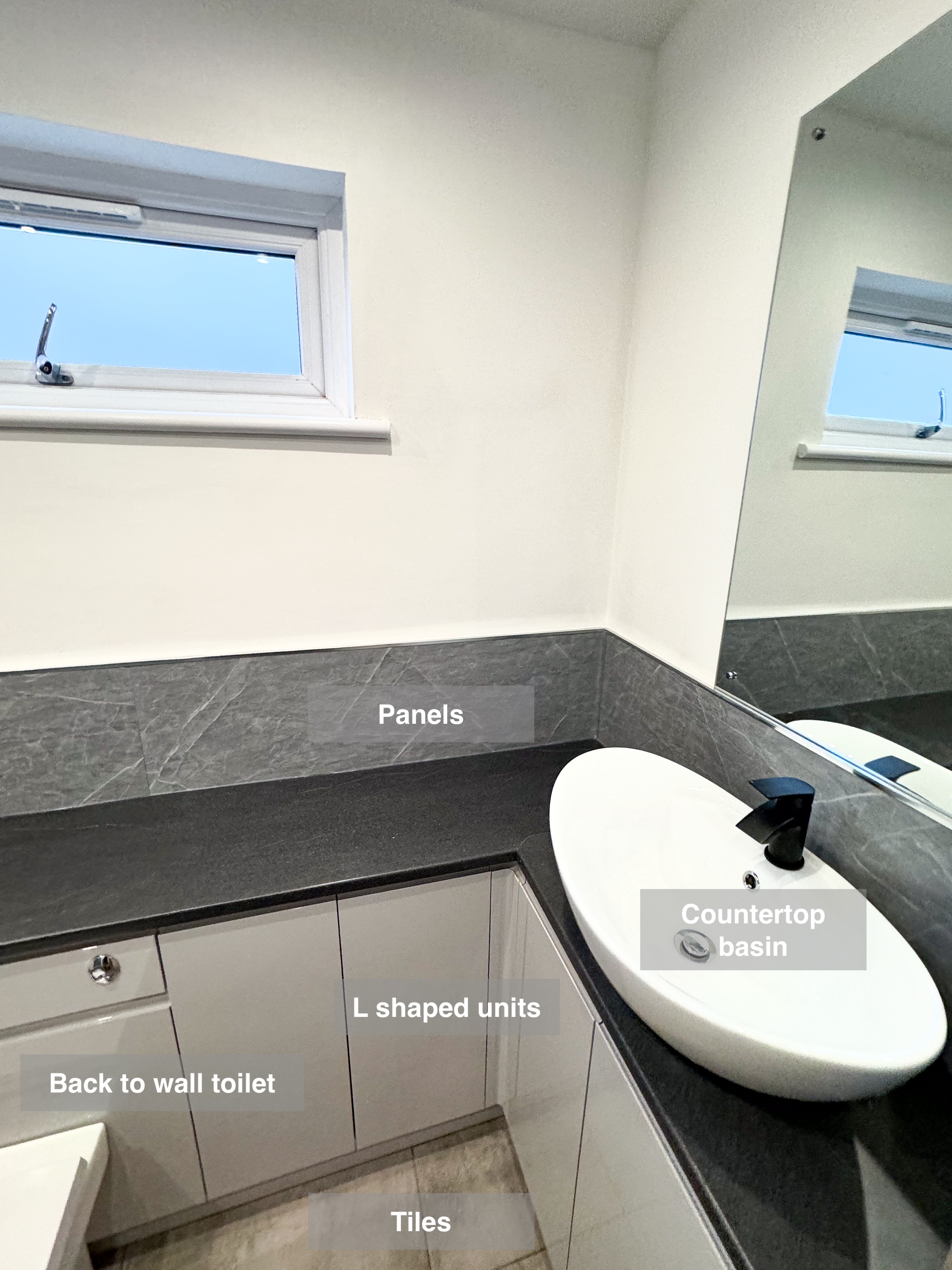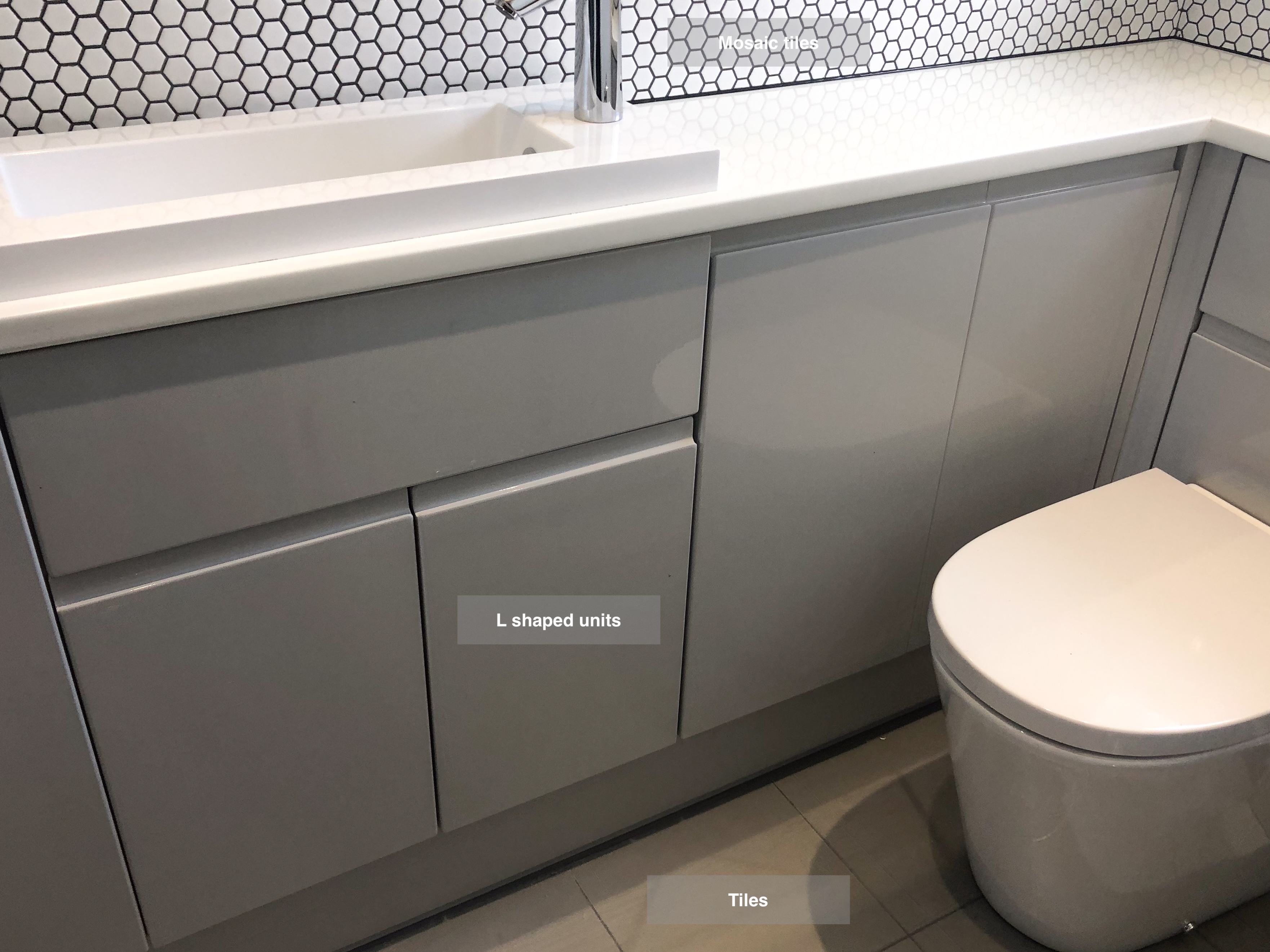 Bathroom refurbishment with tiles all around the room and L shaped units. The L shaped units were used so the sink has a mirror in front of it.