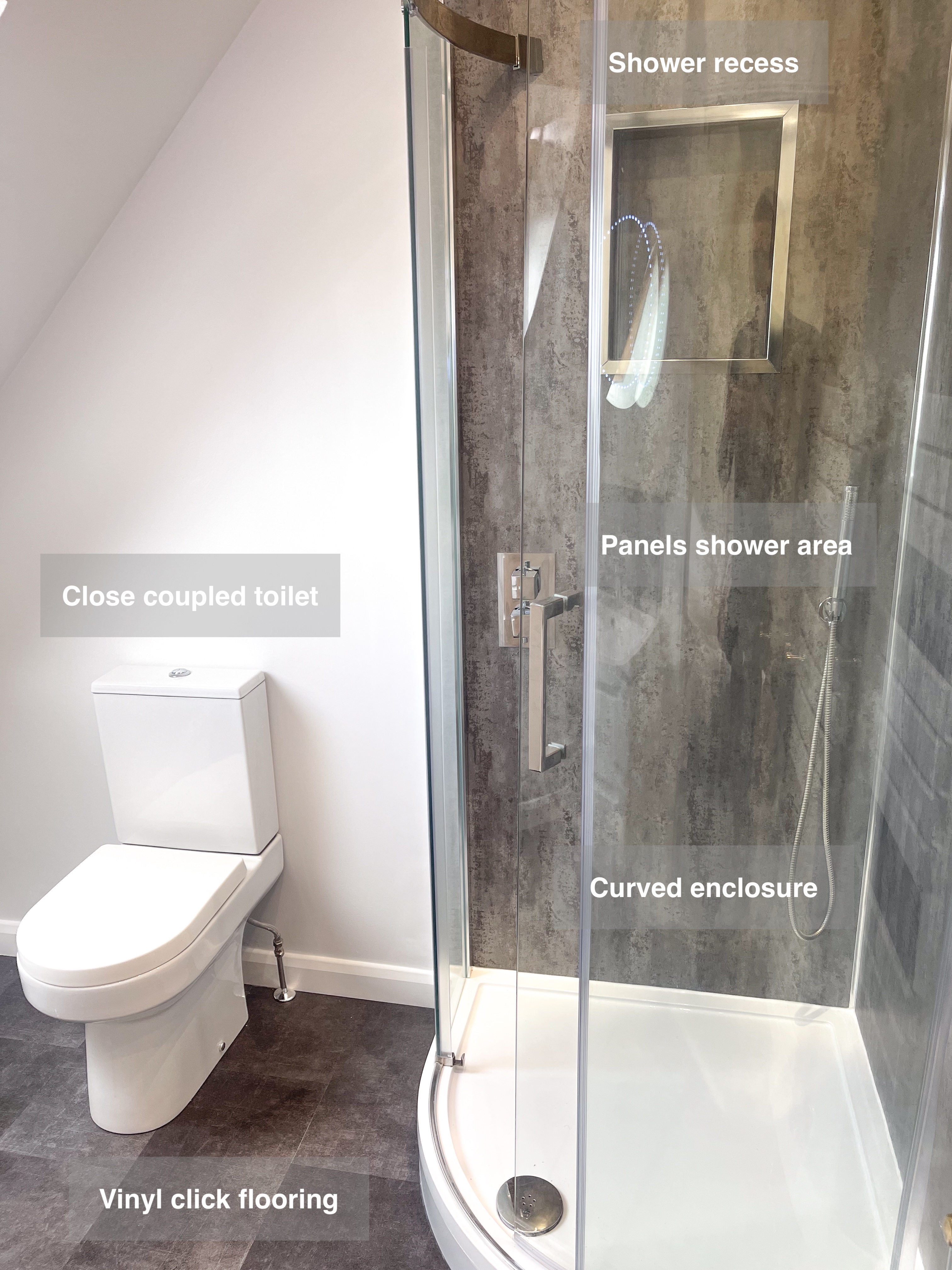 Shower refurbishment in Aberdeen, designed to improve comfort and warmth in what was previously a cold room. We insulated the external walls to retain heat, installed a wall-hung toilet and a modern shower enclosure with two recessed shelves for practical storage. A wall-hung vanity unit helps keep the space feeling open, while durable vinyl…