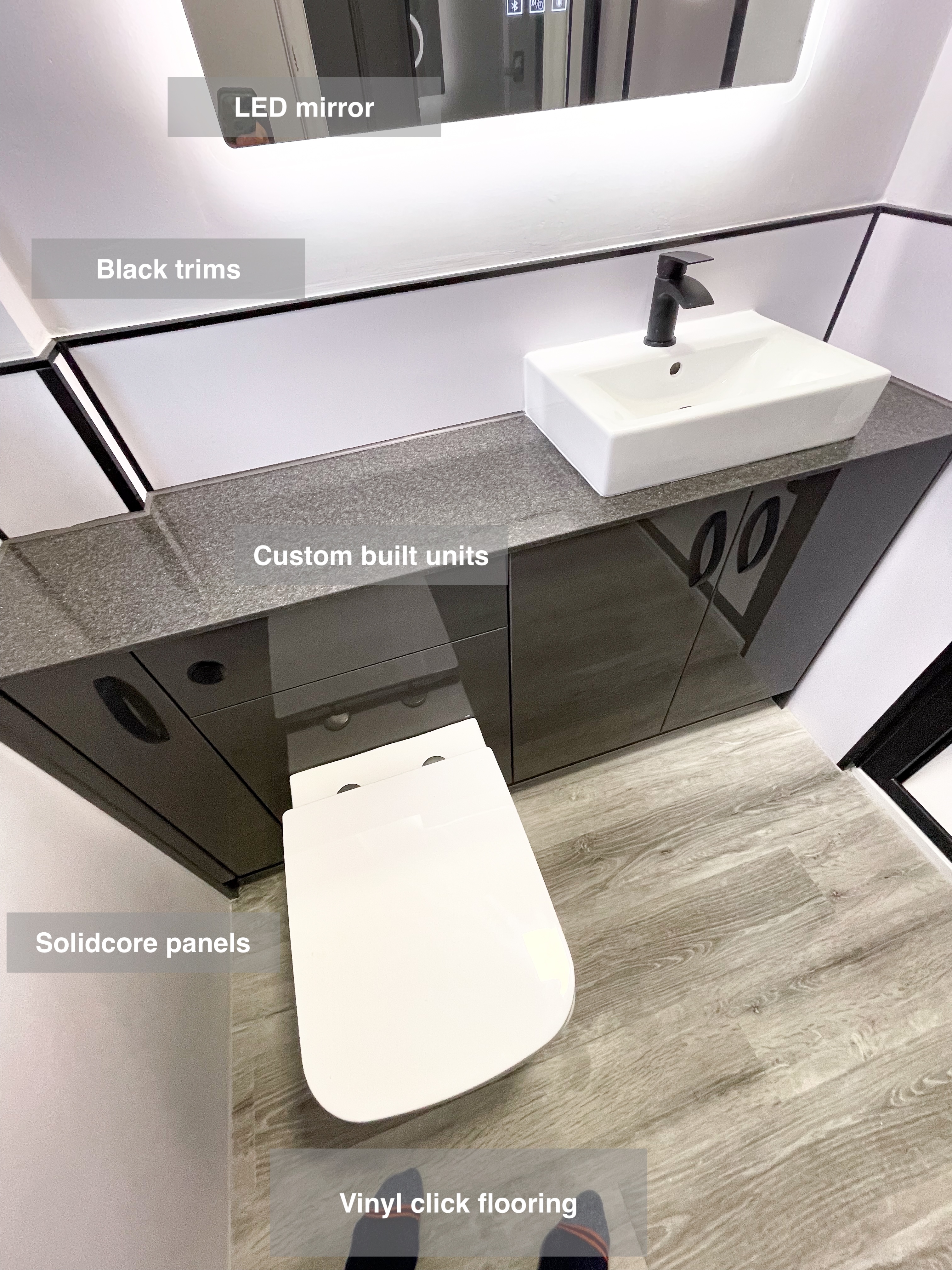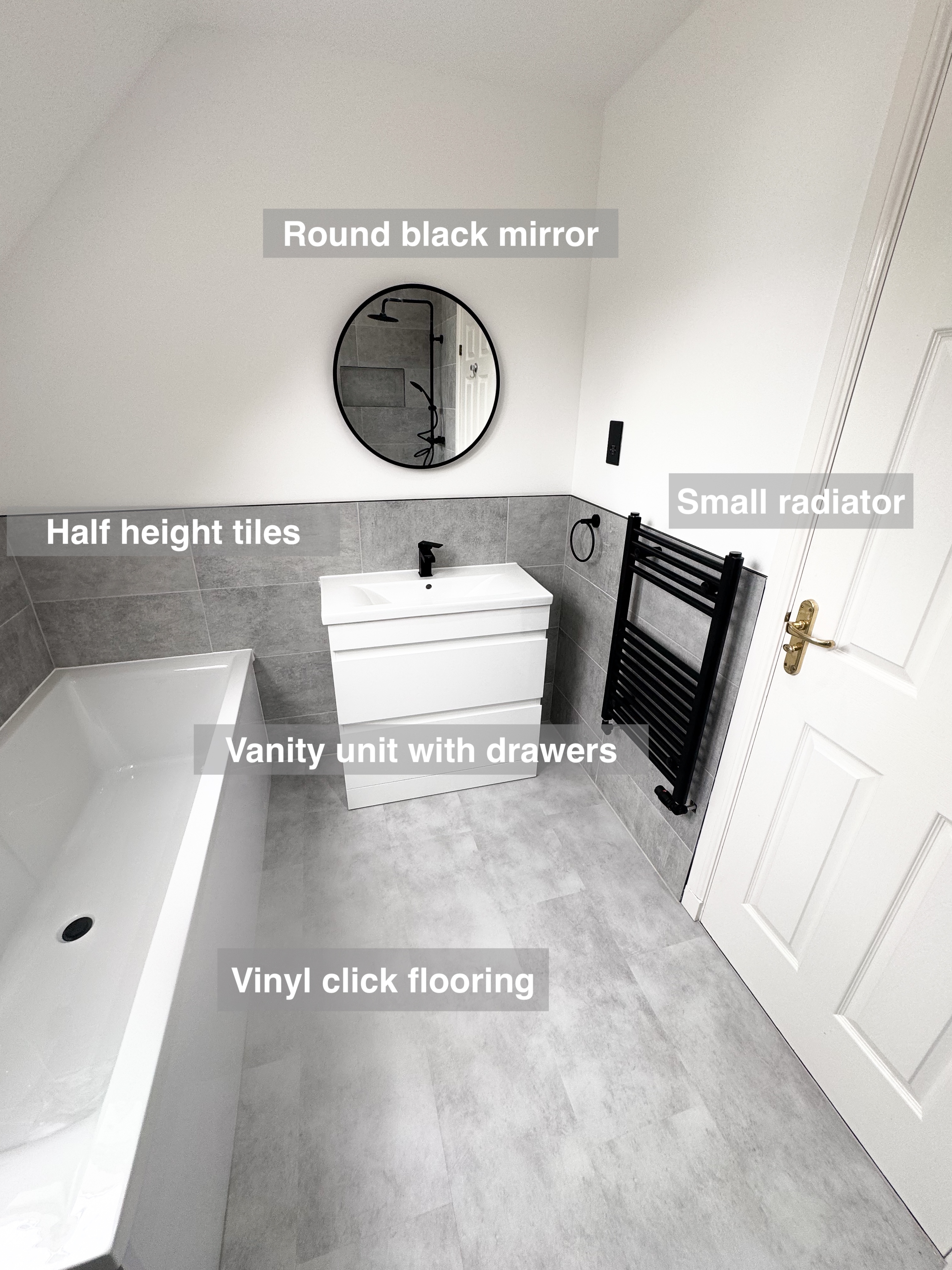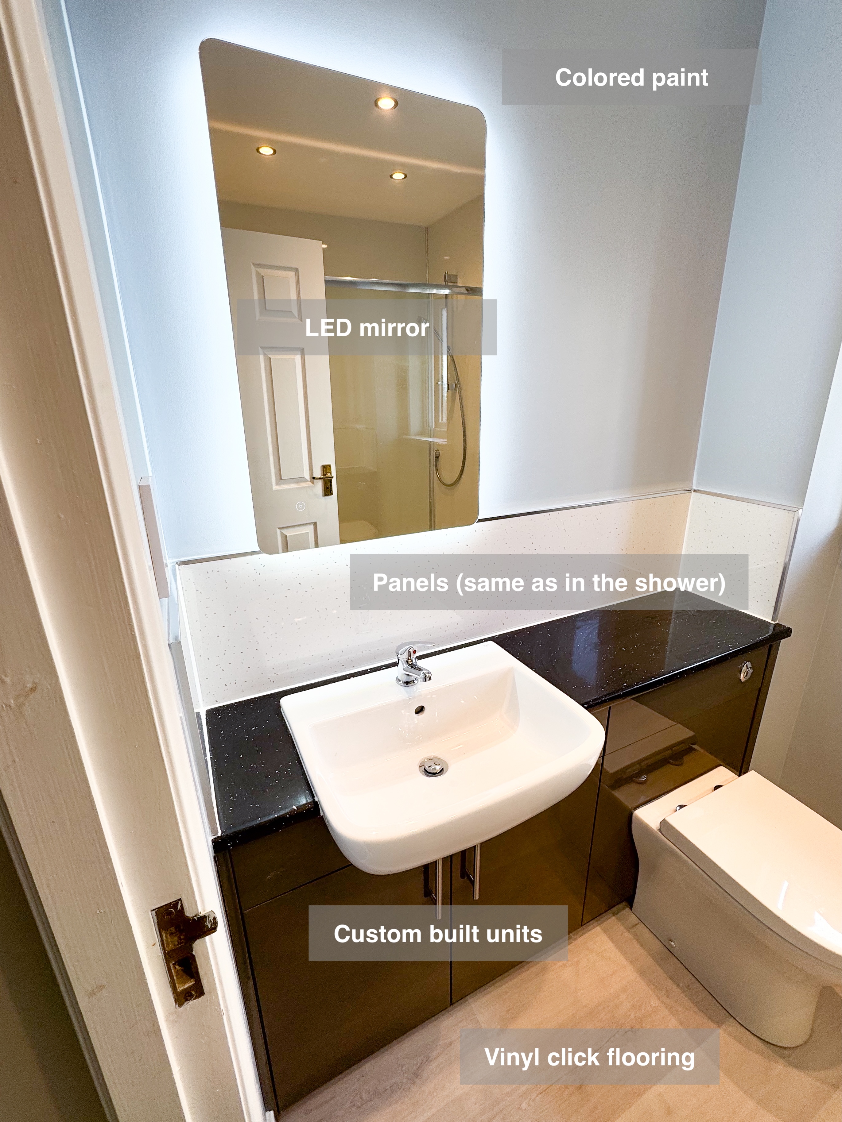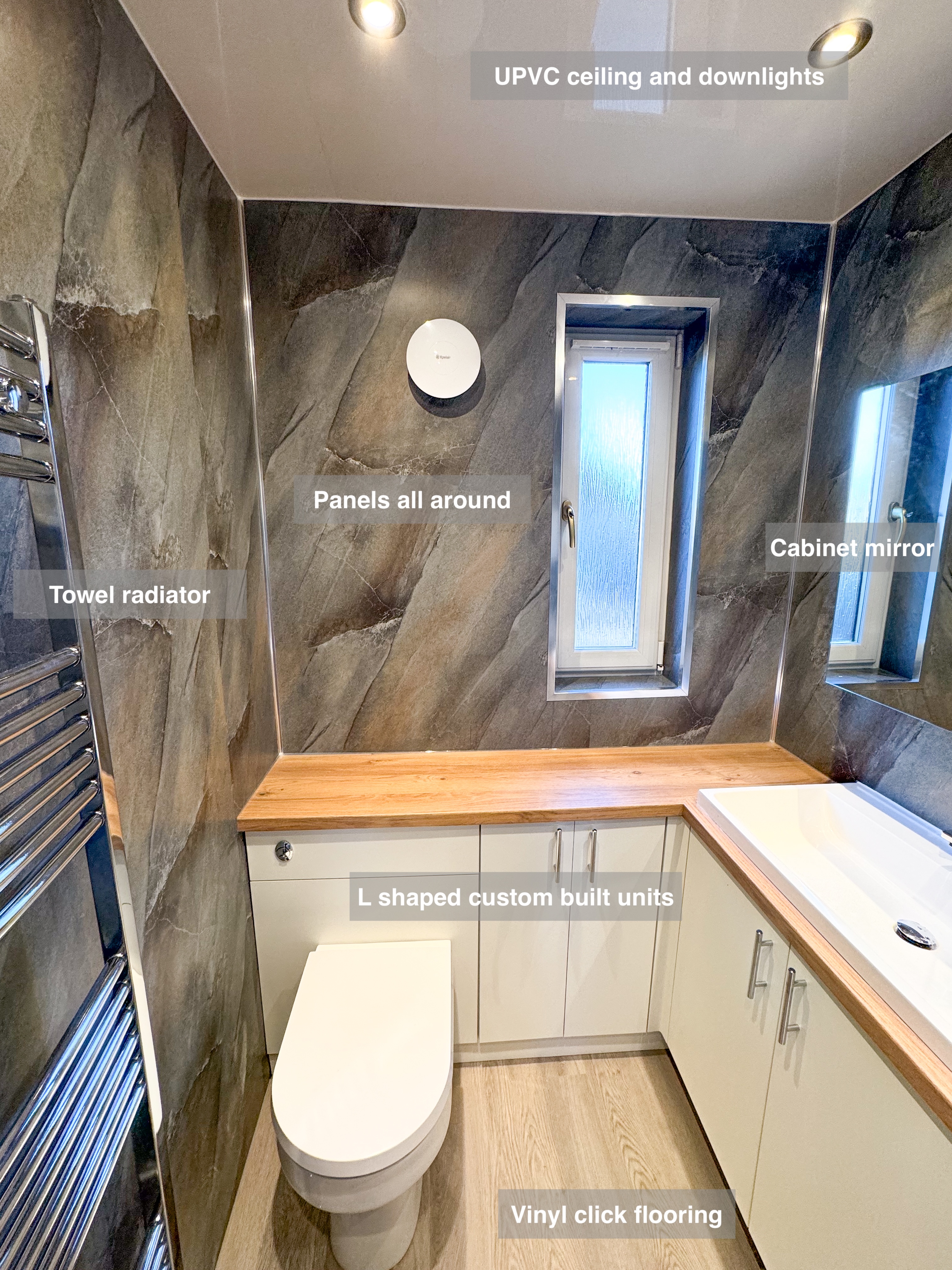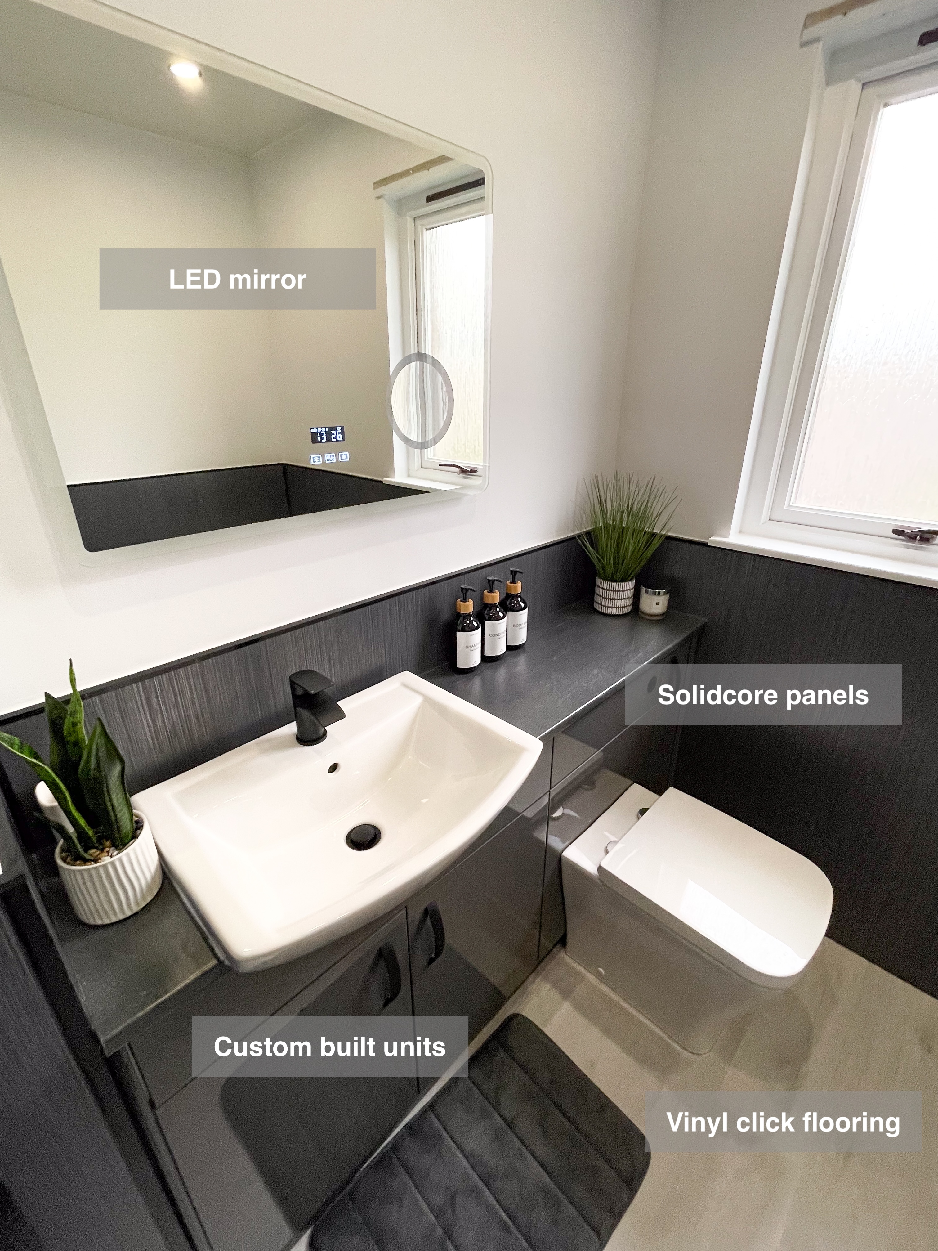 Bathroom refurbishment where we fitted a shower enclosure, custom built units, vinyl click flooring, black radiator/taps/shower, panels all around the room. https://youtu.be/bpMH_Ss_658