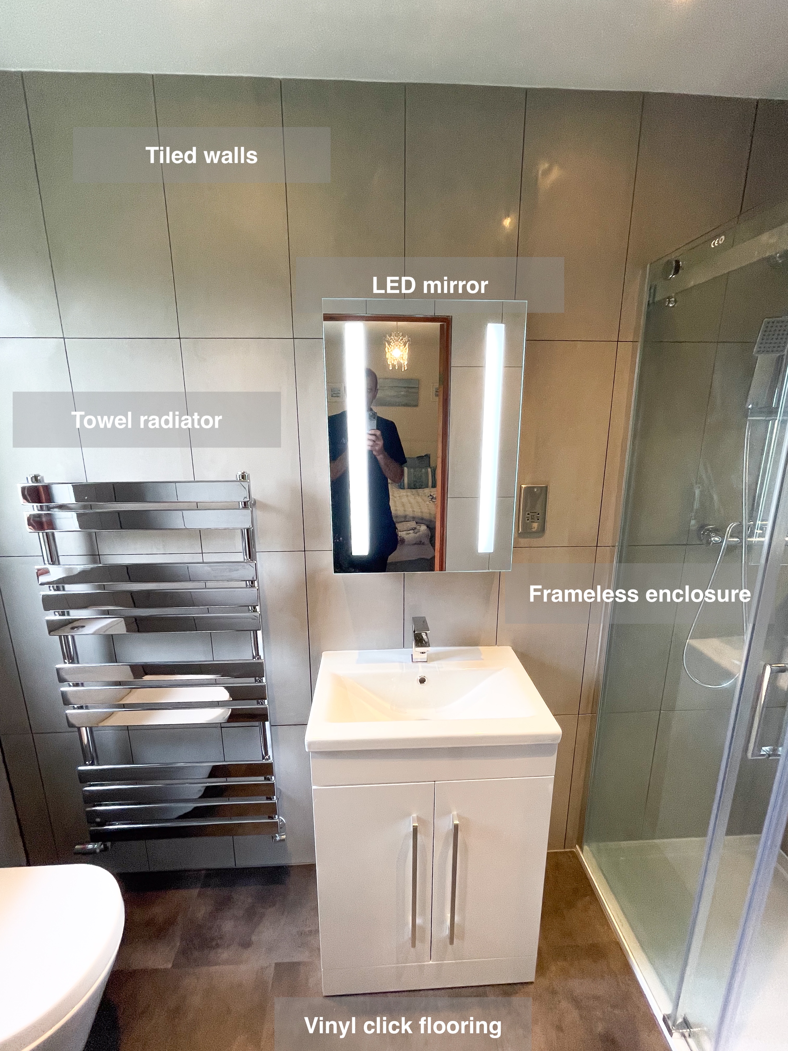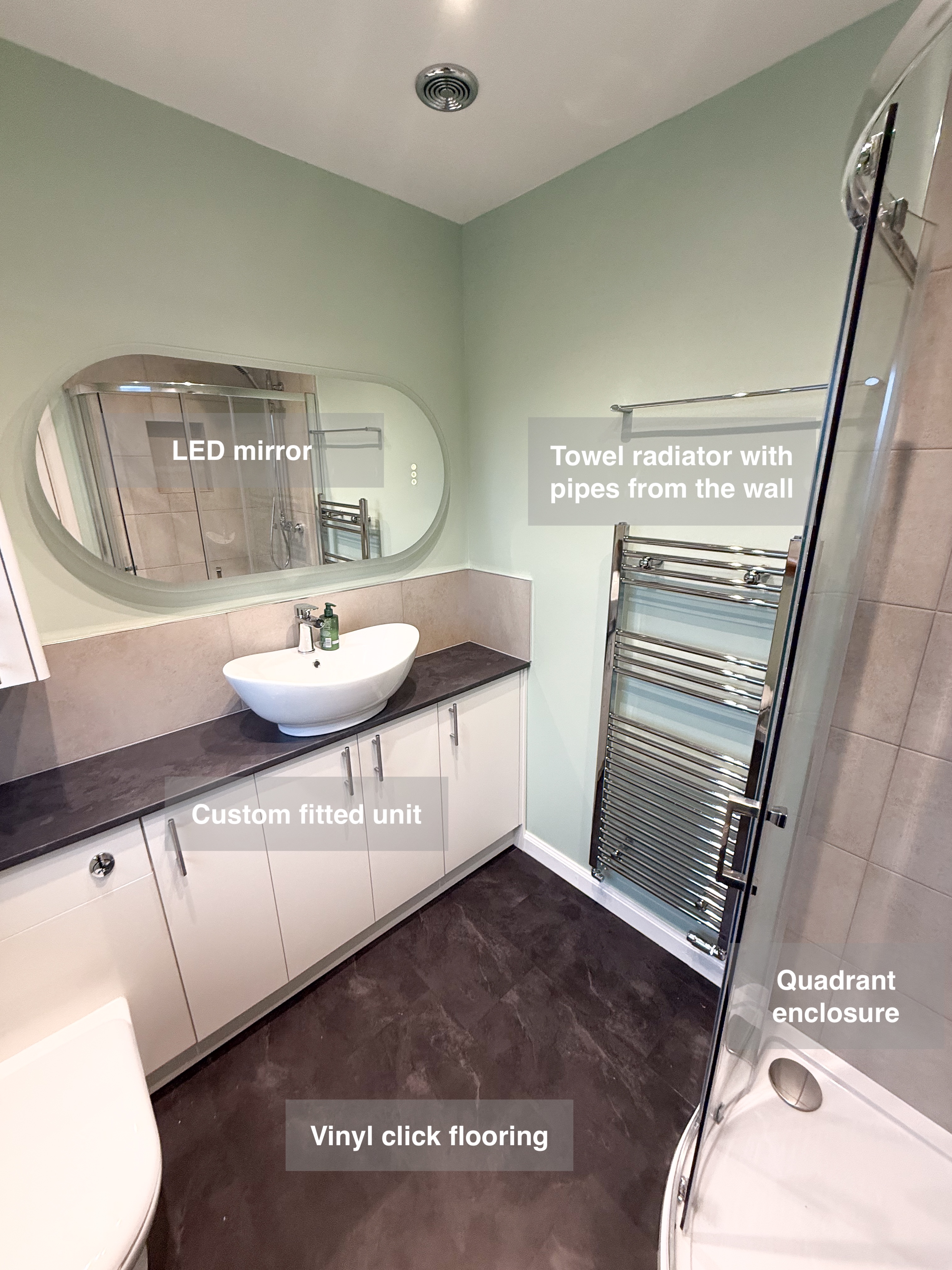 Complete ensuite refurbishment featuring full tiling throughout, a sleek frameless shower door, recessed shower, thermostatic bidet, wall-fed towel radiator, durable vinyl click flooring, elegant vanity unit, and an LED-illuminated cabinet for added style and functionality. https://youtu.be/ZjPxz_2EFQM