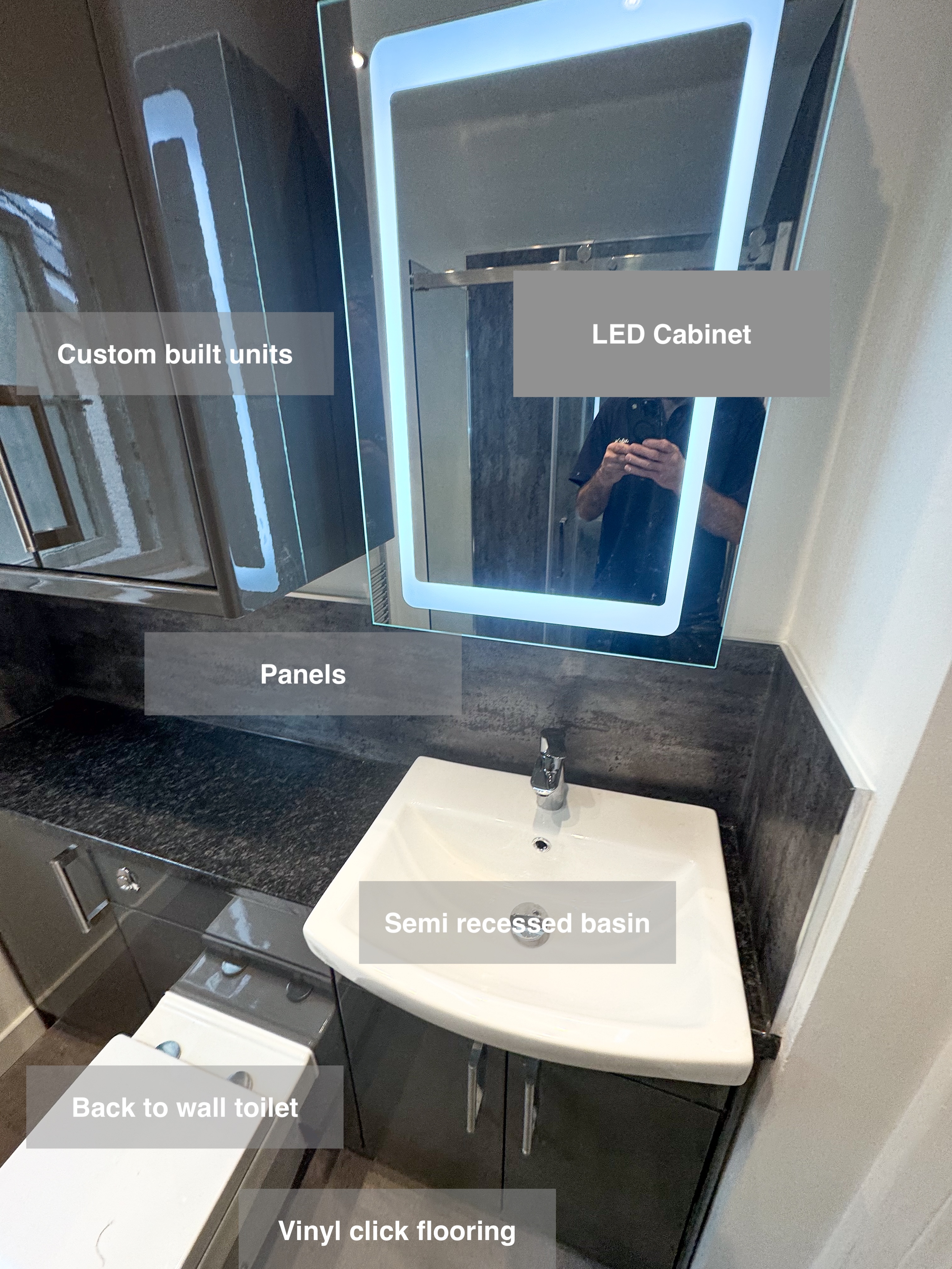 This full bathroom refurbishment offers a blend of modern convenience and stylish design. The shower features robust, easy-to-clean solid core panels, ensuring durability and a sleek look. The vinyl click flooring not only adds a contemporary finish but is also highly practical, offering water resistance and easy maintenance. Custom-built units provide ample storage, designed…