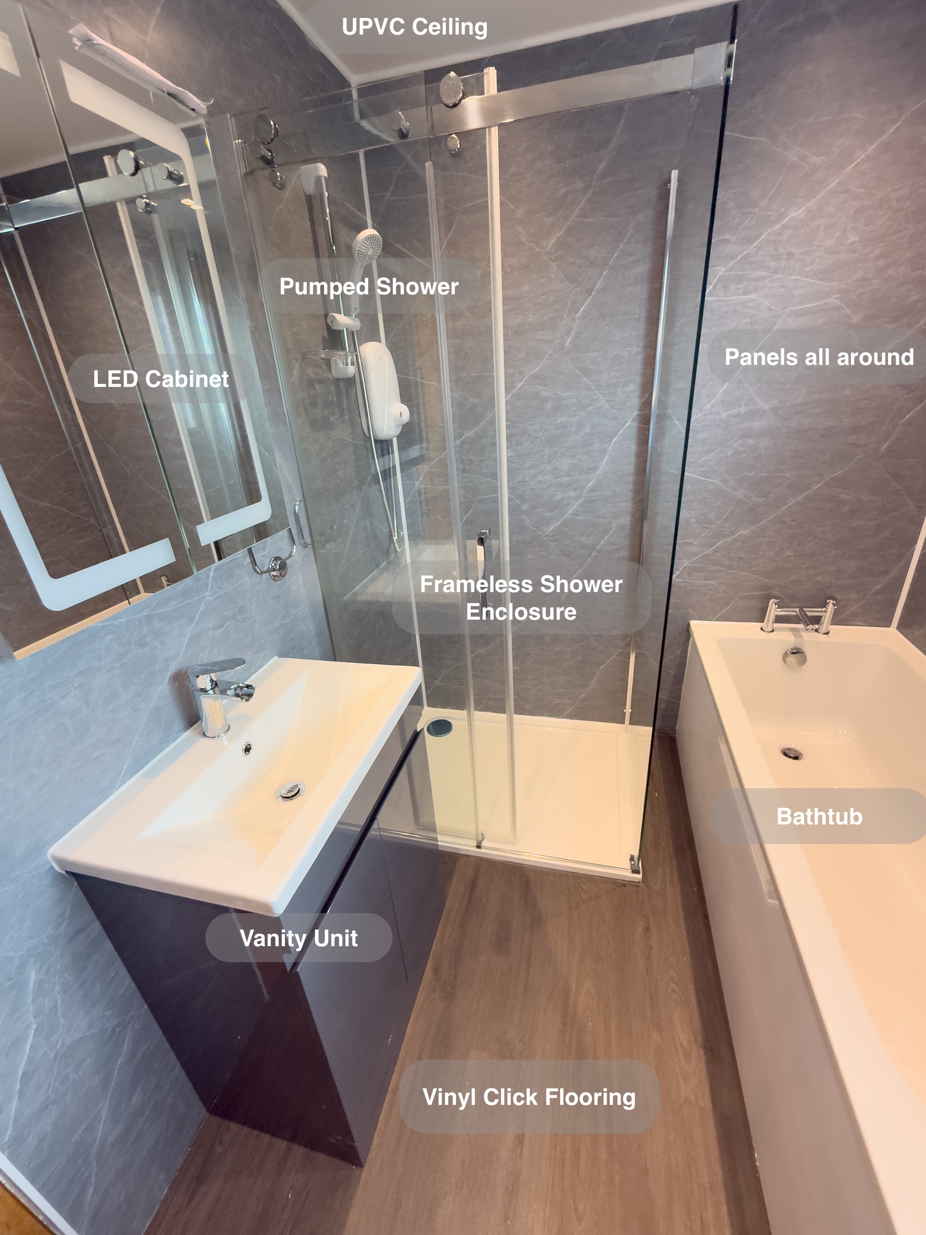 Complete bathroom refurbishment featuring modern wall panels throughout the room for a sleek, seamless look. Highlights include a stylish J-shaped bathtub, a spacious frameless shower enclosure, and bespoke cabinetry with a tall storage unit for added functionality. The room is finished with durable vinyl click flooring and a matte UPVC ceiling for a clean,…