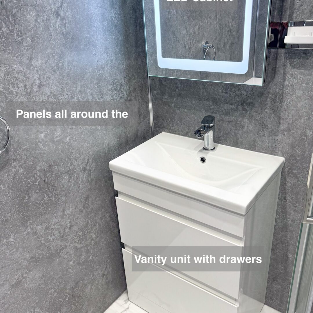 In this full bathroom refurbishment, we transformed the space by replacing the bathtub with a modern shower enclosure, perfect for those seeking convenience and ease of access. We used elegant grey tiles throughout, finished with durable epoxy grout for a stylish yet easy-to-clean surface that maintains its look for years to come. An LED mirror adds a touch of luxury, while the large black towel radiator (measuring 1800×600) ensures towels are warm and dry, enhancing comfort after every shower.