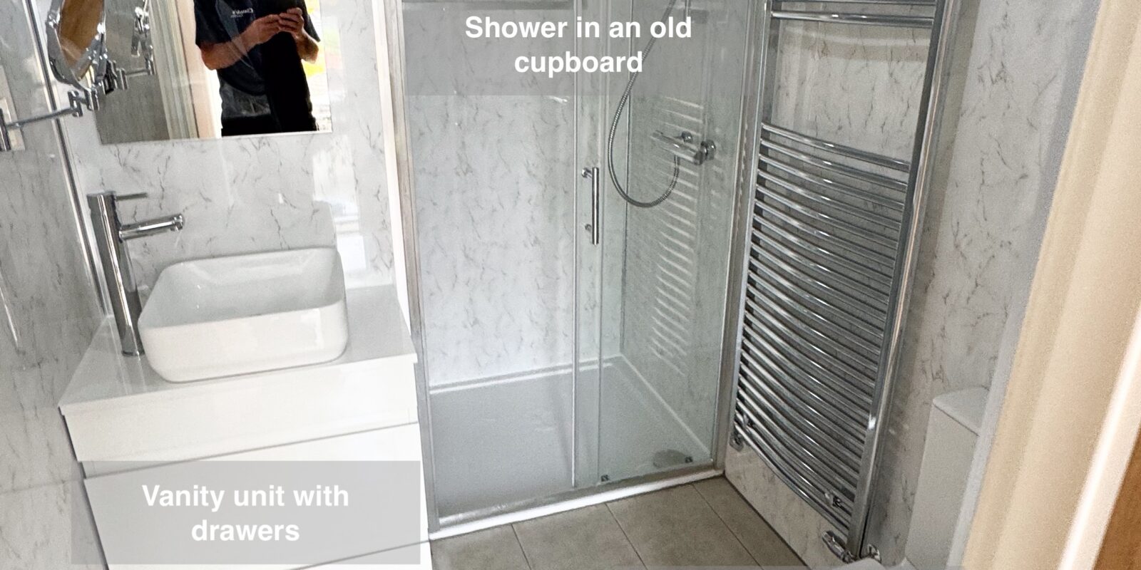 The toilet and vanity unit were repositioned for improved layout and functionality, and a spacious radiator was installed to enhance comfort. The floor was expertly tiled, and durable wall panels were fitted throughout, ensuring a stylish look that’s easy to maintain.