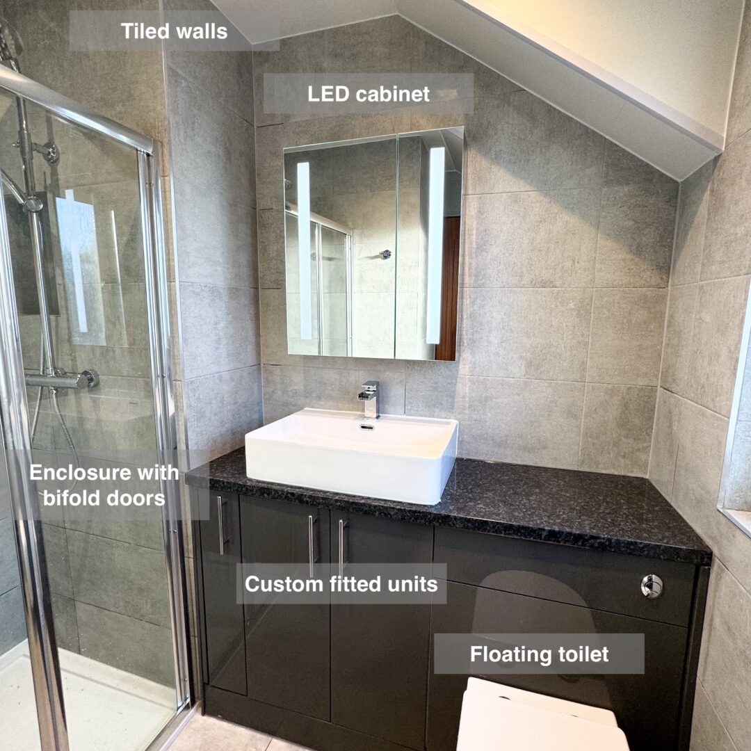 The Victorian-style floor tiles add a touch of elegance, seamlessly blending with the contemporary frameless shower enclosure for a sleek and open feel. The wall-hung toilet with a concealed cistern not only saves space but also makes cleaning much easier. A built-in shower recess offers a tidy spot for toiletries, and the thermostatic shower ensures a consistent, comfortable temperature. The anthracite radiator complements the modern design while providing efficient heating.