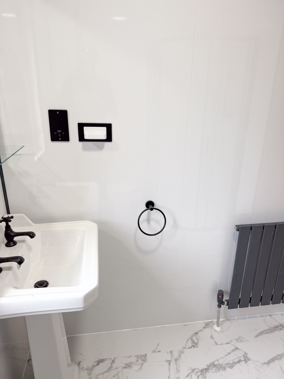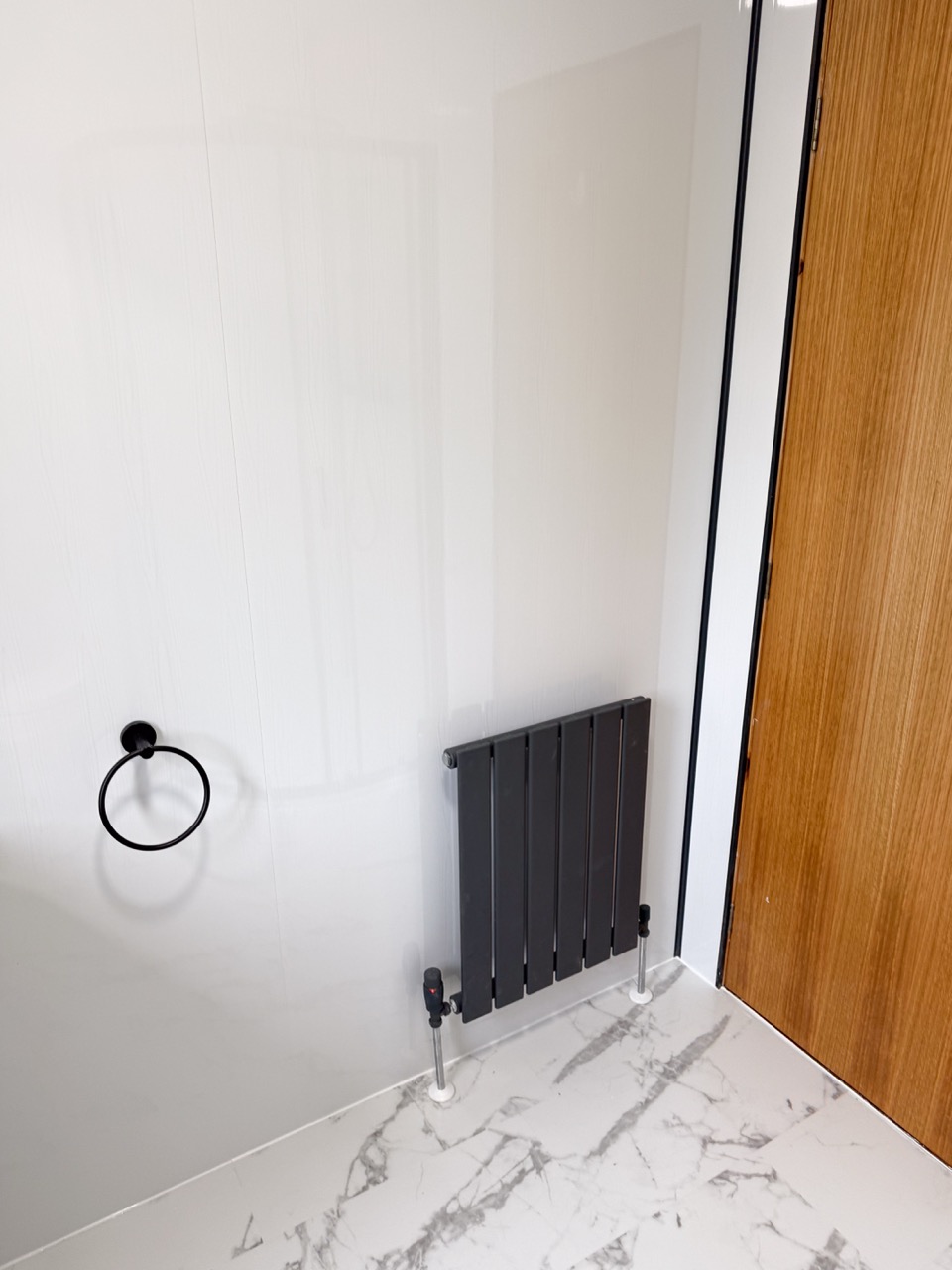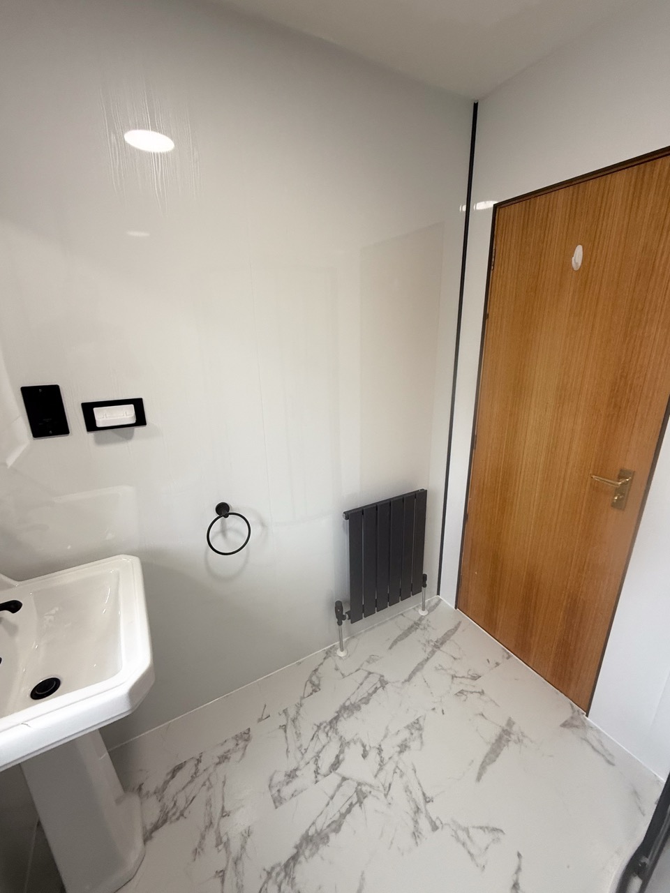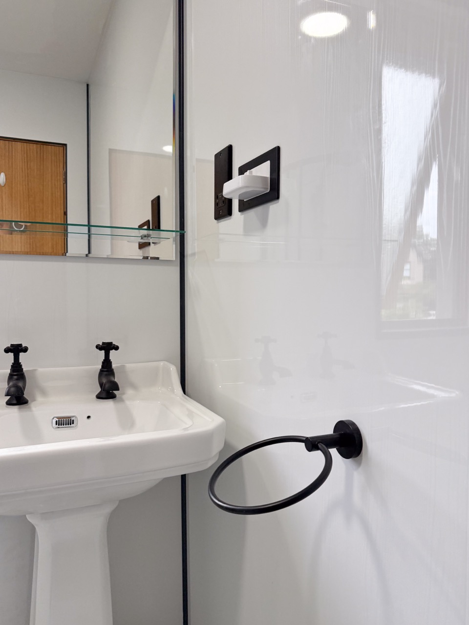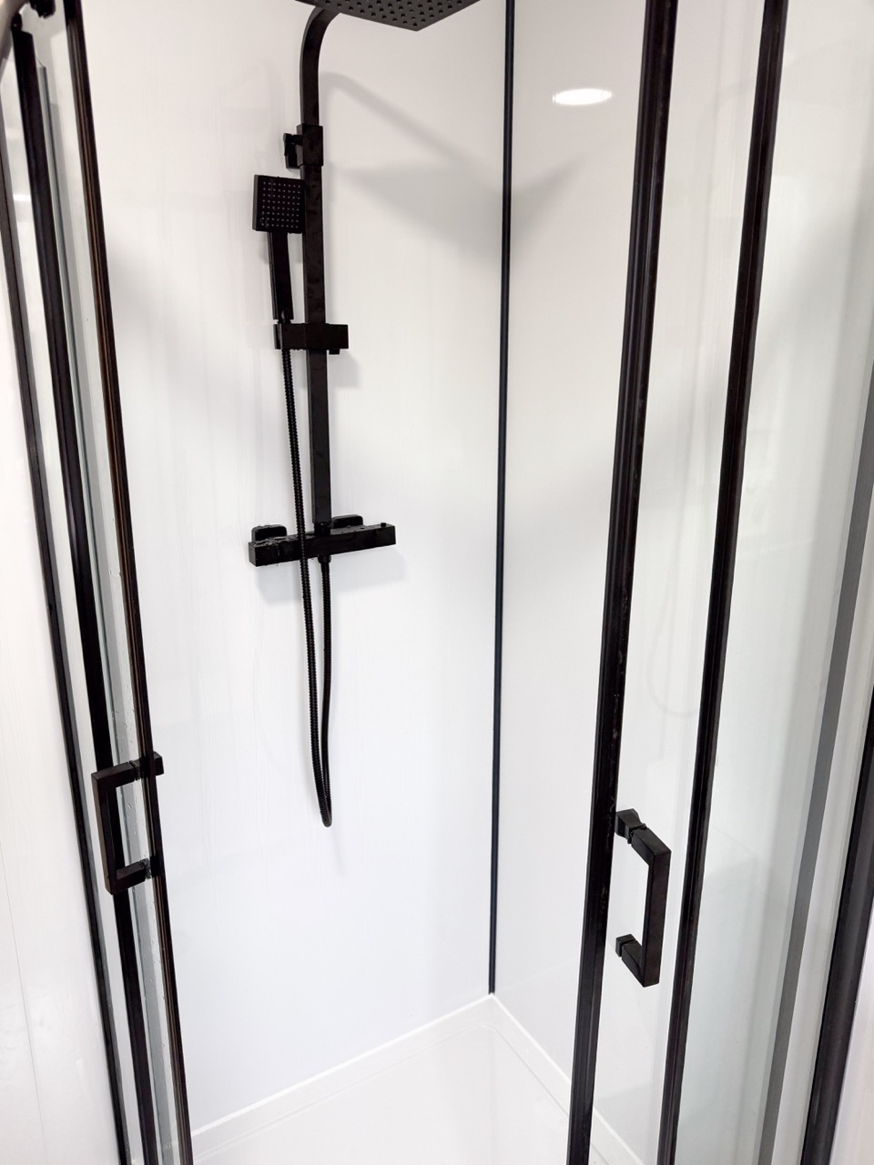 - Wall panels throughout – low-maintenance, wipe-clean finish with no grout lines.