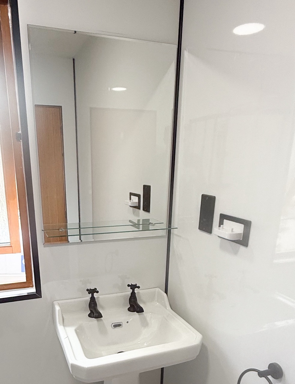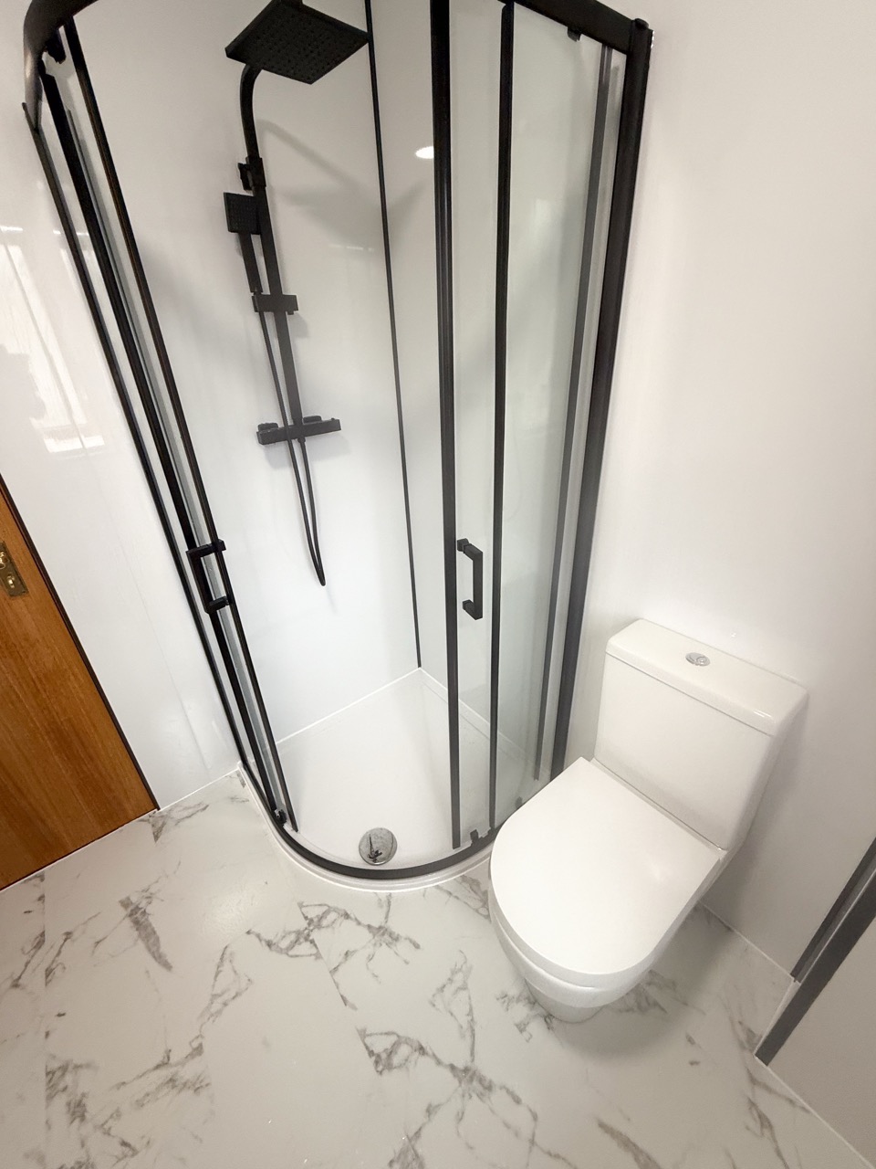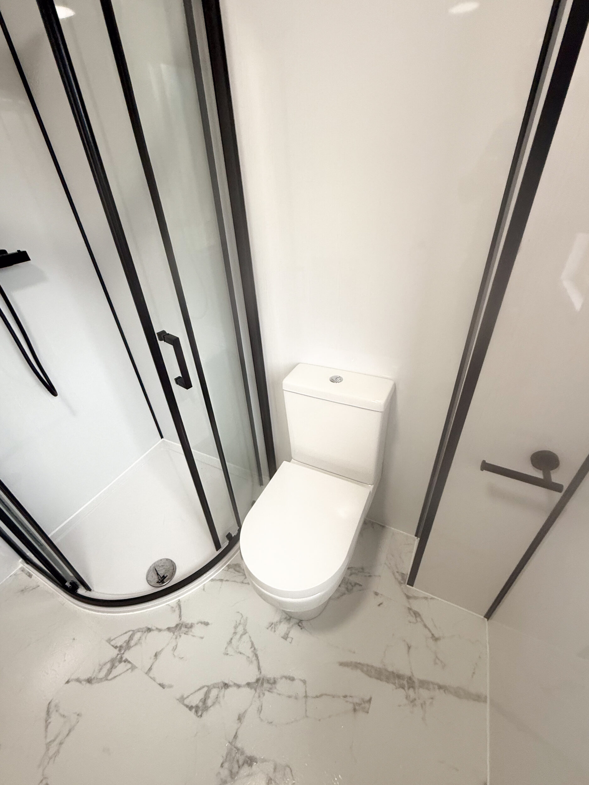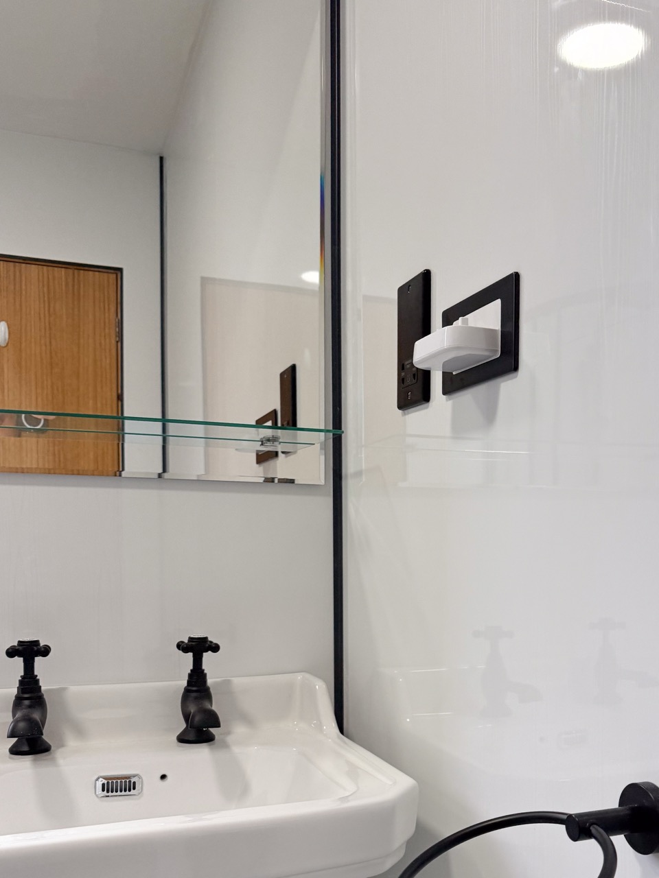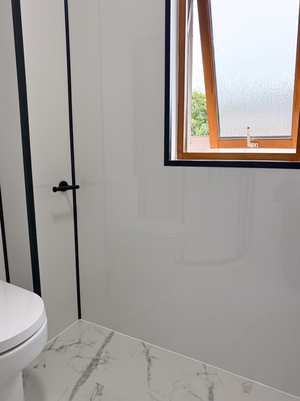 - Wall panels throughout – low-maintenance, wipe-clean finish with no grout lines.