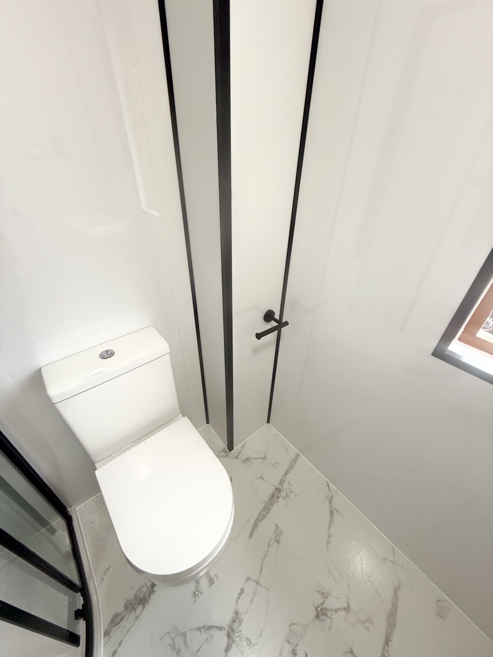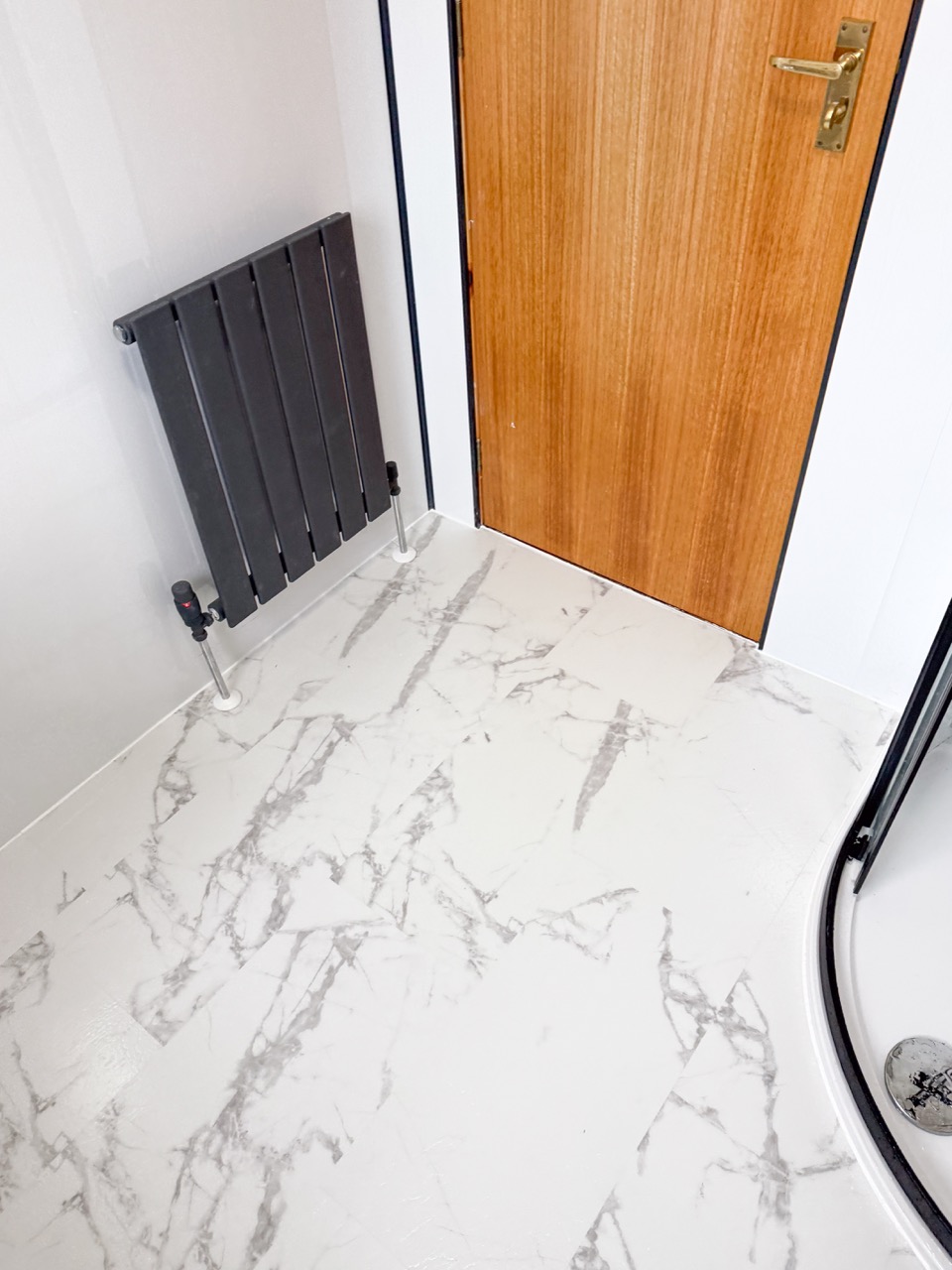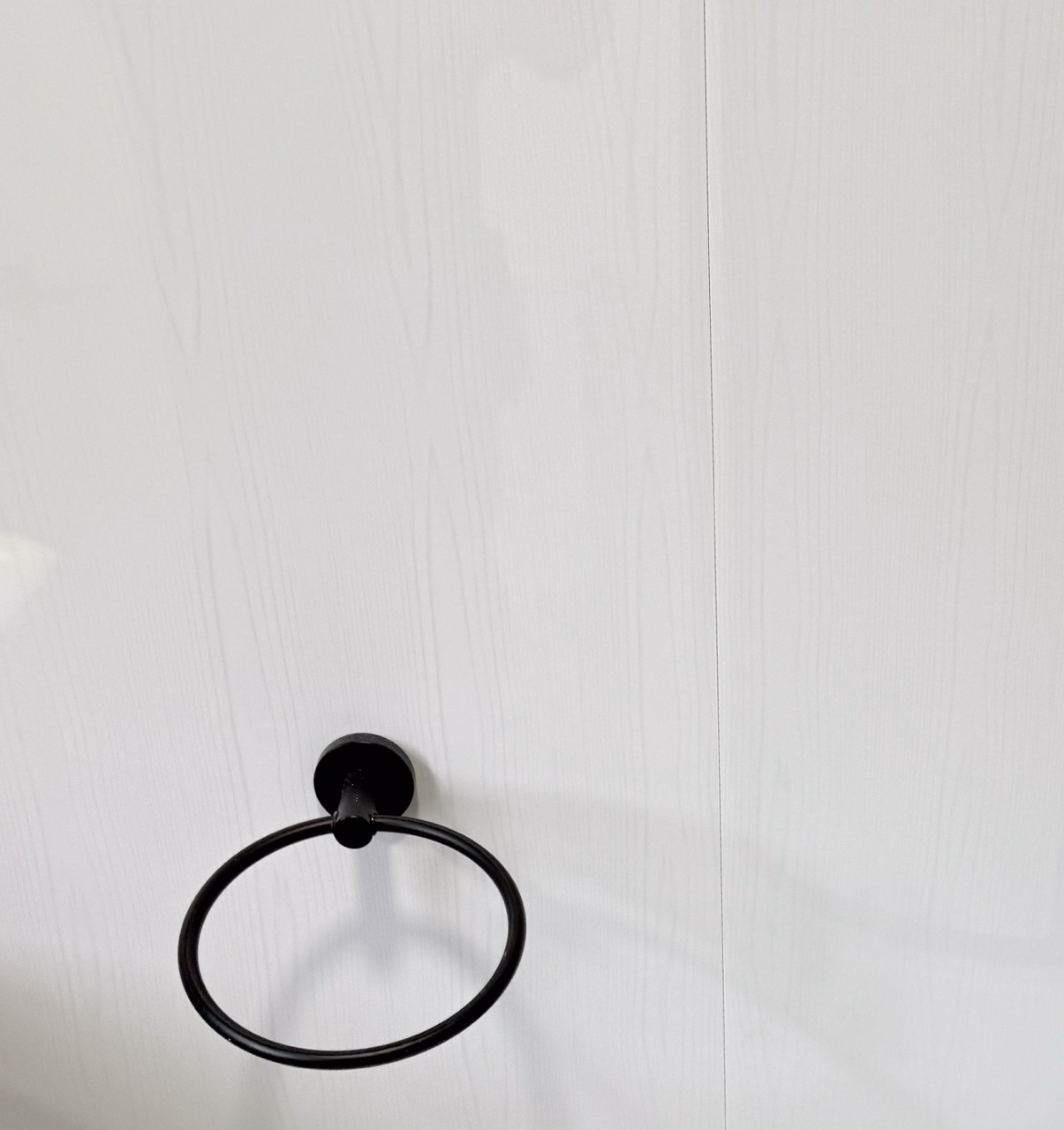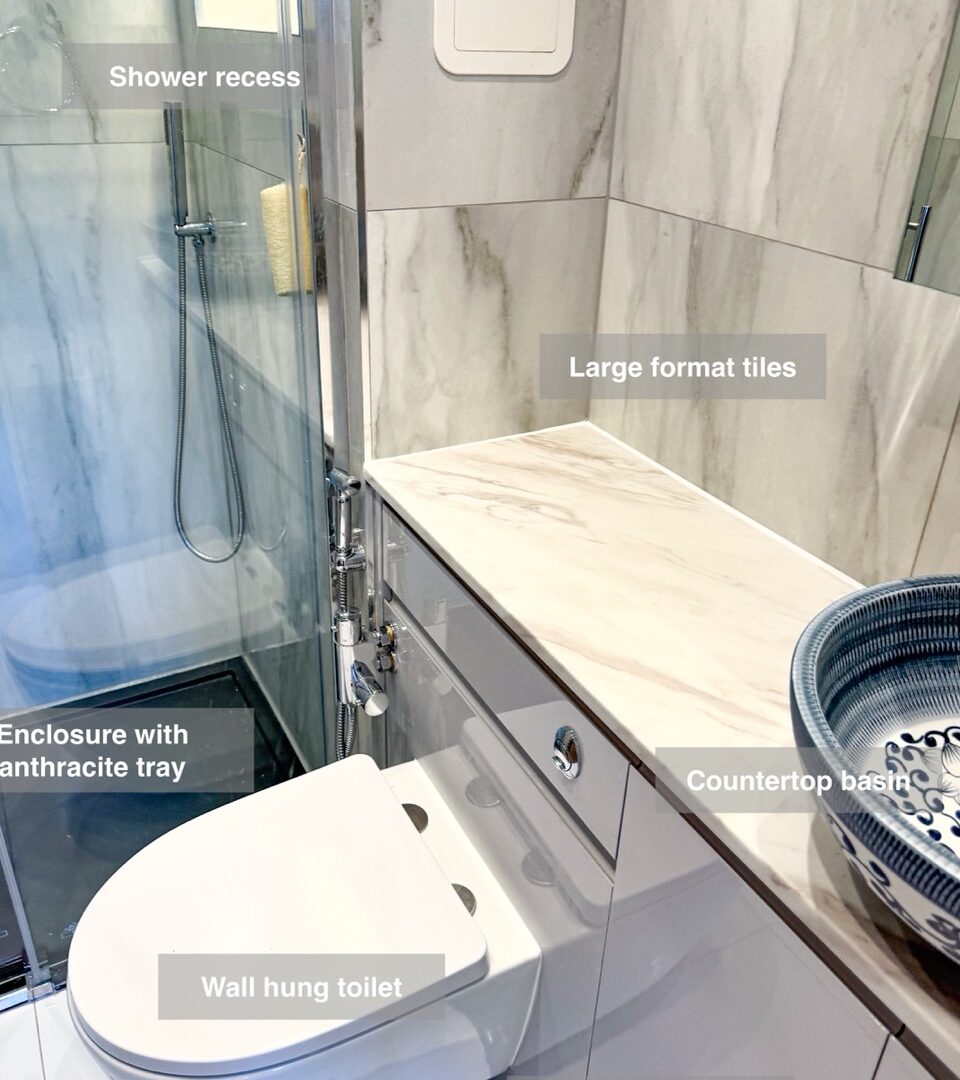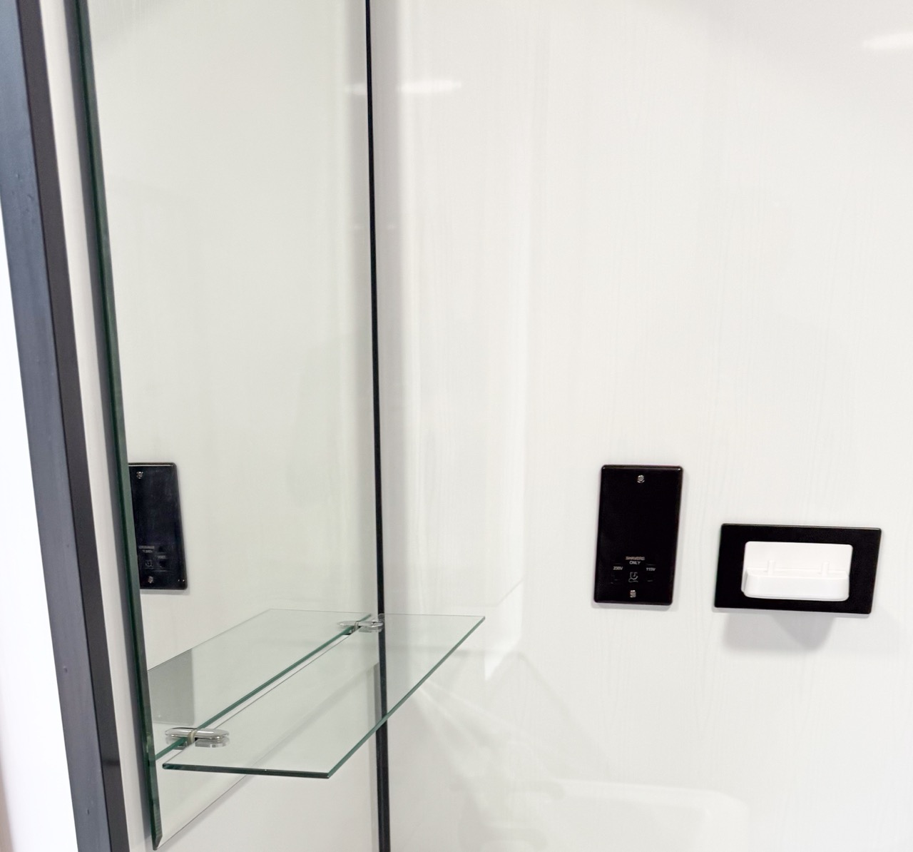 - Wall panels throughout – low-maintenance, wipe-clean finish with no grout lines.