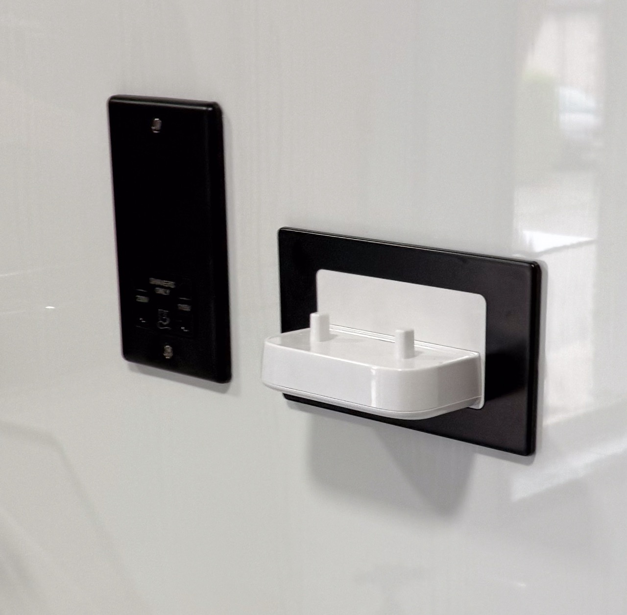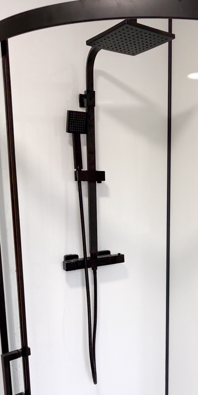 - Bold contrast finish – black metals paired with white wood-effect panels and white marble flooring for a striking, modern look.