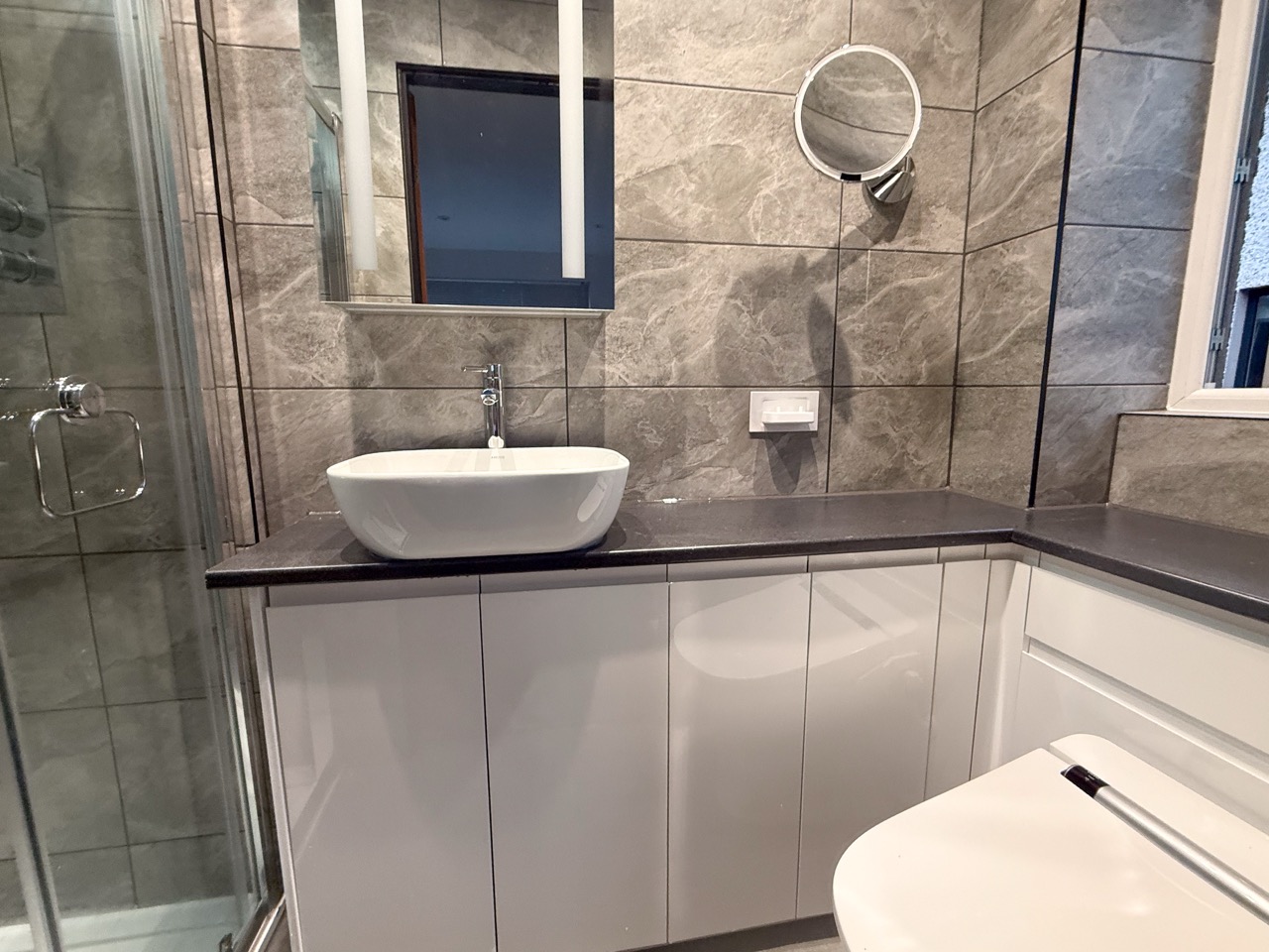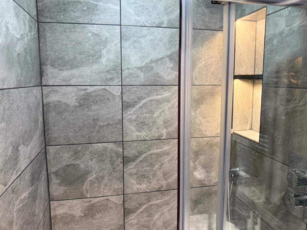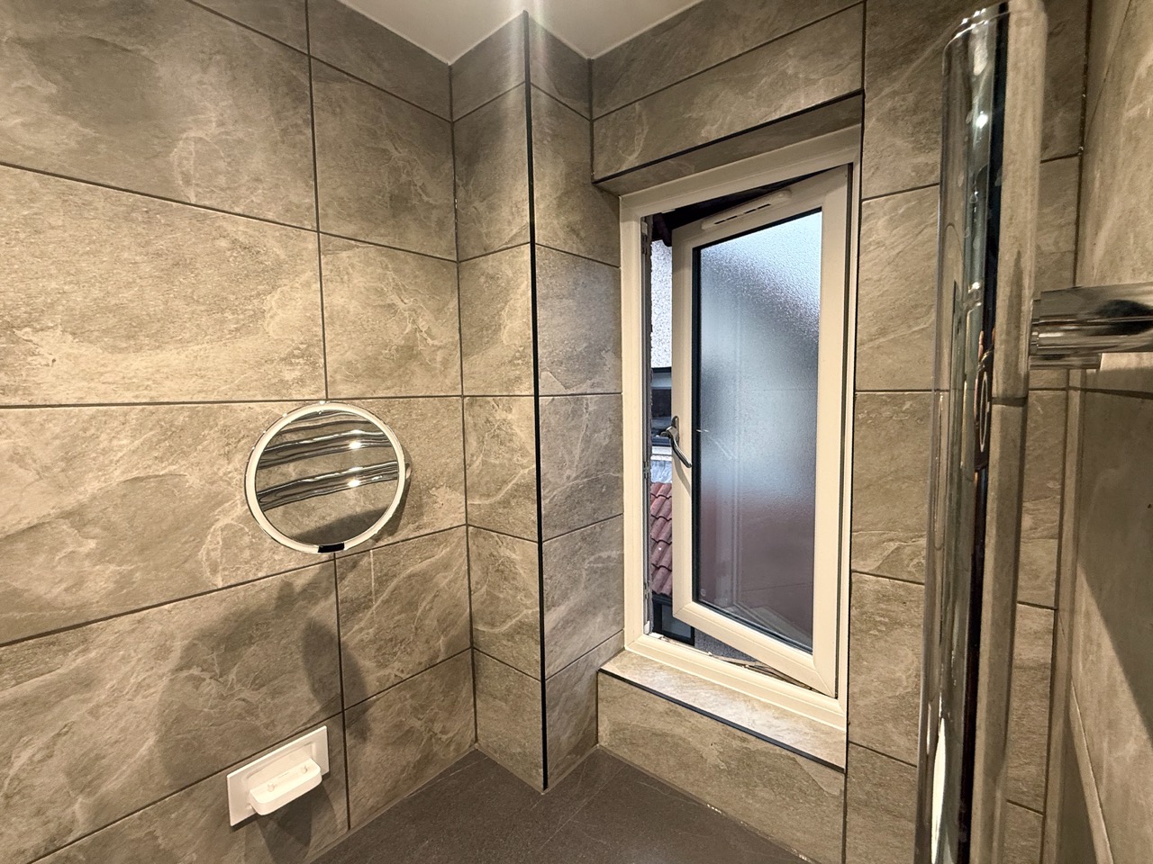 Fully tiled walls and floors, finished with epoxy grout, make cleaning quicker and easier — ideal for a household where the bathroom is used constantly. The UPVC ceiling with downlights brightens the room while being moisture-resistant and low maintenance. An inline extractor fan helps control condensation more effectively, protecting the space long term.