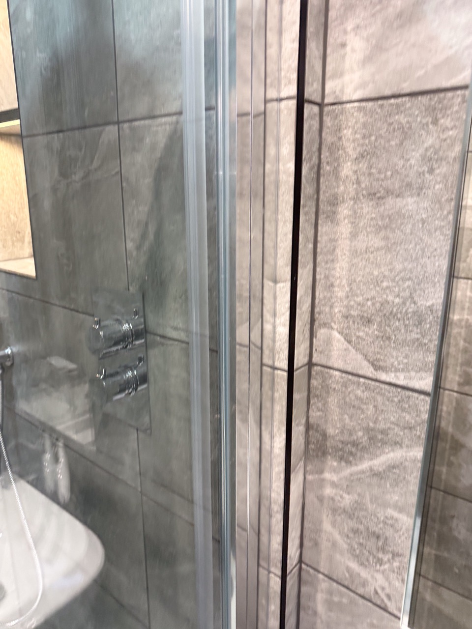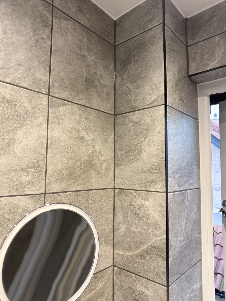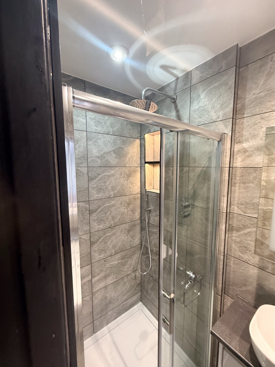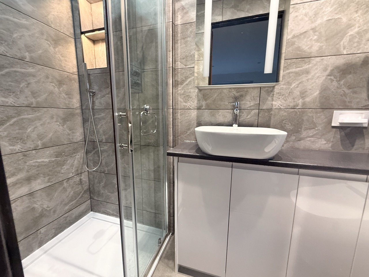 Fully tiled walls and floors, finished with epoxy grout, make cleaning quicker and easier — ideal for a household where the bathroom is used constantly. The UPVC ceiling with downlights brightens the room while being moisture-resistant and low maintenance. An inline extractor fan helps control condensation more effectively, protecting the space long term.