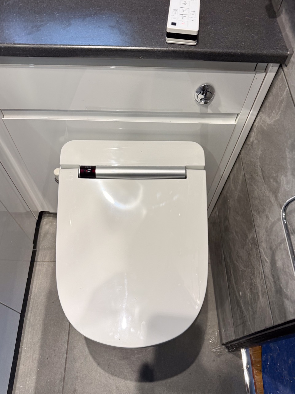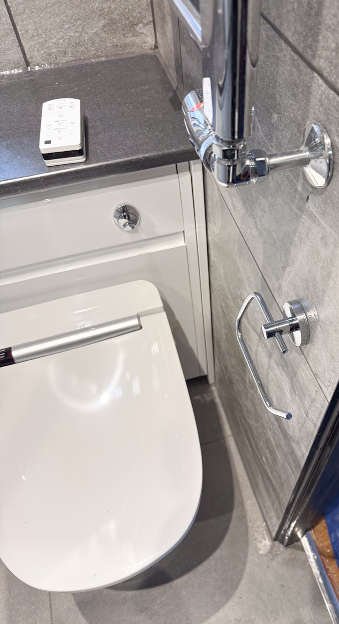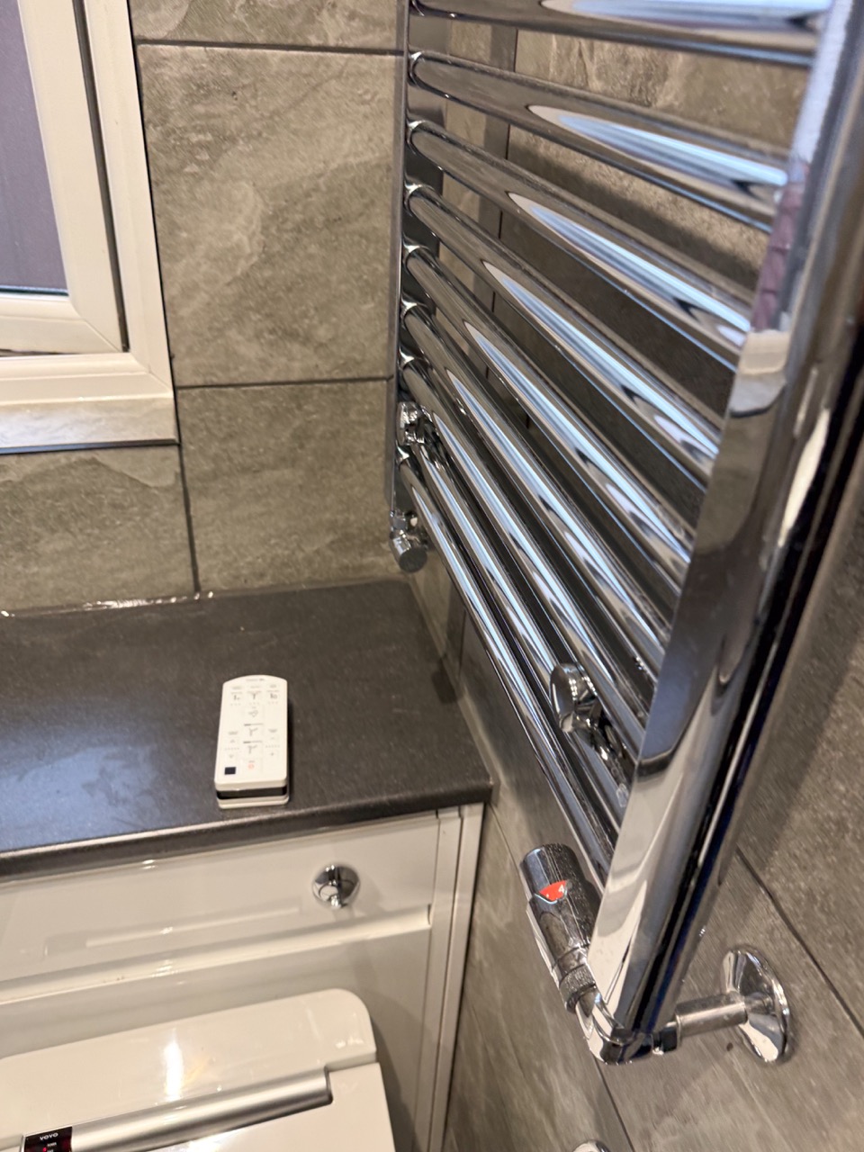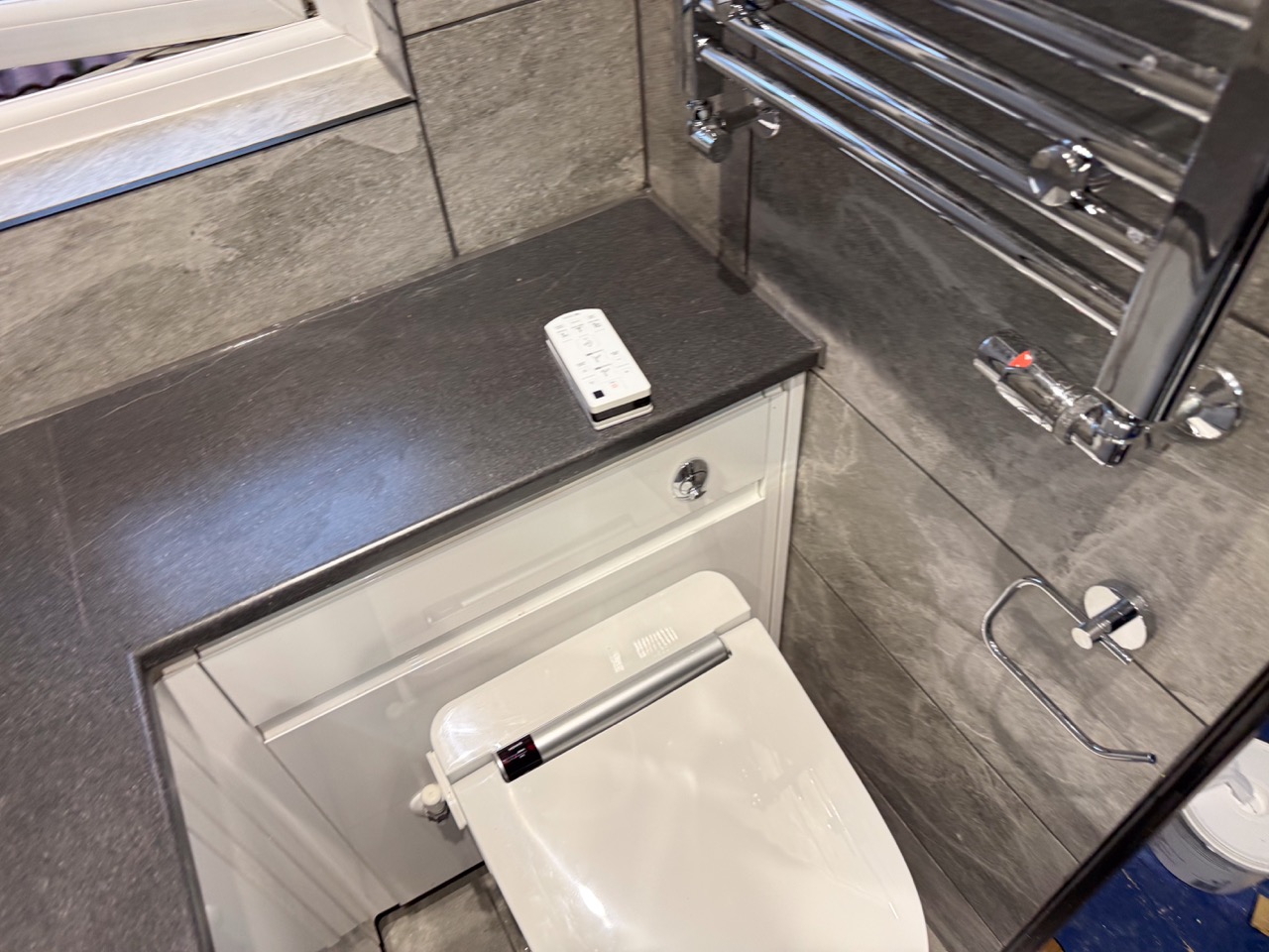 The towel radiator was fitted higher on the wall to maximise usable space, ensuring warm towels without compromising storage. A concealed shower keeps the design clean and streamlined, and the smart toilet adds daily comfort and improved hygiene — small upgrades that make a noticeable difference over time.