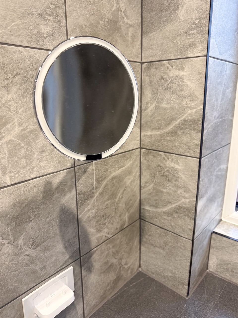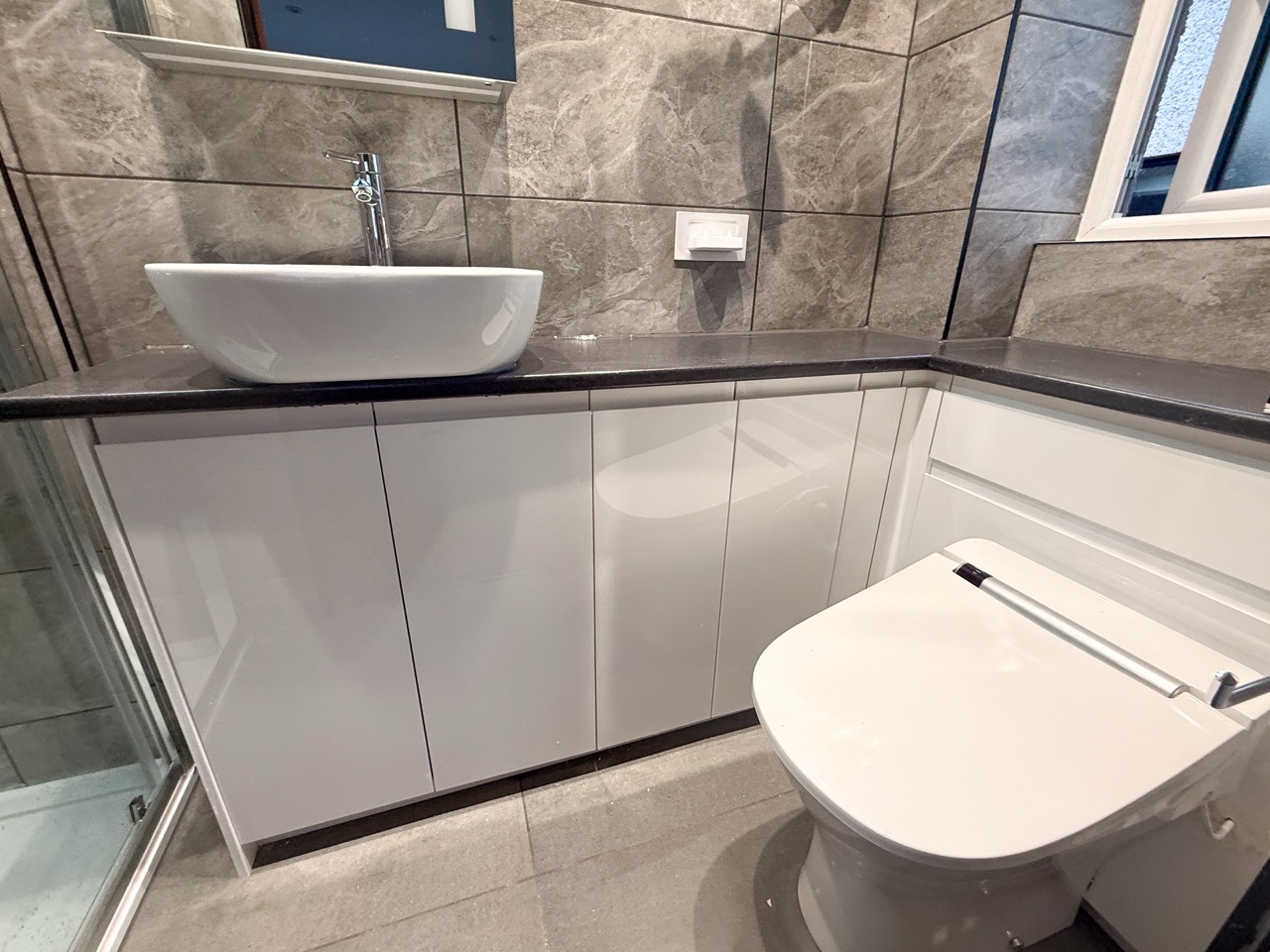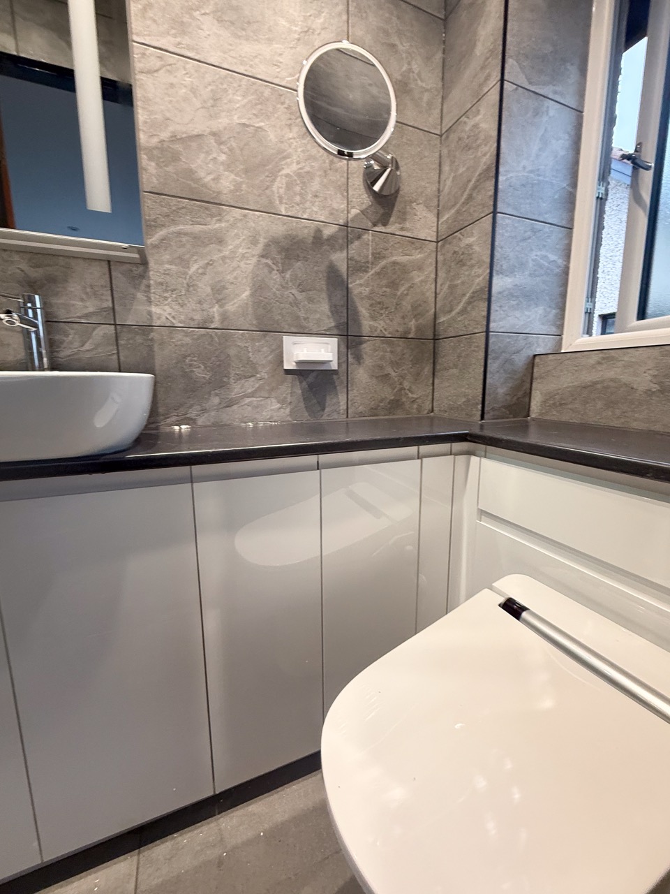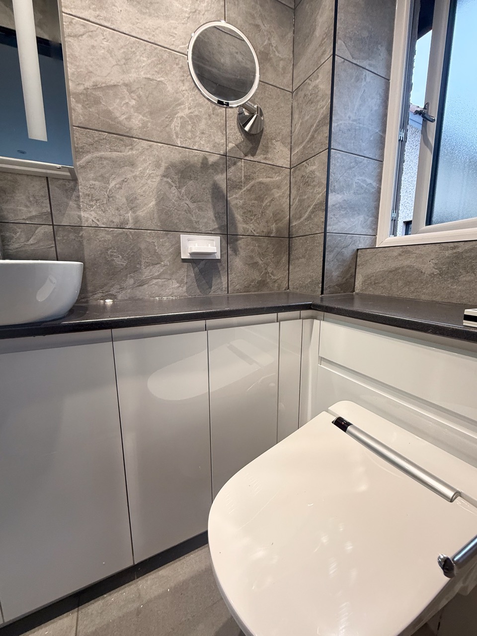 The towel radiator was fitted higher on the wall to maximise usable space, ensuring warm towels without compromising storage. A concealed shower keeps the design clean and streamlined, and the smart toilet adds daily comfort and improved hygiene — small upgrades that make a noticeable difference over time.