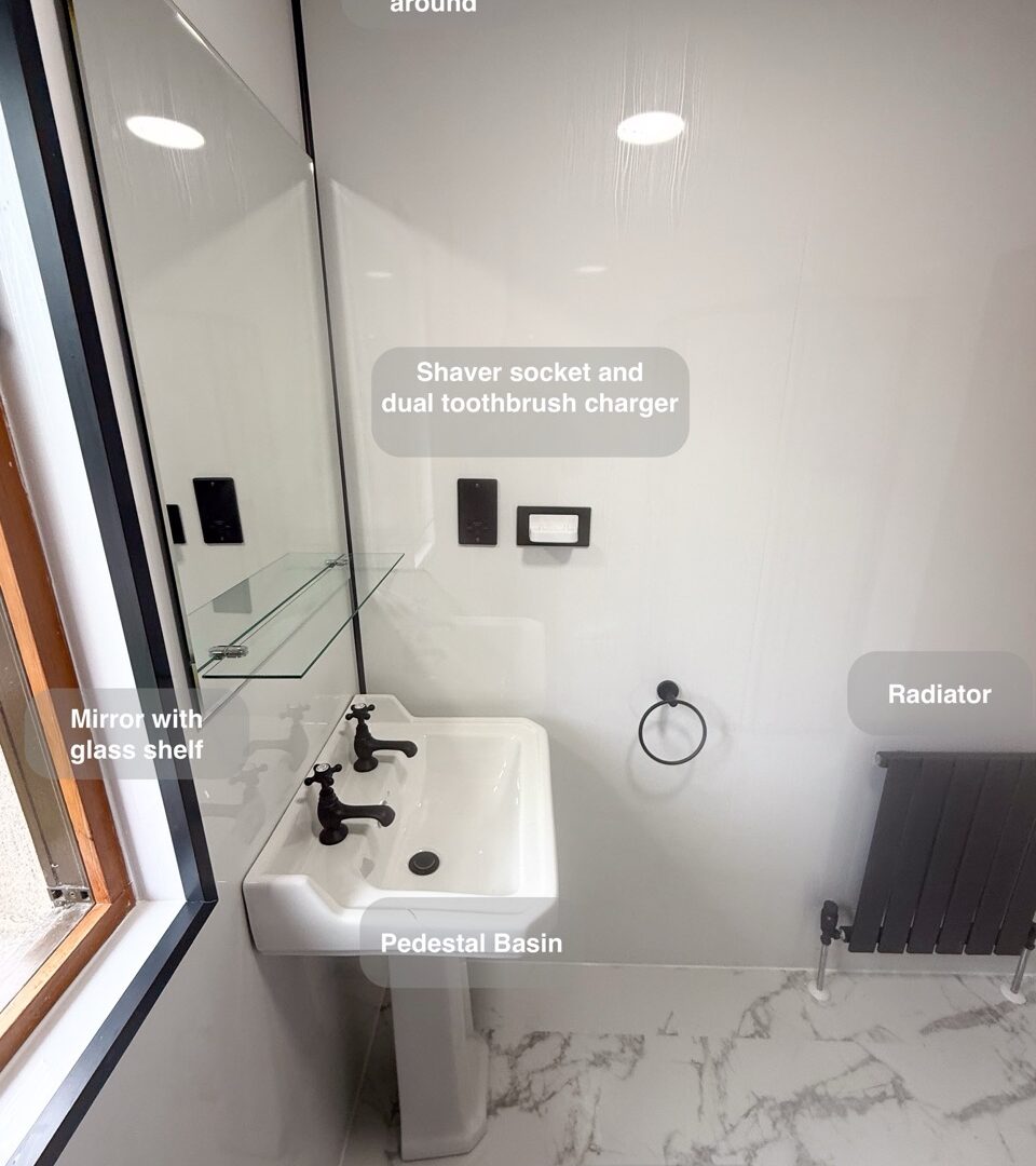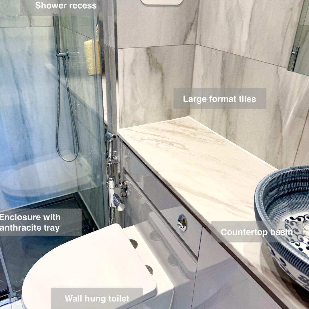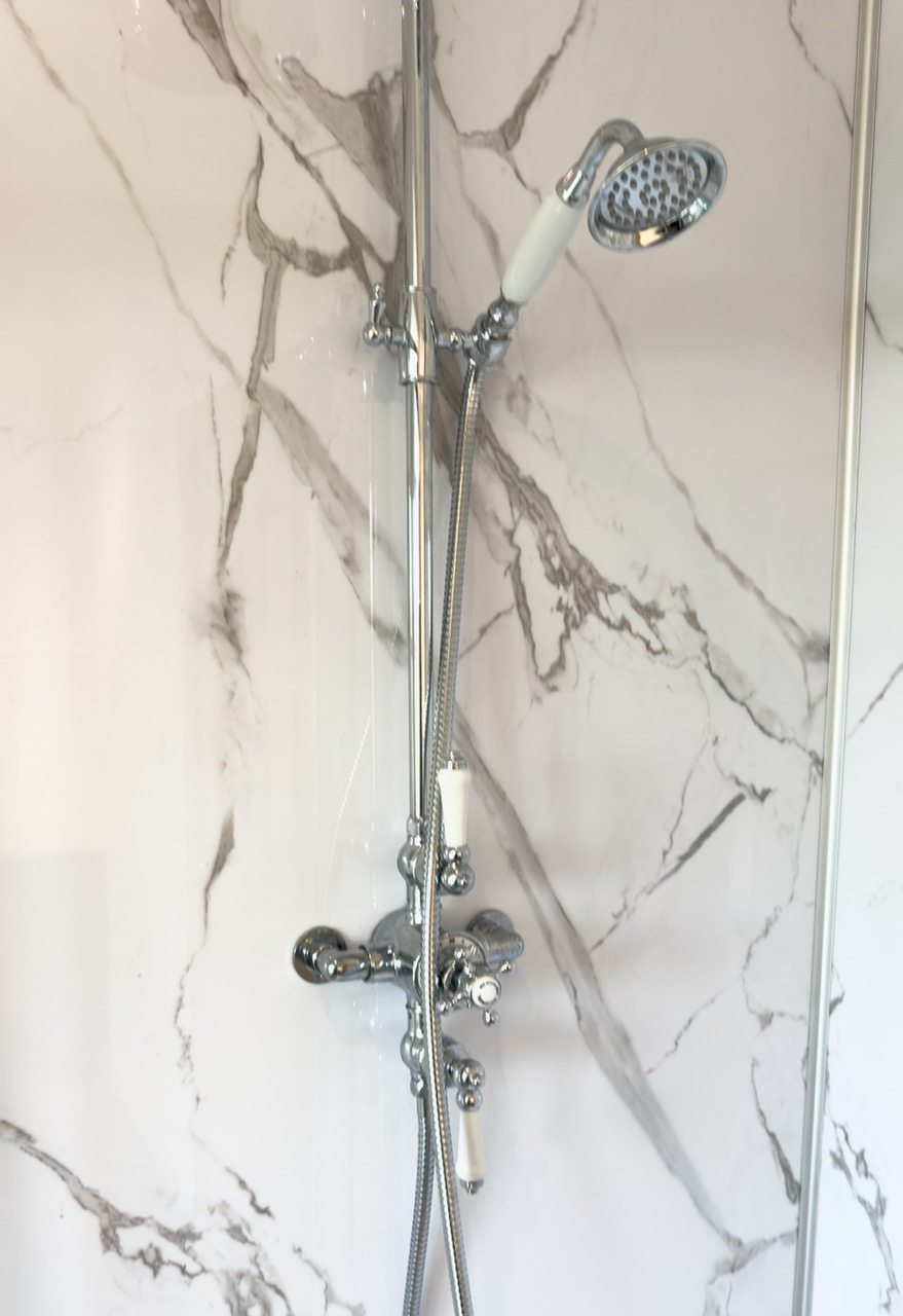 - Shower area – fitted with easy-clean panels, so no grout lines to maintain.