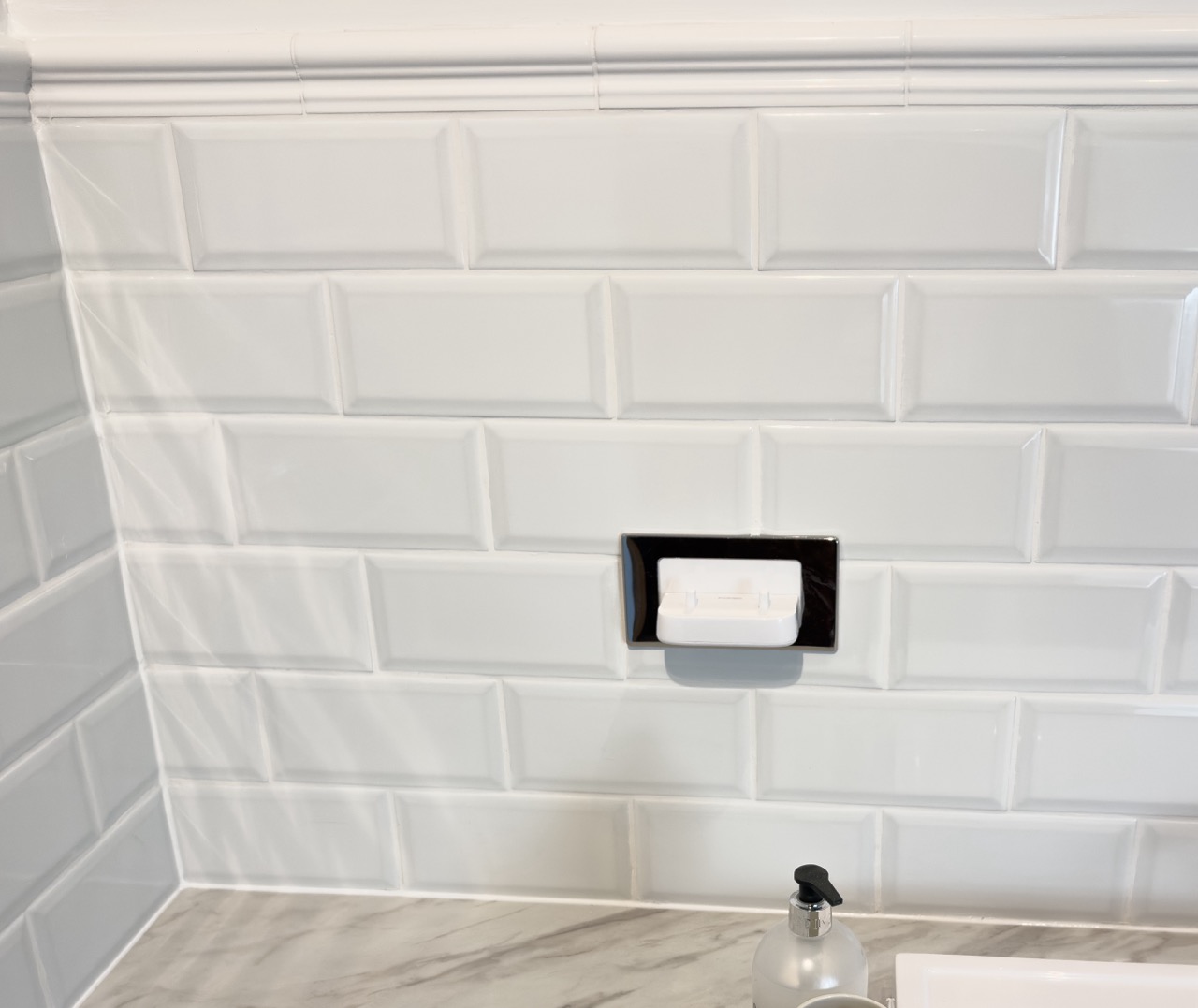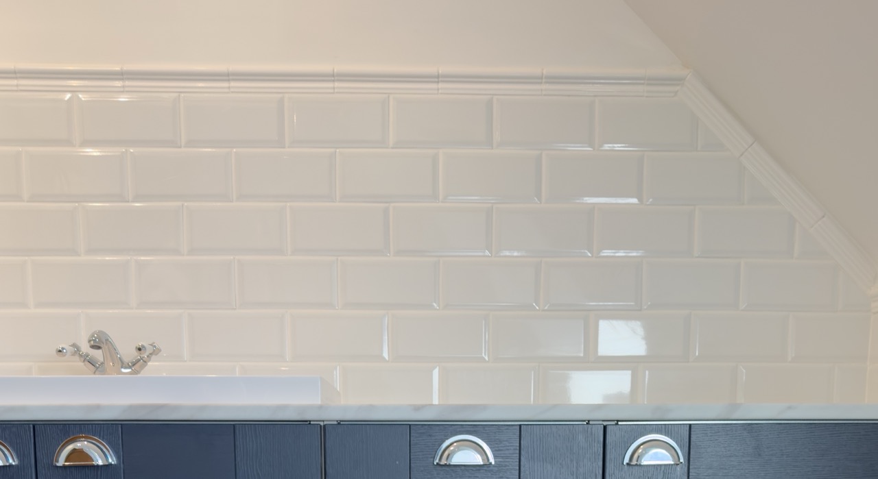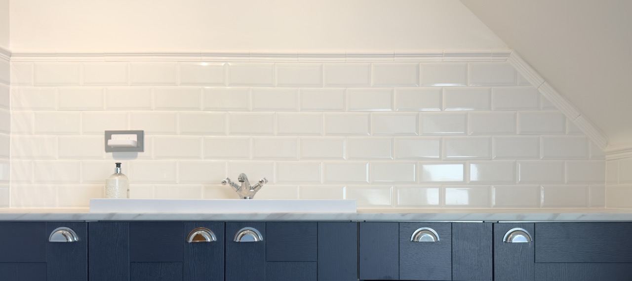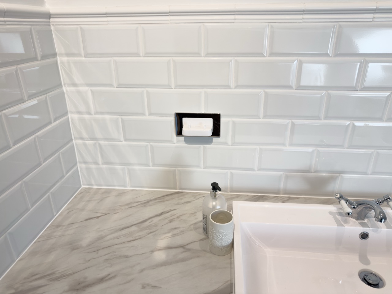 - Tile detail – metro tiles above the vanity and behind the toilet, finished with a border for a smart, polished look.