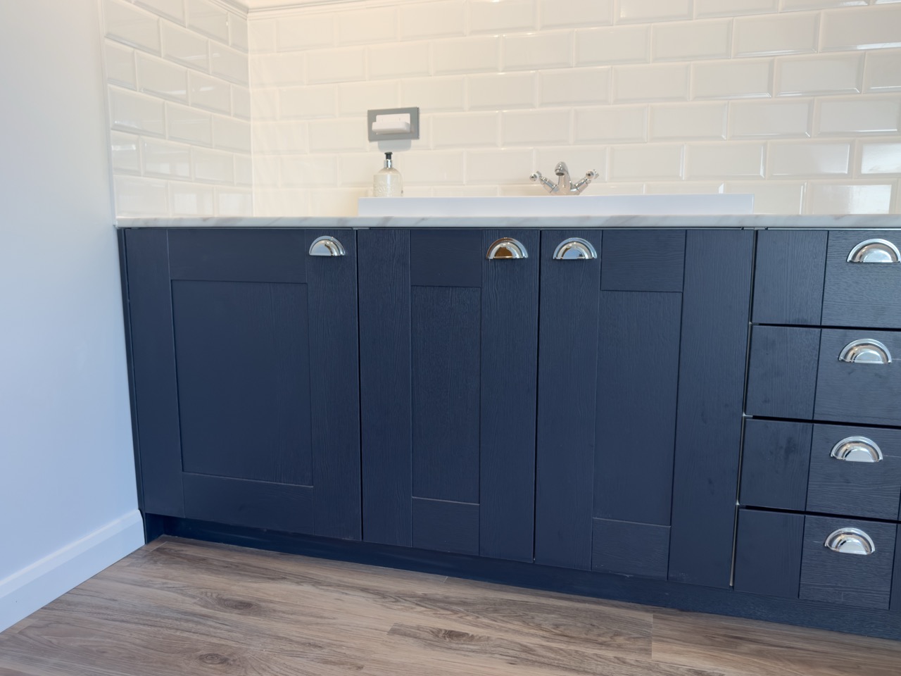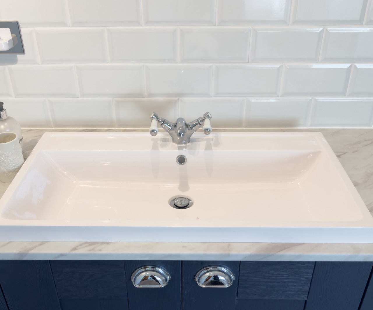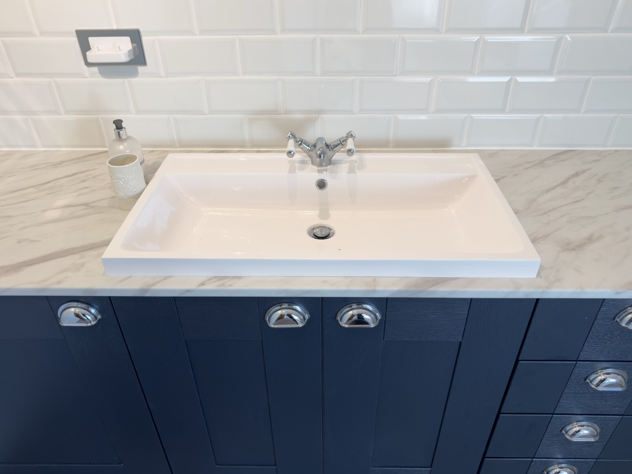 - Bespoke vanity – custom fitted at 600mm deep, with four drawers to give plenty of storage and keep everything neat.