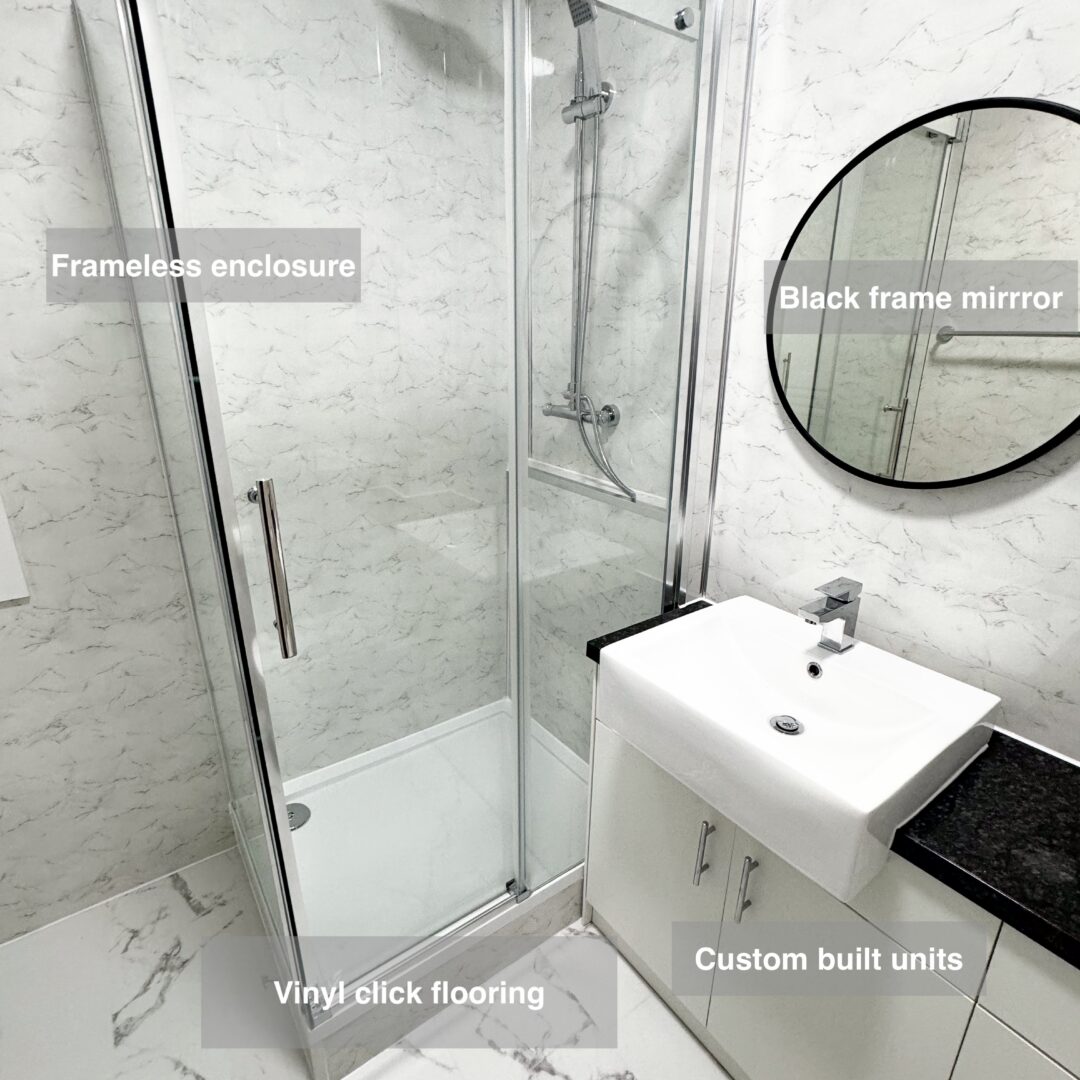 This full bathroom refurbishment offers a perfect blend of style and practicality. Custom-fitted units provide ample storage, keeping the space organised and clutter-free. The durable vinyl click flooring ensures easy…
