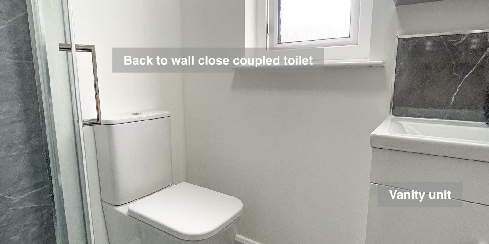 • Vanity Unit & LED Mirror: Offers storage with bright, space-enhancing lighting.