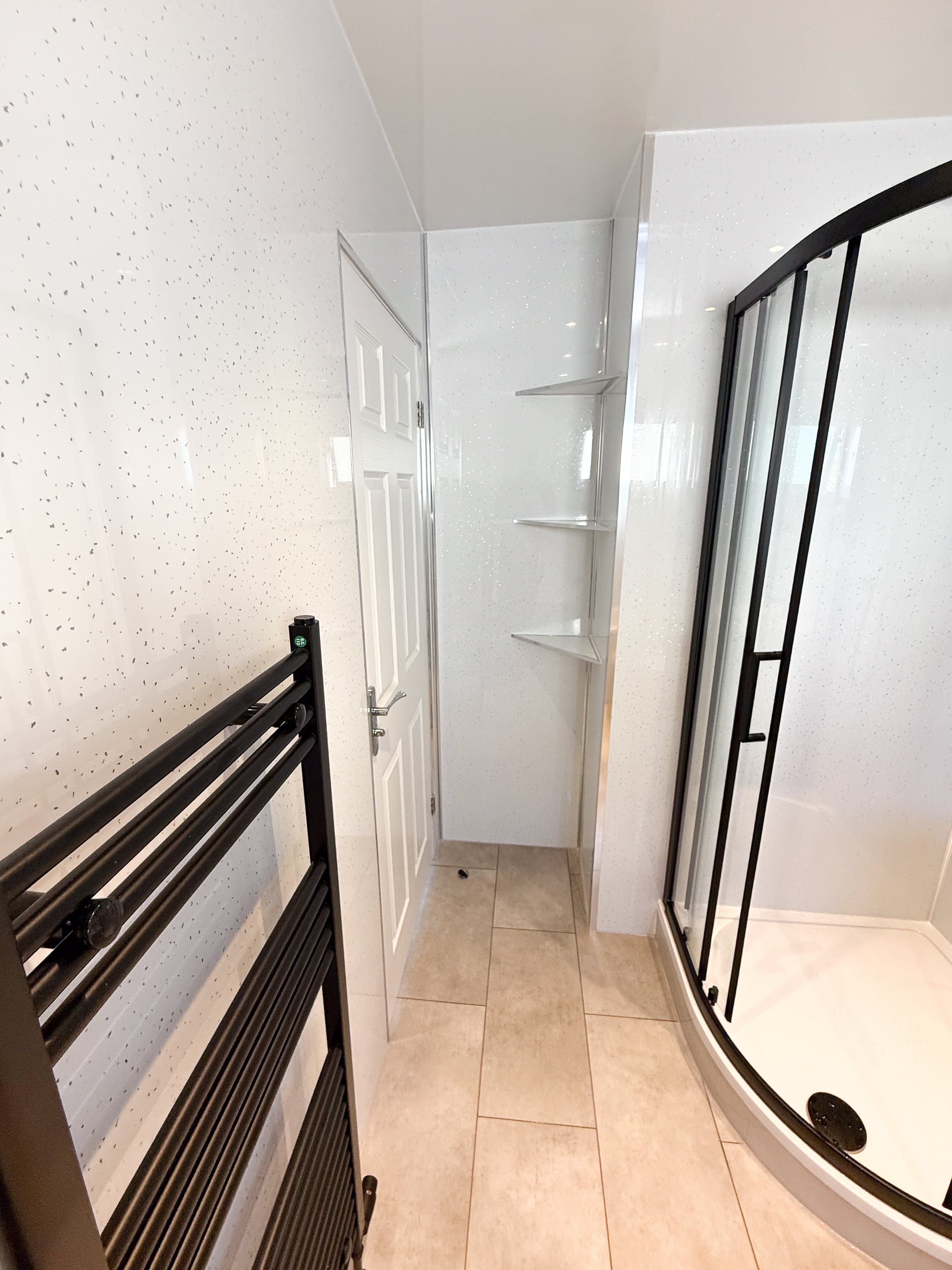 We’ve transformed this bathroom with a full refurbishment, including tile flooring for easy maintenance, and sleek L-shaped handleless units in light grey for a clean, modern look. The shower area…