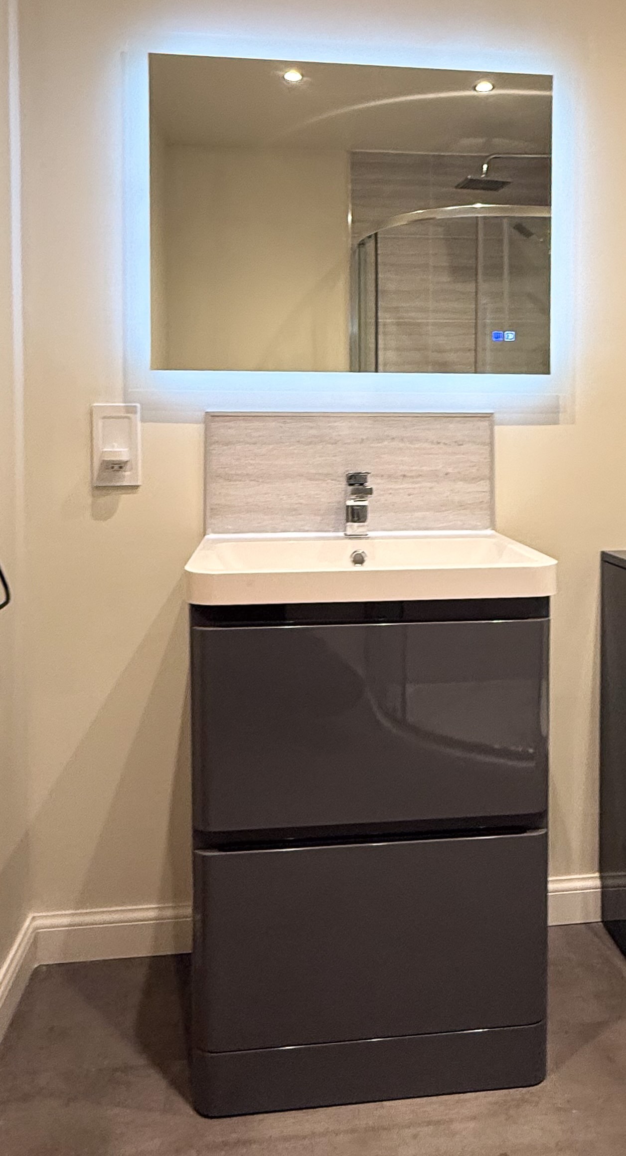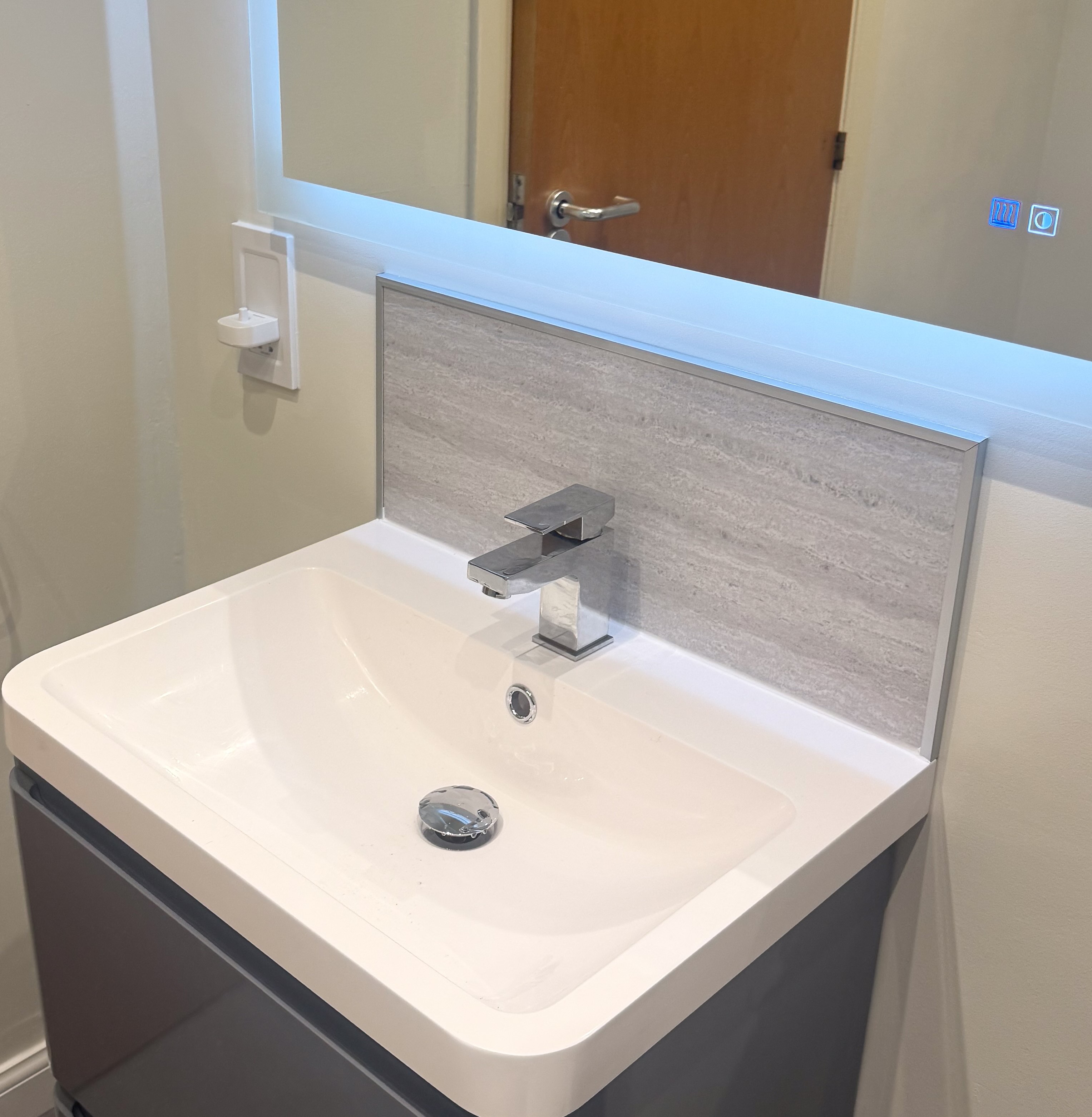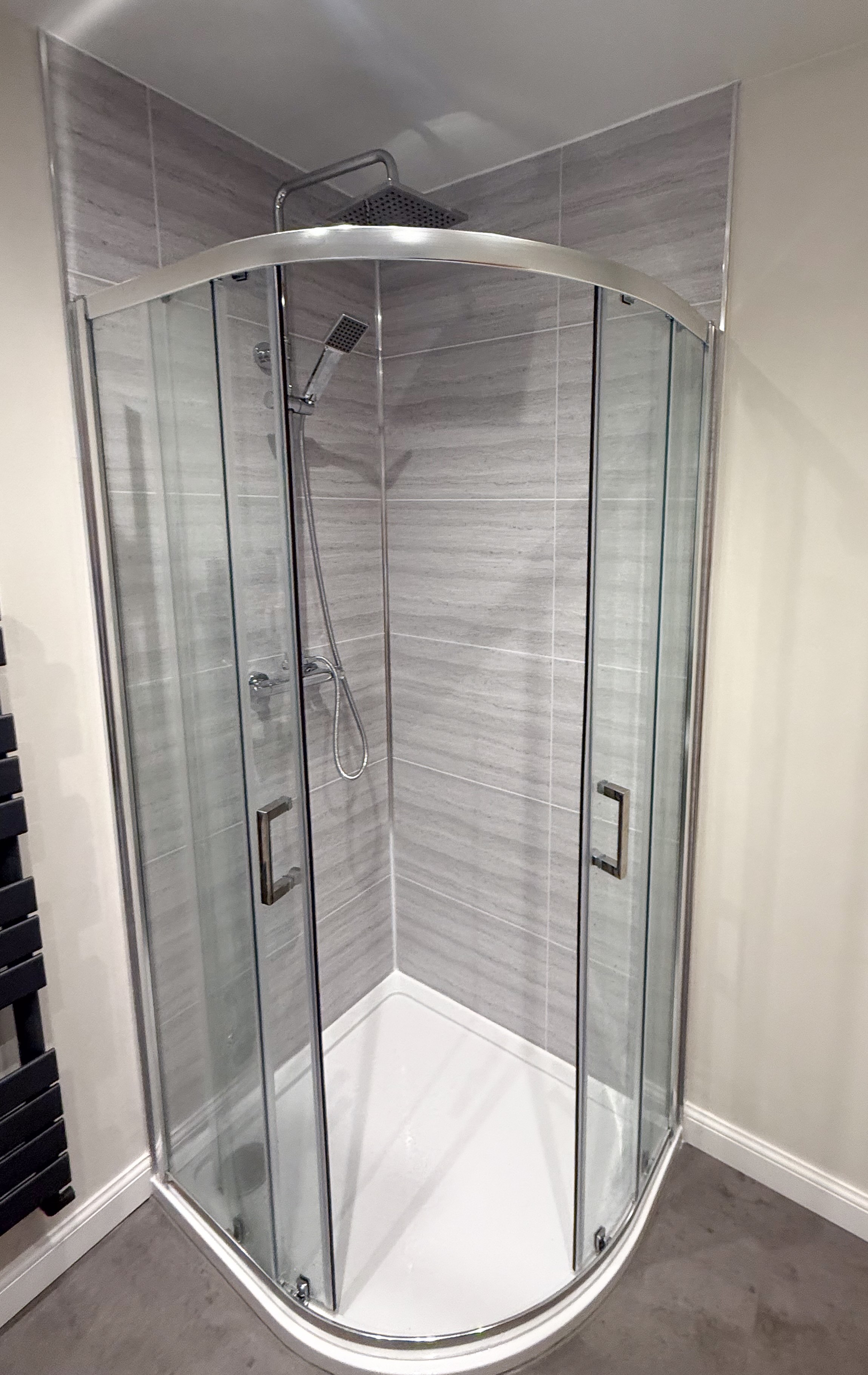Full refurbishment designed to create a cleaner, more minimal look that is easier to maintain day to day. Features include an 800×1000 quadrant shower enclosure, thermostatic shower, tile-effect panels, painted walls, vinyl click flooring, downlights, towel radiator, new radiator, LED mirror, and a built-in toothbrush charger.