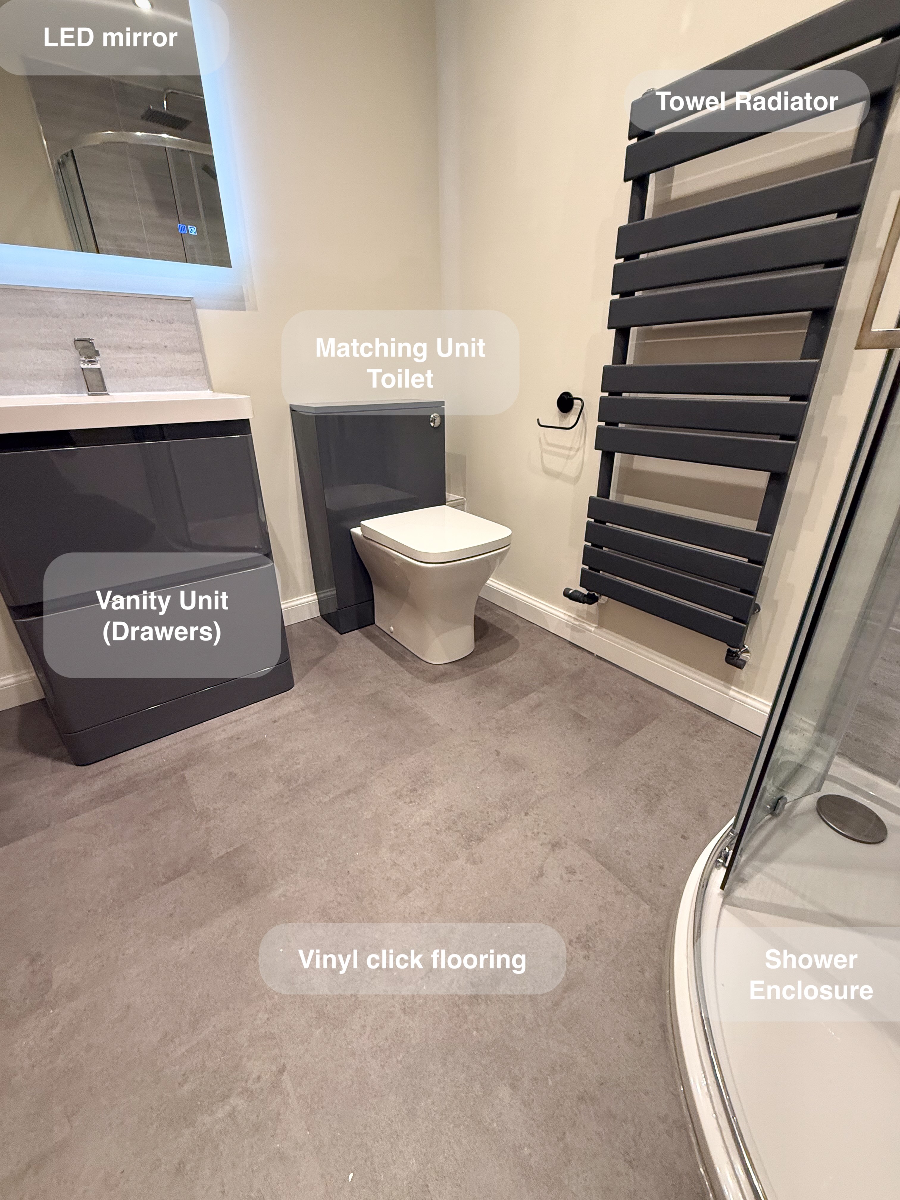 A full bathroom redesign where we installed a sleek shower enclosure, repositioned the shower door for better access, and fitted stylish units along the toilet wall. The transformation also includes a modern LED mirror, a wall-hung vanity unit with a countertop basin, and durable vinyl click flooring. We added a practical shower recess for extra storage, refreshed the space with a fresh coat of paint, and installed a thermostatic shower for precise temperature control. To complete the look, we fitted a contemporary towel radiator with neatly concealed pipework for a clean finish. Scan of the old room Plan https://youtube.com/shorts/9qunNL7sdIQ
