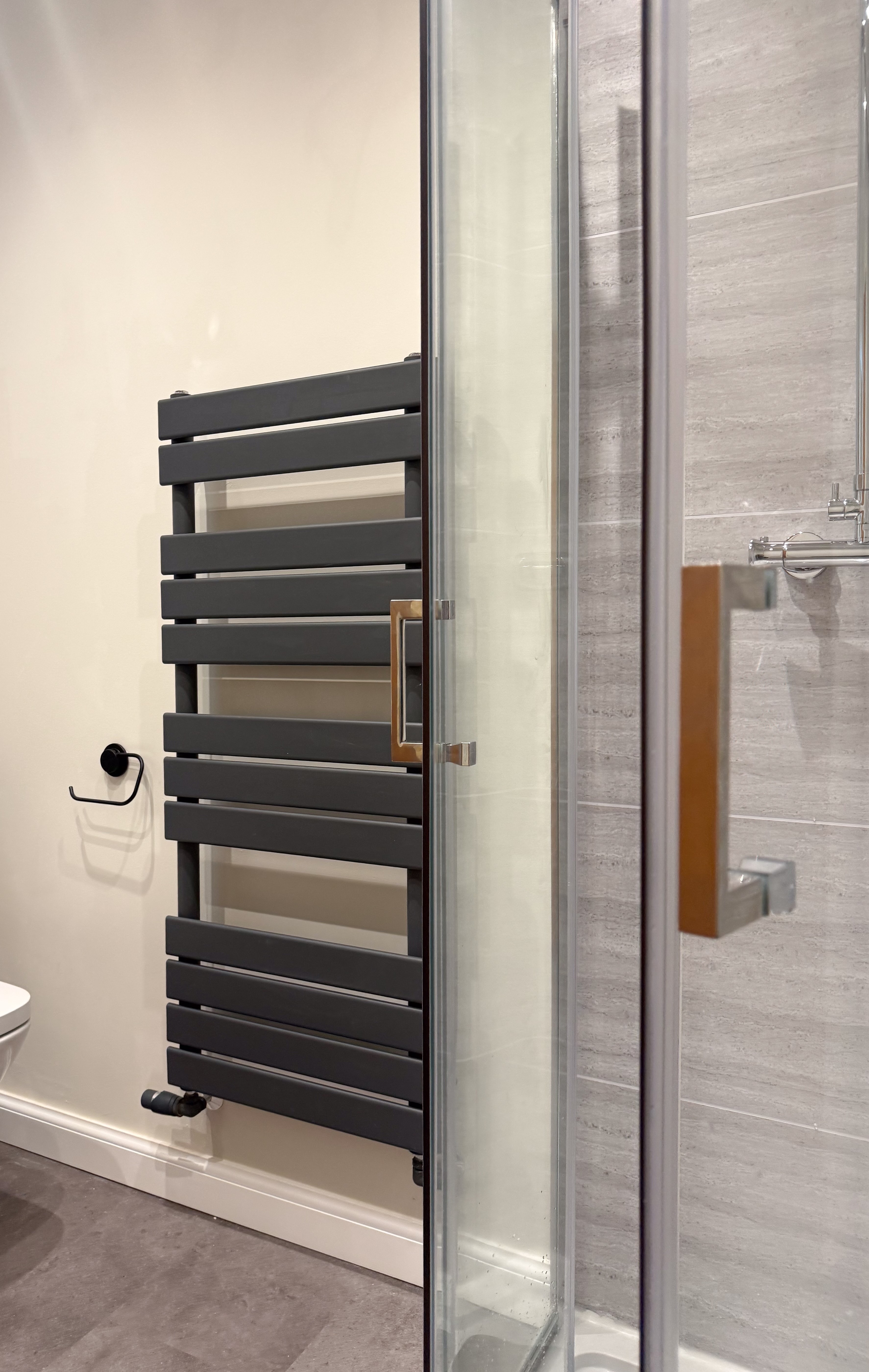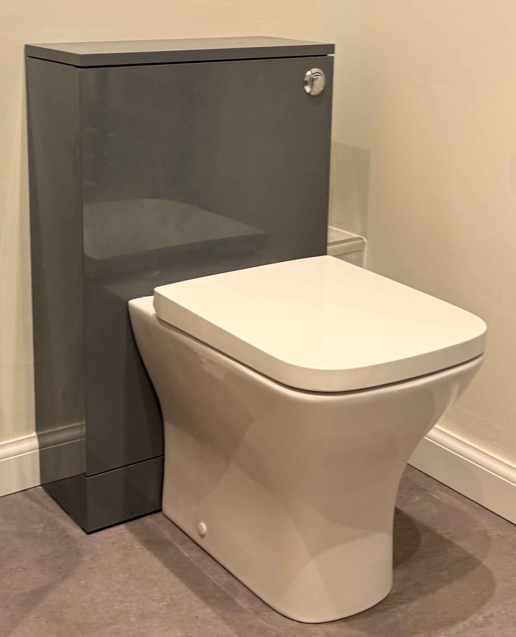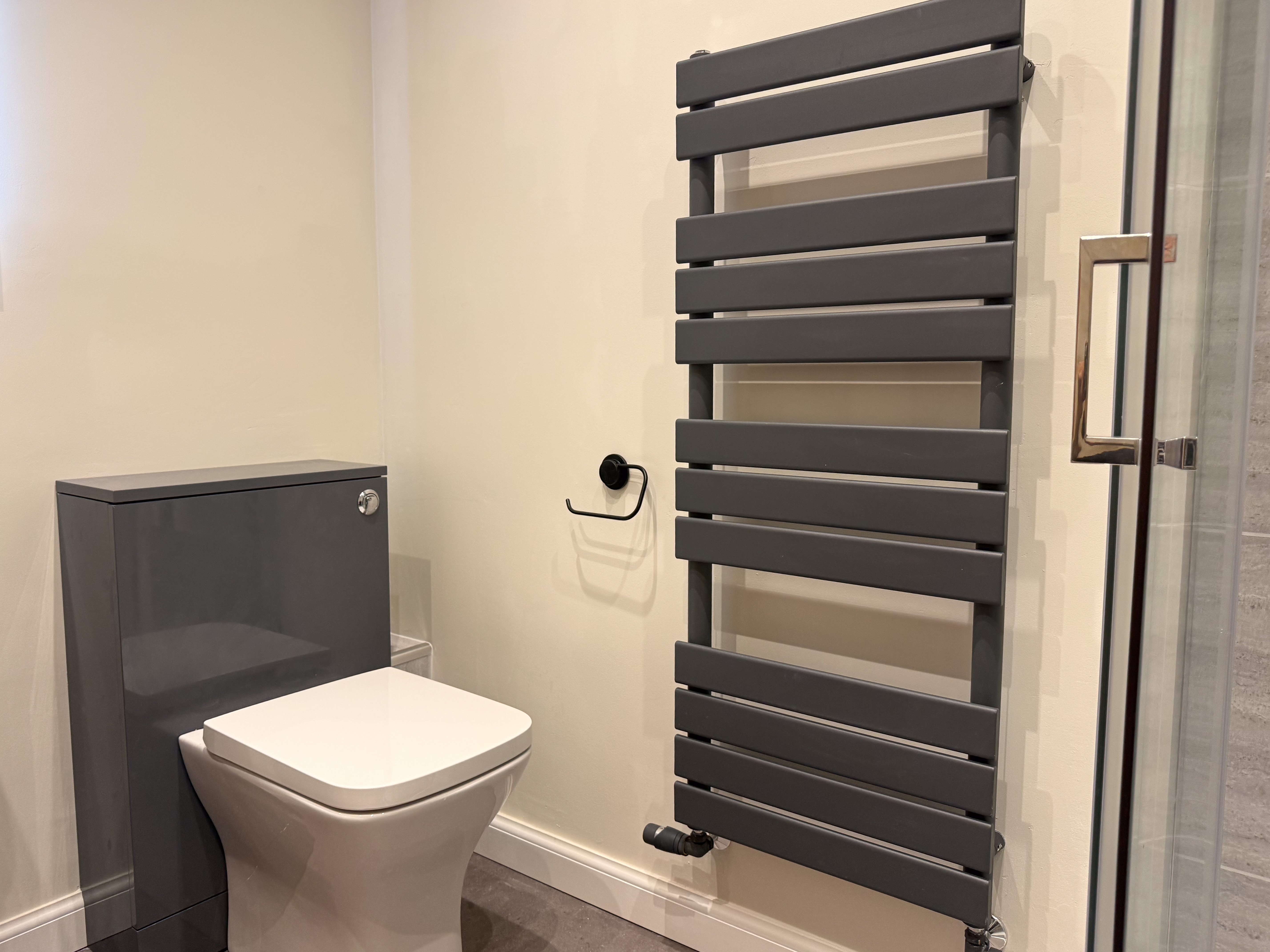 In this project the customer wanted to replace their old bathtub with a shower, gain extra storage, and keep the whole space easy to maintain. Before After Because of the size of the doorway, we were limited to a 700mm enclosure. We fitted a frameless screen with an anthracite tray to keep the look modern and uncluttered. To increase storage, we moved the toilet onto the shower wall and added L-shaped units, which make the best use of space while providing plenty of cupboard room. Other features include: A large towel radiator with concealed pipework from the wall – perfect…