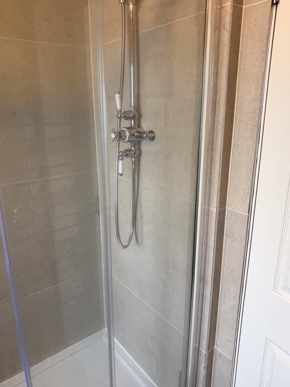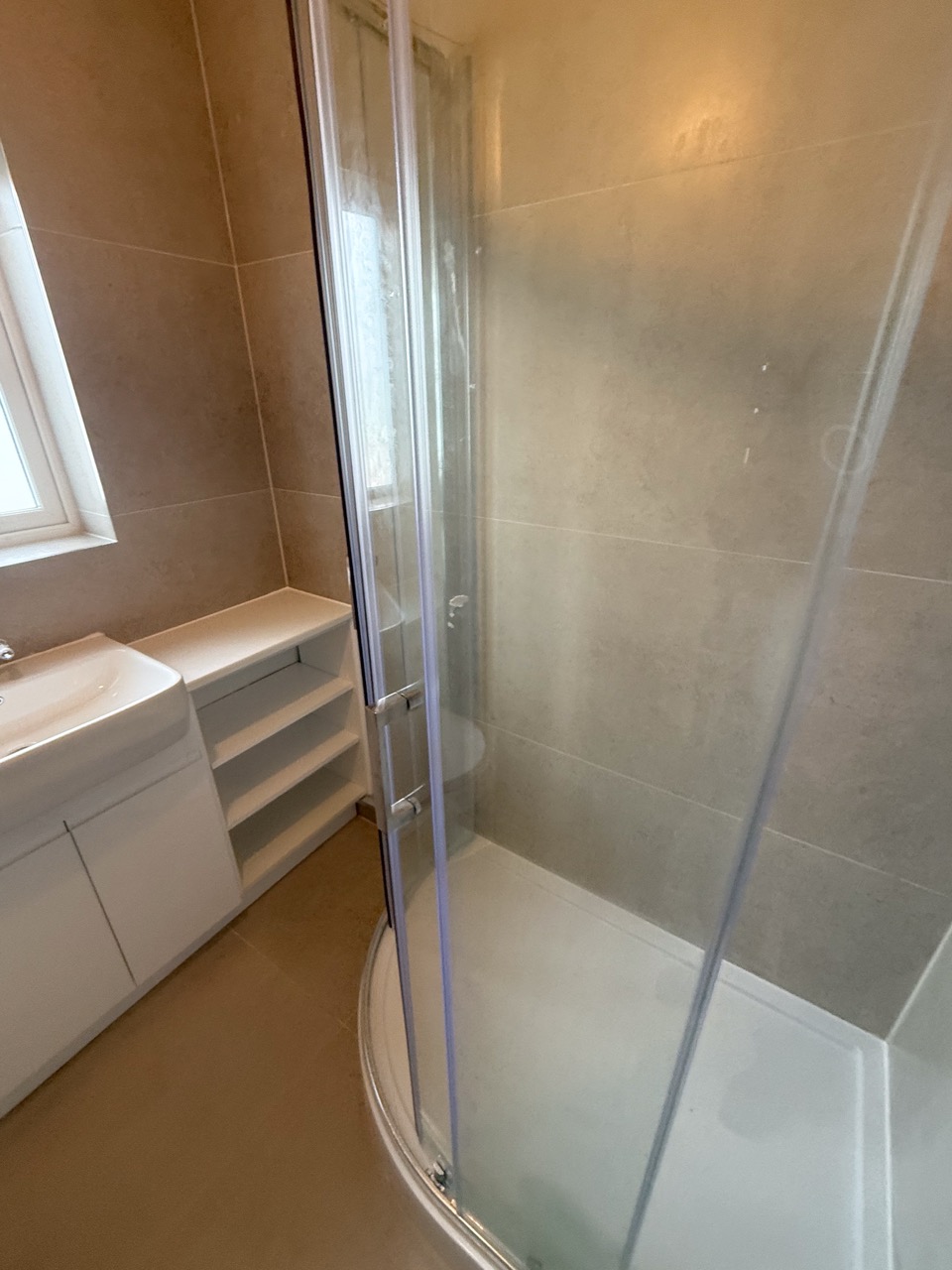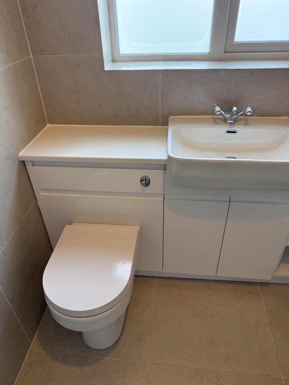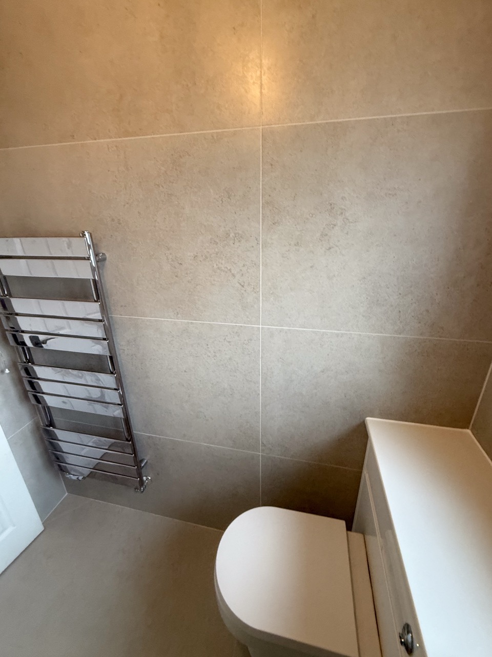 We redesigned the layout to create a comfortable, easy-access shower within a quadrant enclosure, making daily routines simpler and safer. Large format tiles with epoxy grout were used throughout, giving the bathroom a clean, modern look while keeping maintenance to a minimum.