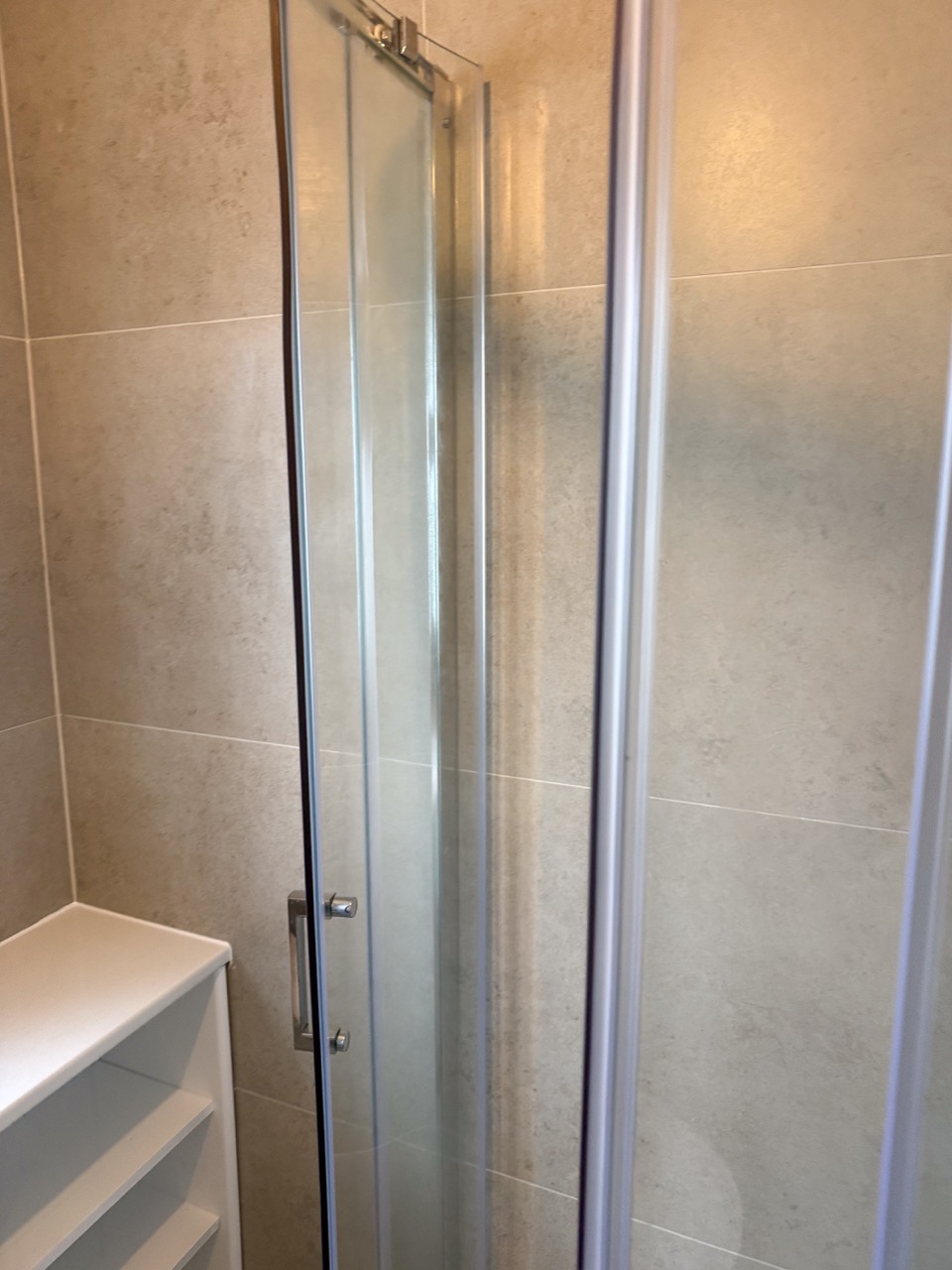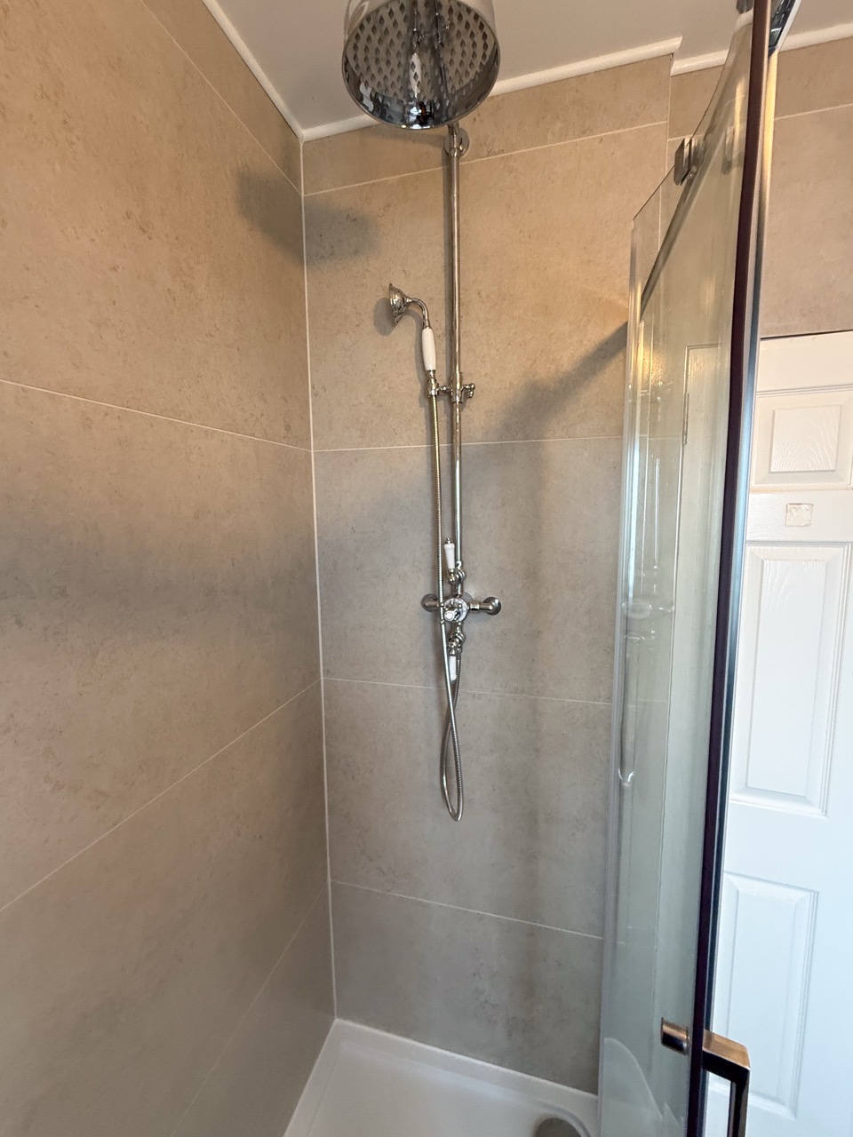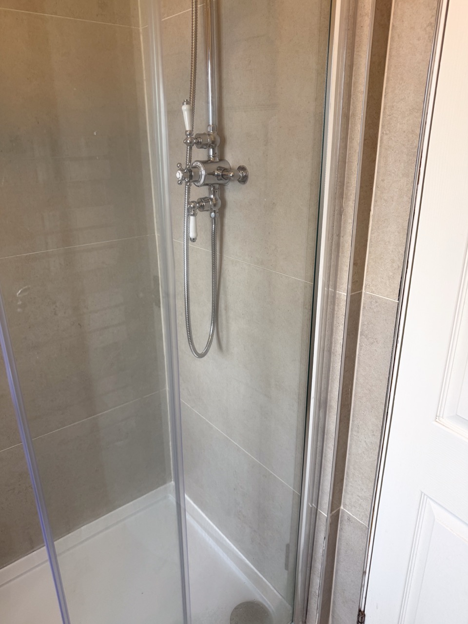 We redesigned the layout to create a comfortable, easy-access shower within a quadrant enclosure, making daily routines simpler and safer. Large format tiles with epoxy grout were used throughout, giving the bathroom a clean, modern look while keeping maintenance to a minimum.