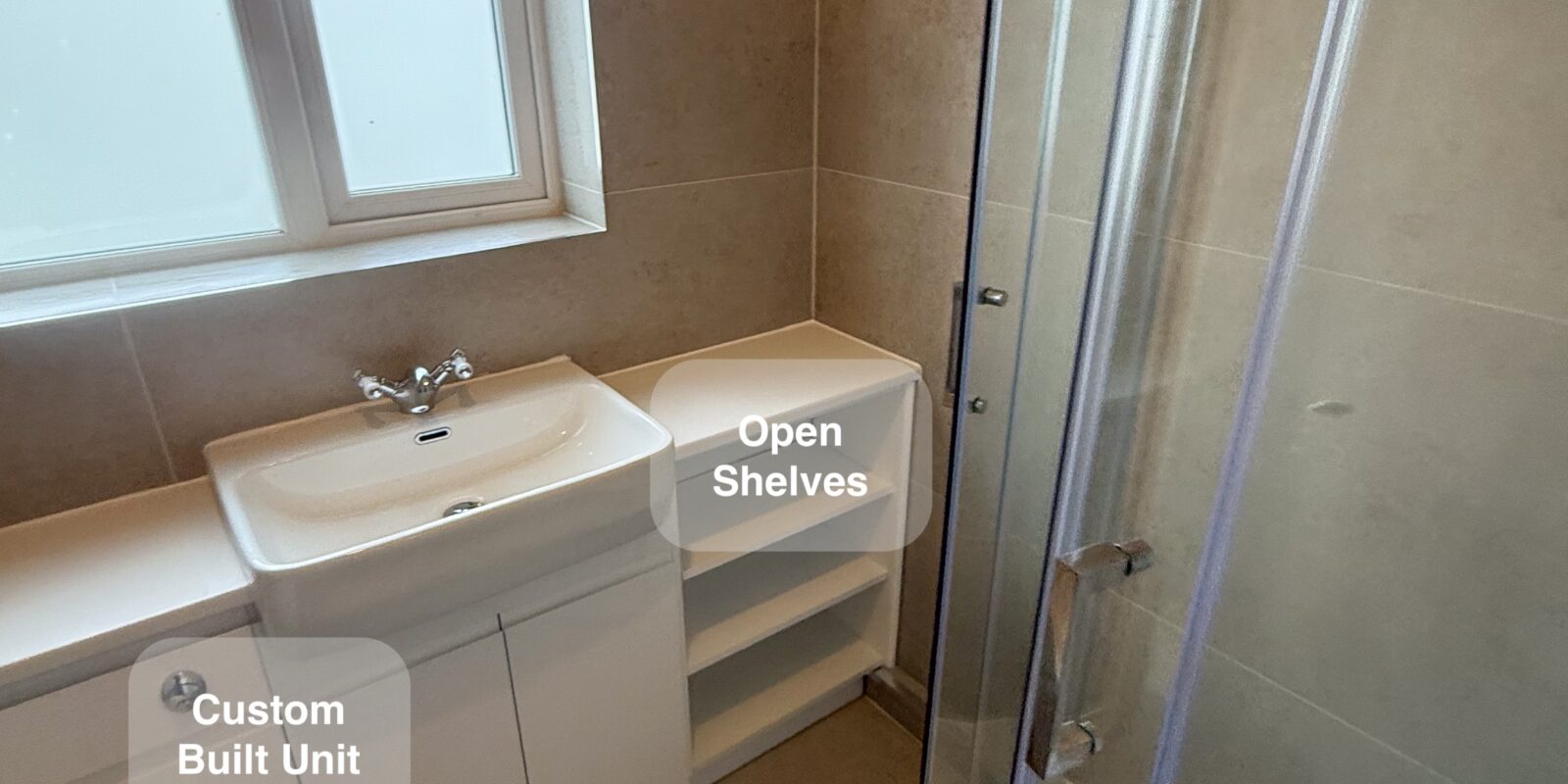 Custom-built units now provide much-needed storage, with open shelves positioned for easy reach from the shower – ideal for everyday essentials without clutter. A large towel radiator finishes the space, ensuring warm, dry towels and adding a sense of comfort after every shower.