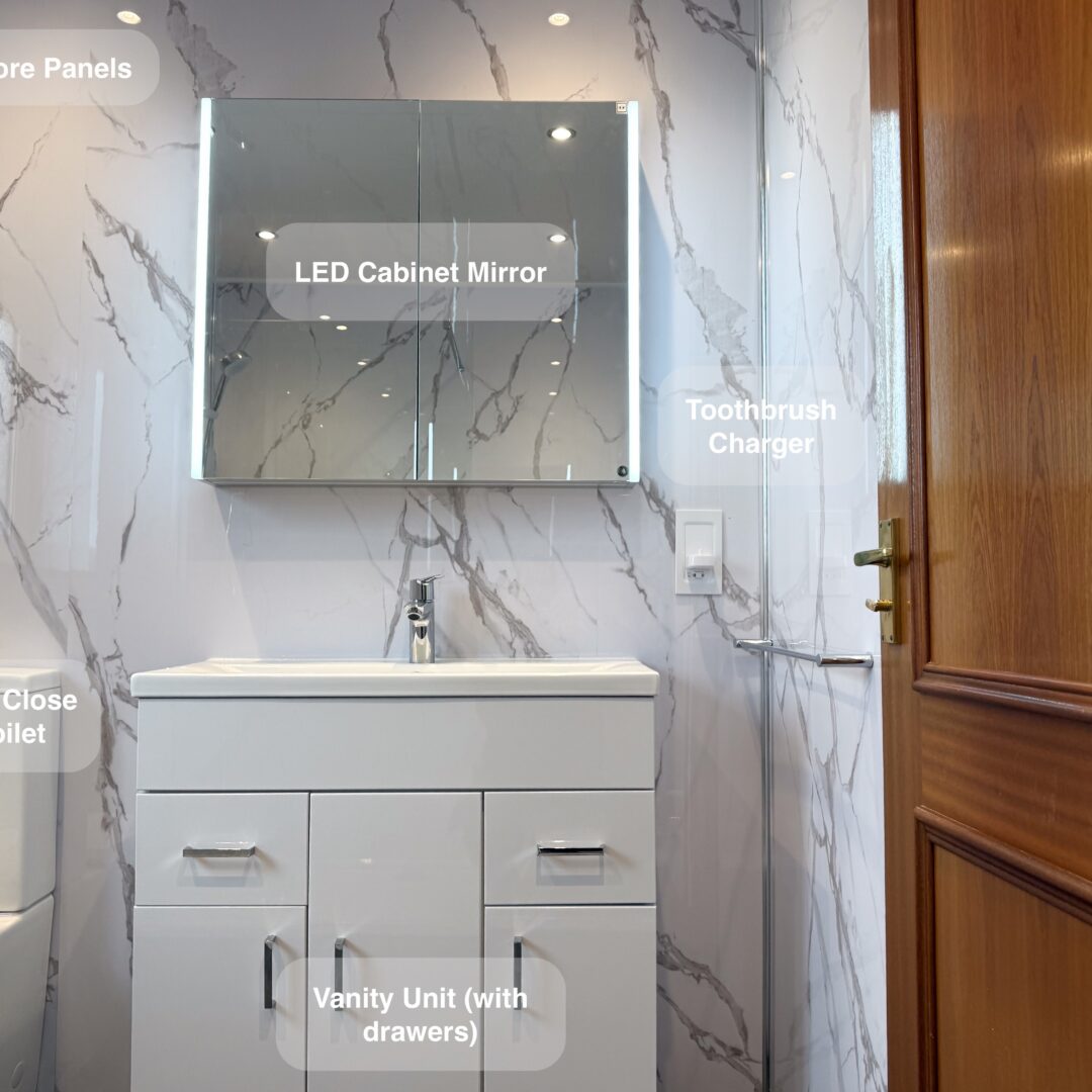 In this transformation, the bathtub was replaced with a sleek shower enclosure, repositioning the shower to the opposite side for a more spacious layout. The radiator was strategically installed where the old taps once were, optimising the use of space. A stylish vanity unit and a close-coupled toilet were added, perfectly completing the room. Dark flooring was chosen to create a striking contrast, beautifully complemented by marble-effect panels for a touch of elegance.