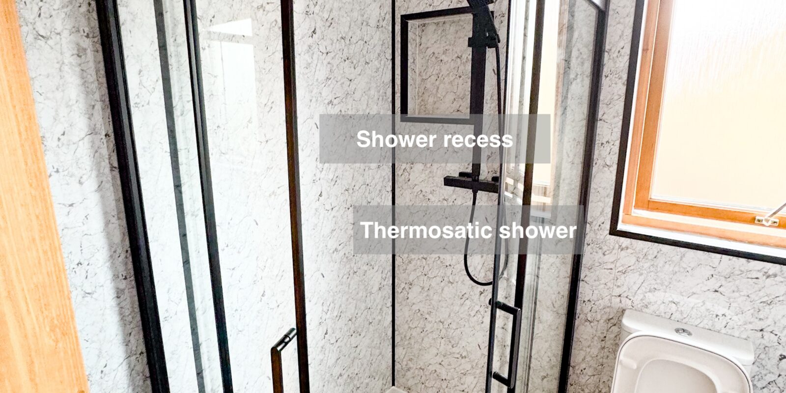 In this transformation, the bathtub was replaced with a sleek shower enclosure, repositioning the shower to the opposite side for a more spacious layout. The radiator was strategically installed where the old taps once were, optimising the use of space. A stylish vanity unit and a close-coupled toilet were added, perfectly completing the room. Dark flooring was chosen to create a striking contrast, beautifully complemented by marble-effect panels for a touch of elegance.
