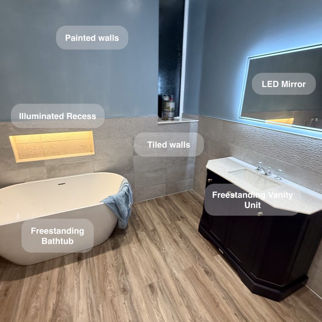Our solution was to carefully redesign the room by creating discreet stud walls and a built-in cupboard to neatly house the services and support the vanity unit. We used classic subway tiles in the shower area, with half-height tiling around the rest of the room to keep it feeling open and balanced. Inside the shower, two illuminated recessed niches add both style and everyday convenience, while the tiled floor ties the whole space together for a cohesive, easy-to-maintain finish.