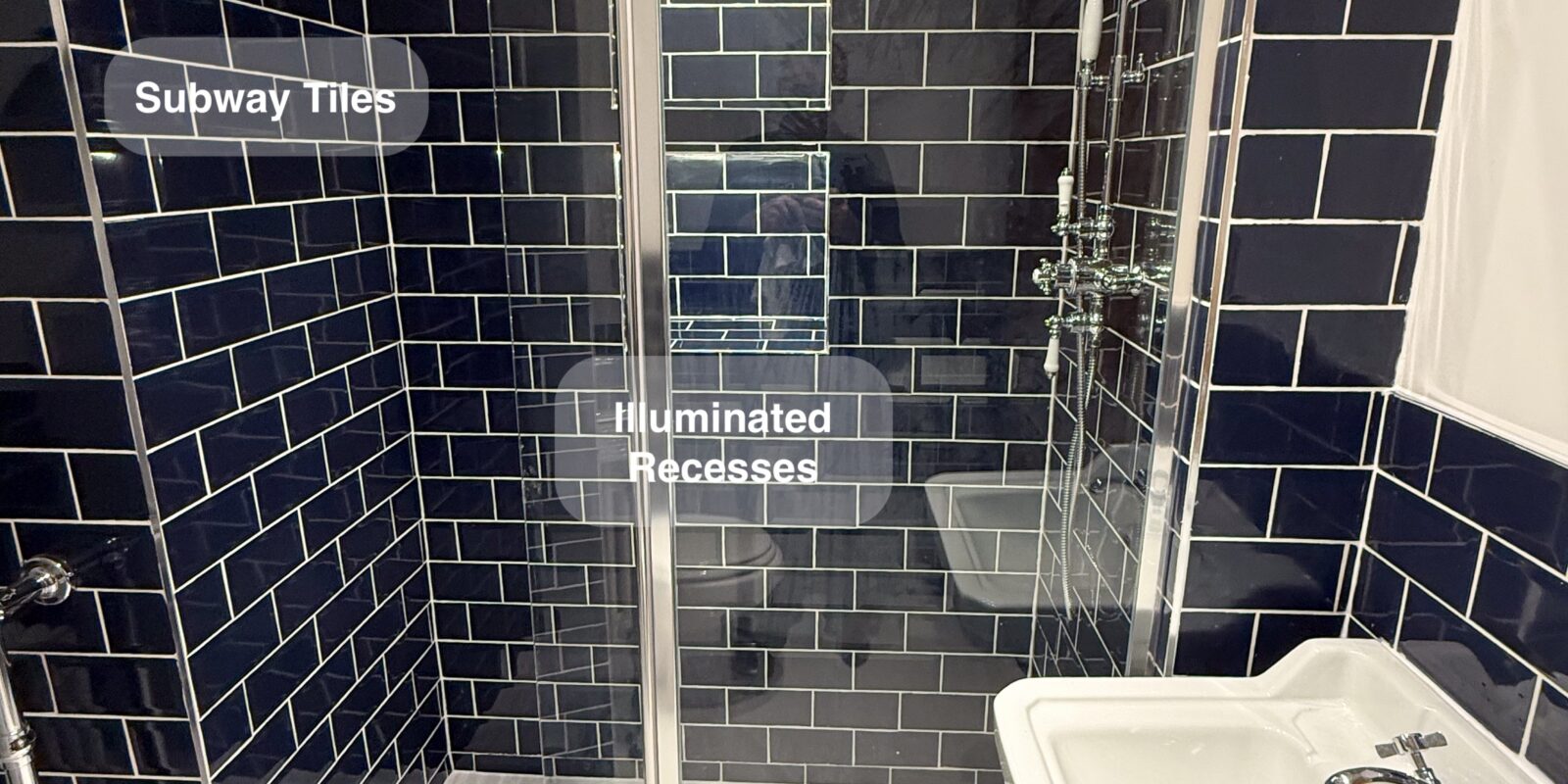 Our solution was to carefully redesign the room by creating discreet stud walls and a built-in cupboard to neatly house the services and support the vanity unit. We used classic subway tiles in the shower area, with half-height tiling around the rest of the room to keep it feeling open and balanced. Inside the shower, two illuminated recessed niches add both style and everyday convenience, while the tiled floor ties the whole space together for a cohesive, easy-to-maintain finish.
