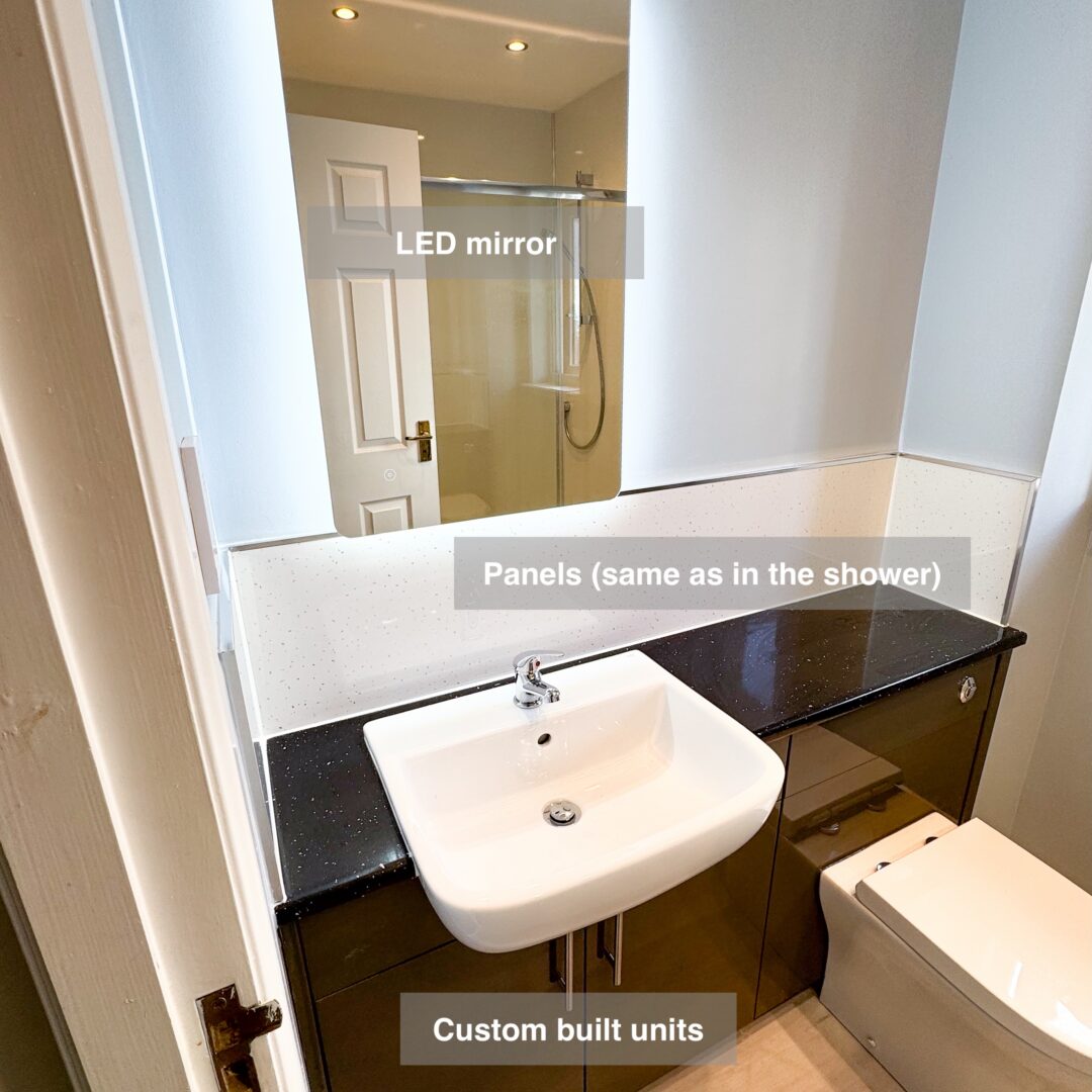 To maximise storage and keep the room looking uncluttered, we fitted custom-built units with an inset basin, plus an LED mirror for brighter, more functional lighting. A towel radiator with wall-fed pipework keeps everything looking neat and streamlined.
