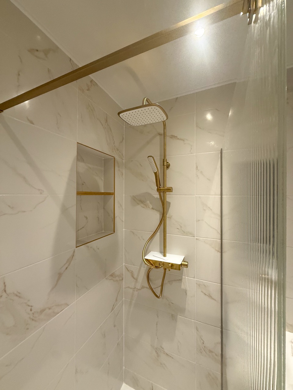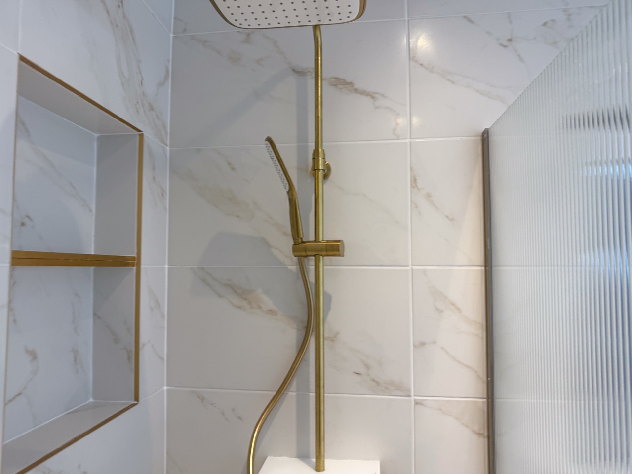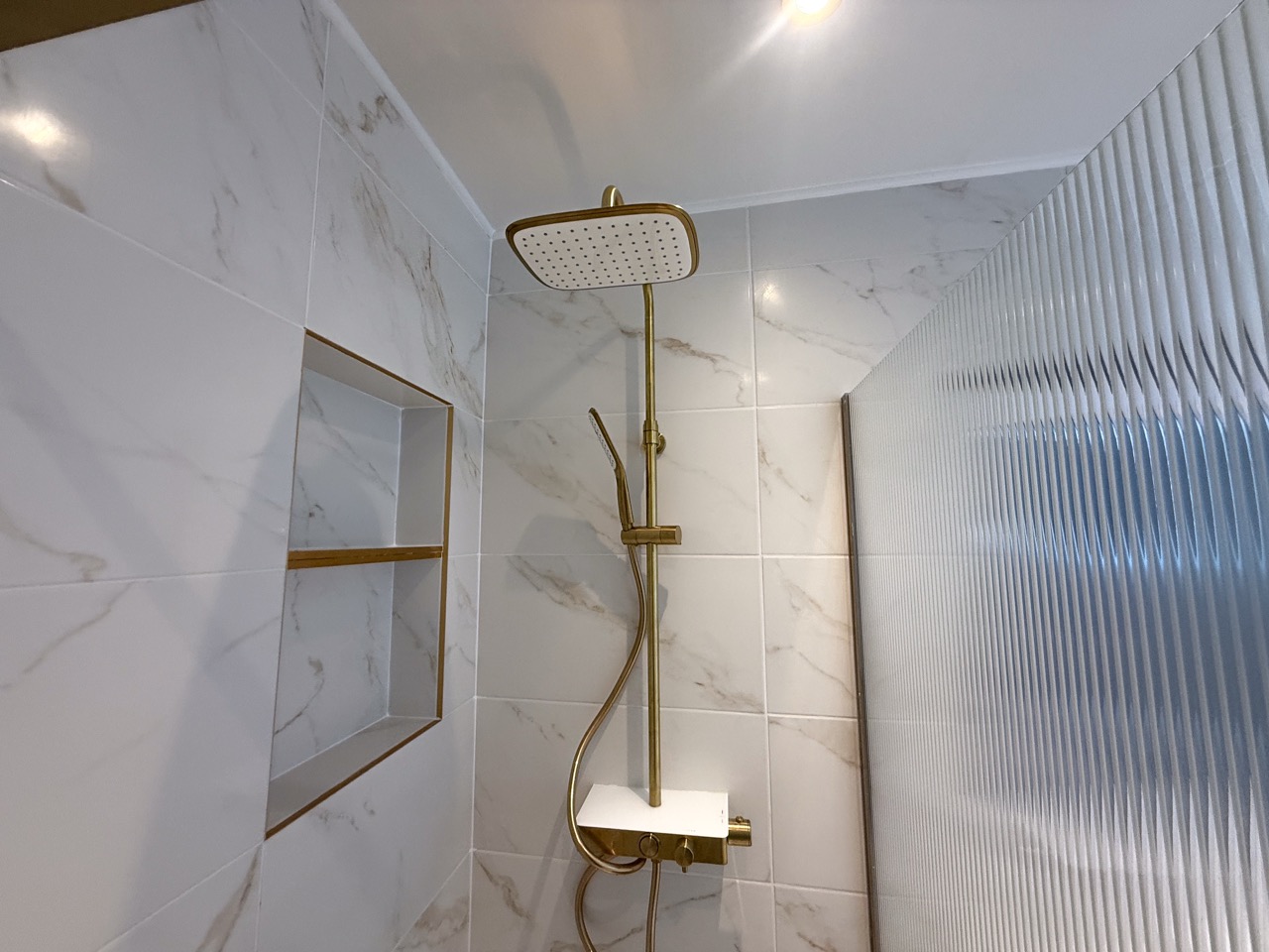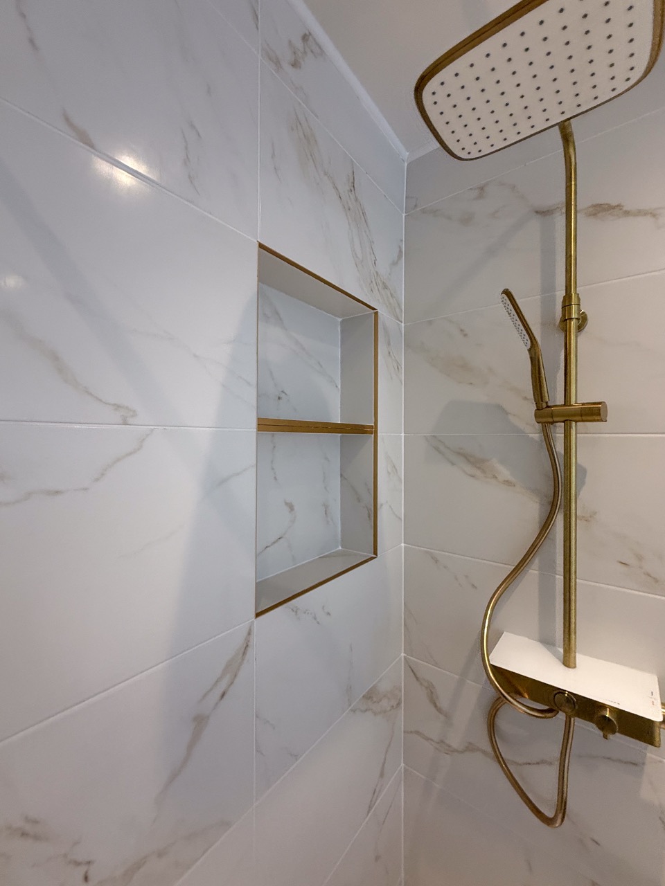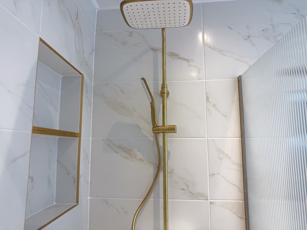 The bathroom was fully tiled on both walls and floor, finished with epoxy grout for a cleaner look and easier long-term maintenance. We also installed a practical shower recess for everyday storage, along with brass fittings and fluted glass to give the shower area a more premium, modern feel.