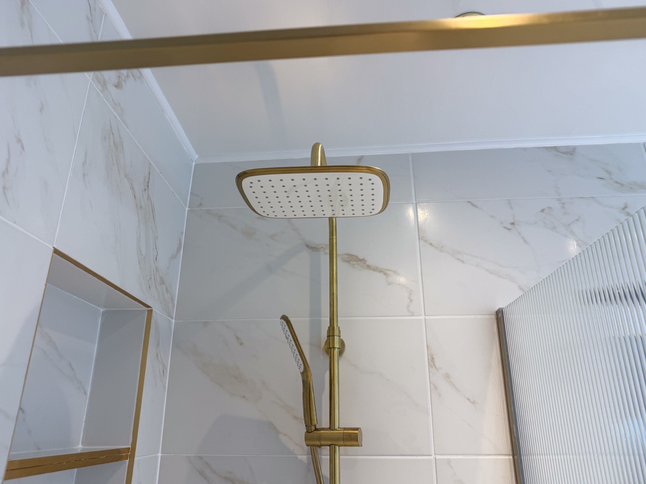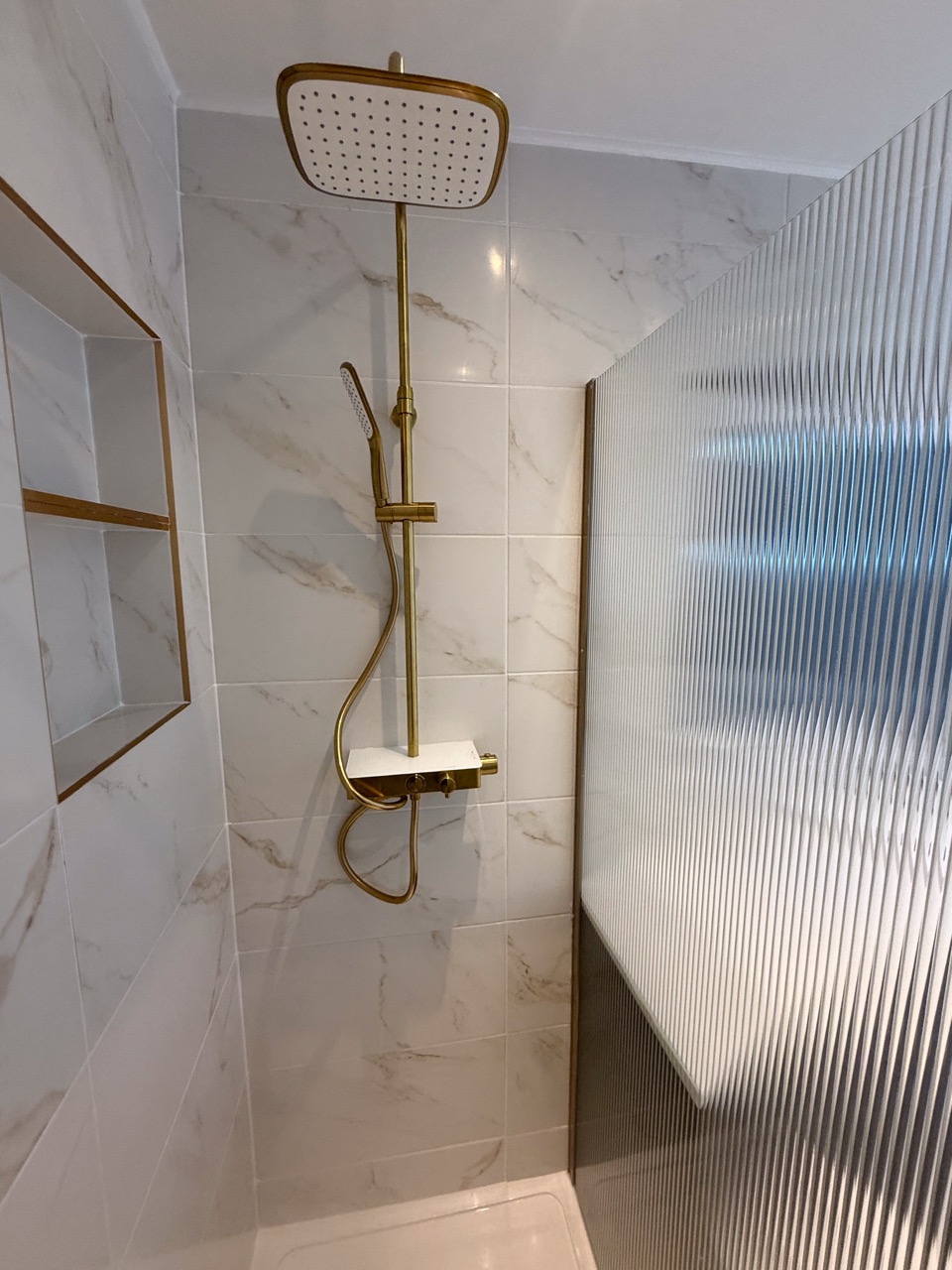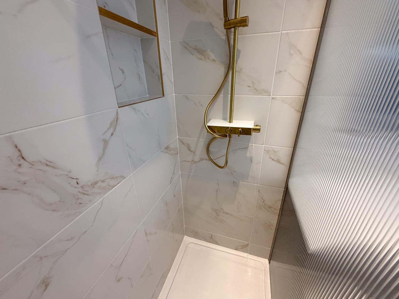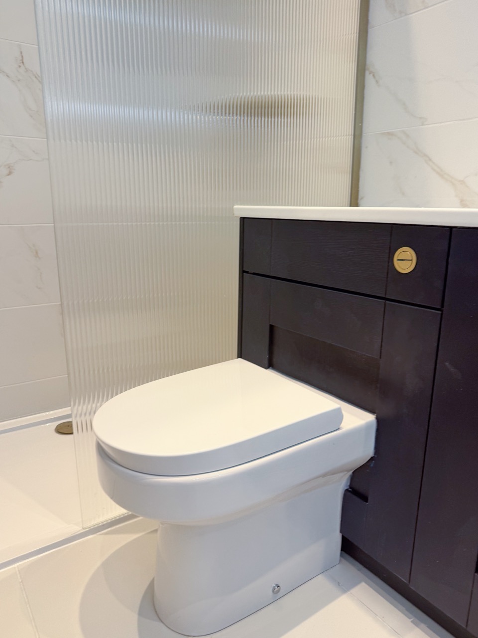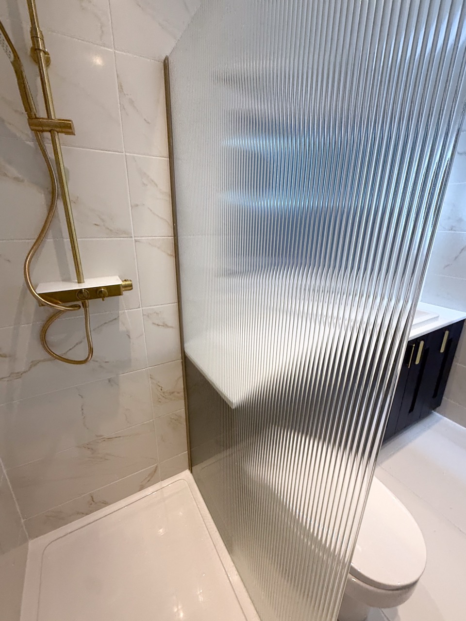 The bathroom was fully tiled on both walls and floor, finished with epoxy grout for a cleaner look and easier long-term maintenance. We also installed a practical shower recess for everyday storage, along with brass fittings and fluted glass to give the shower area a more premium, modern feel.