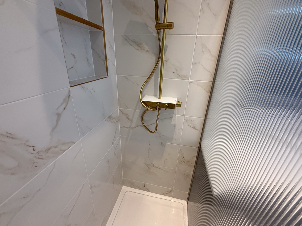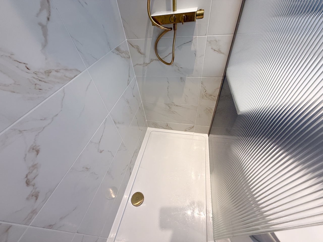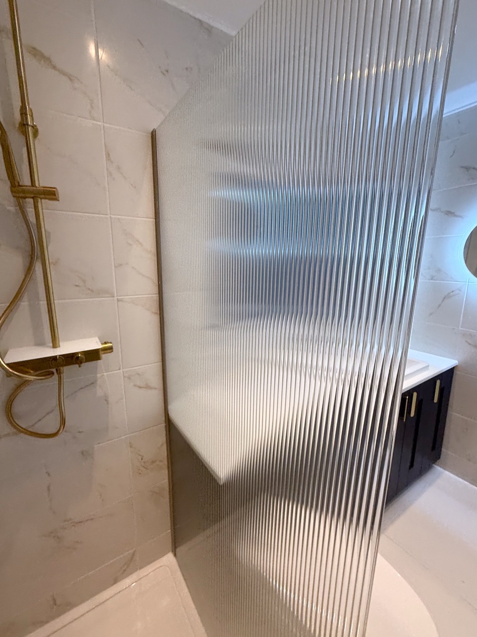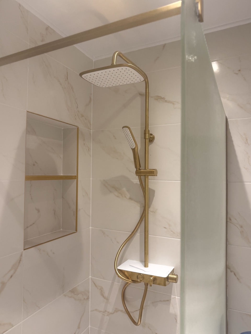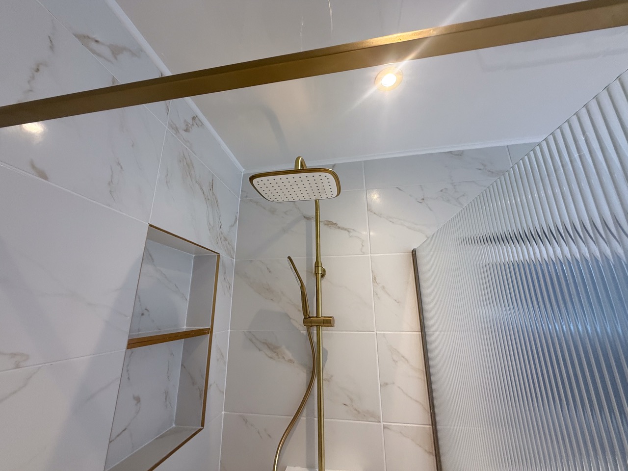 The bathroom was fully tiled on both walls and floor, finished with epoxy grout for a cleaner look and easier long-term maintenance. We also installed a practical shower recess for everyday storage, along with brass fittings and fluted glass to give the shower area a more premium, modern feel.
