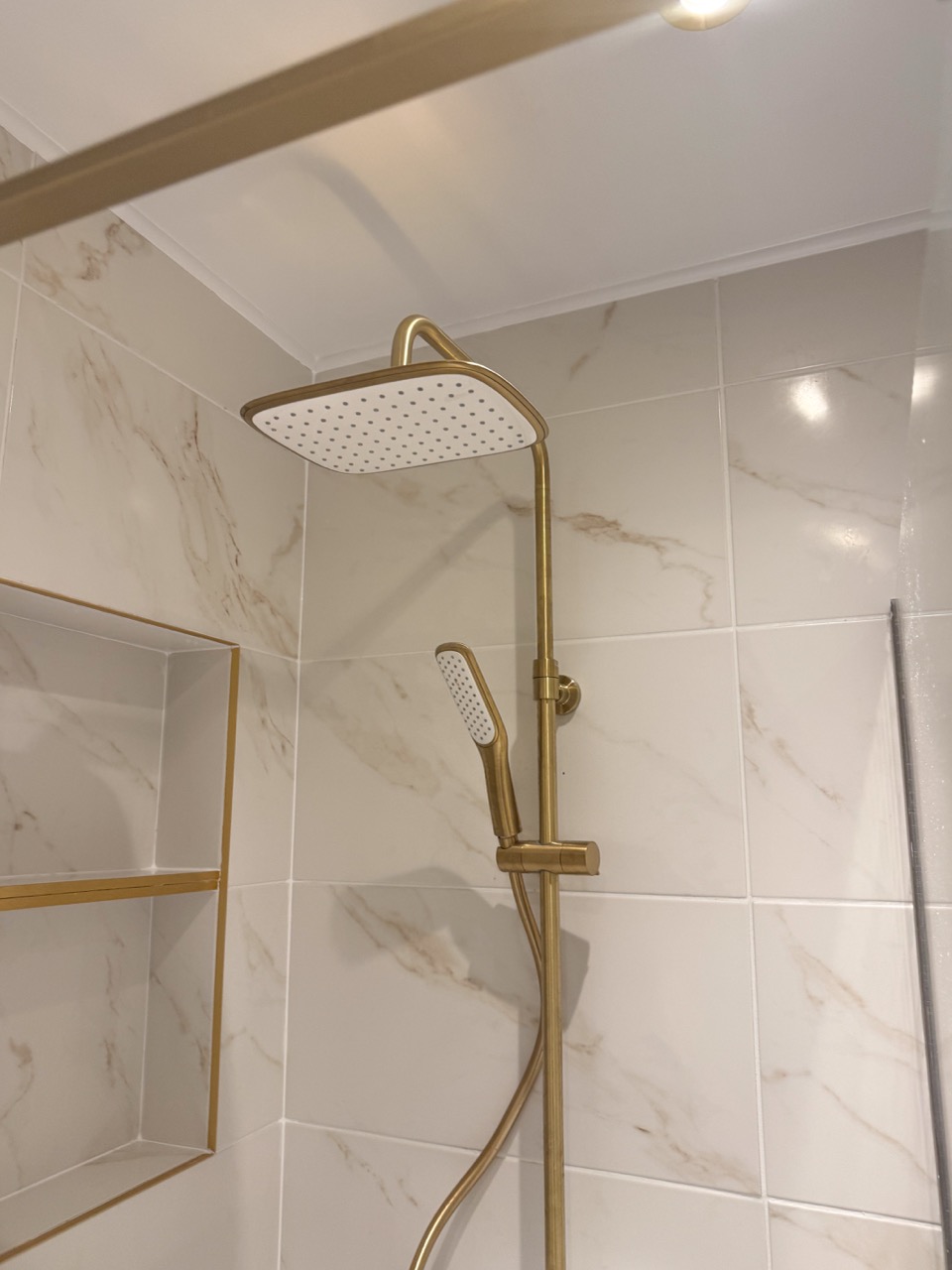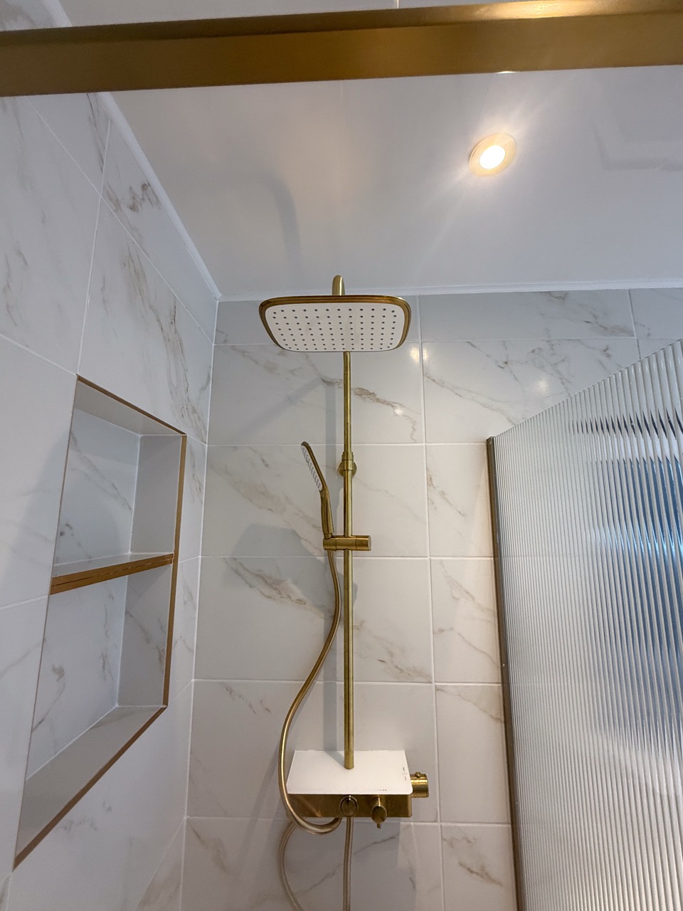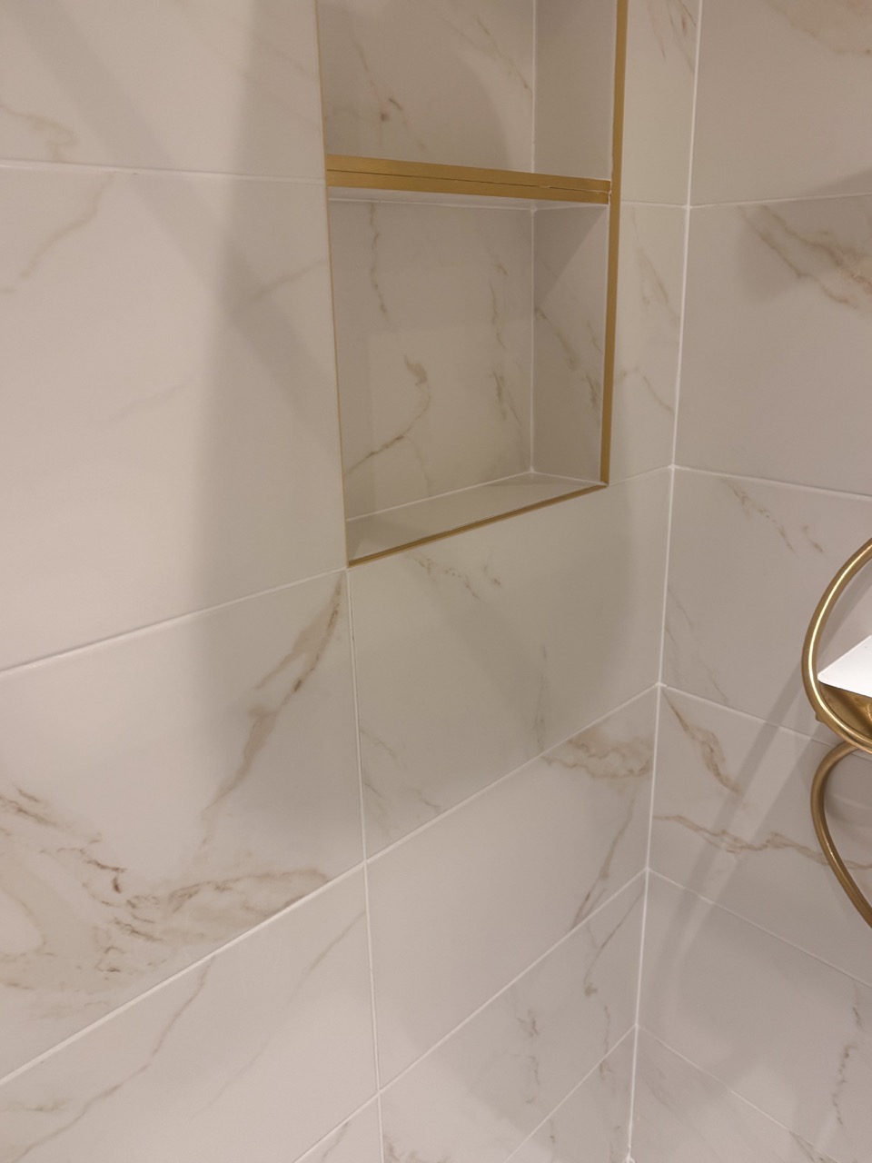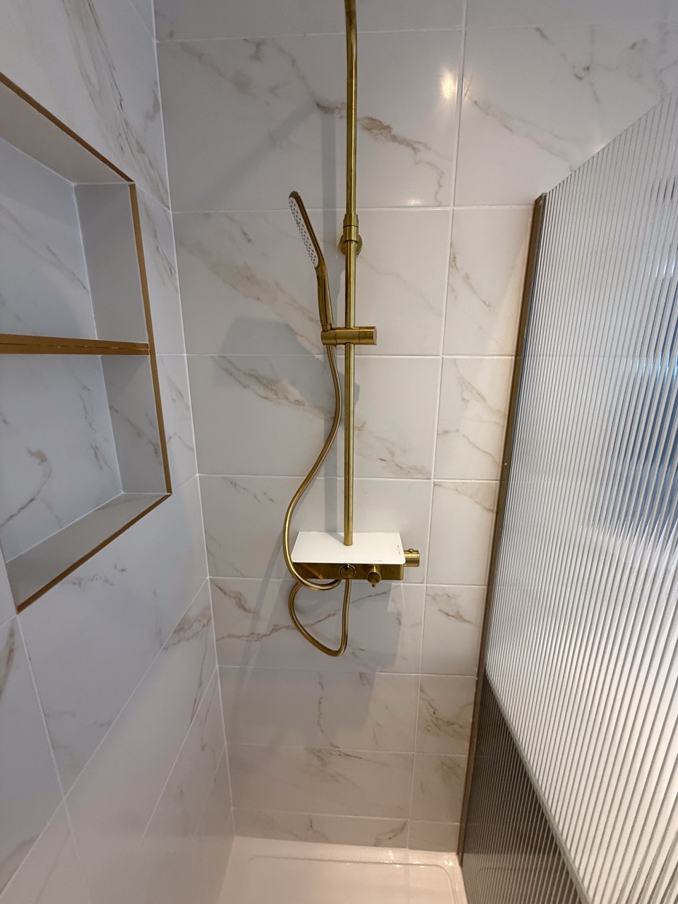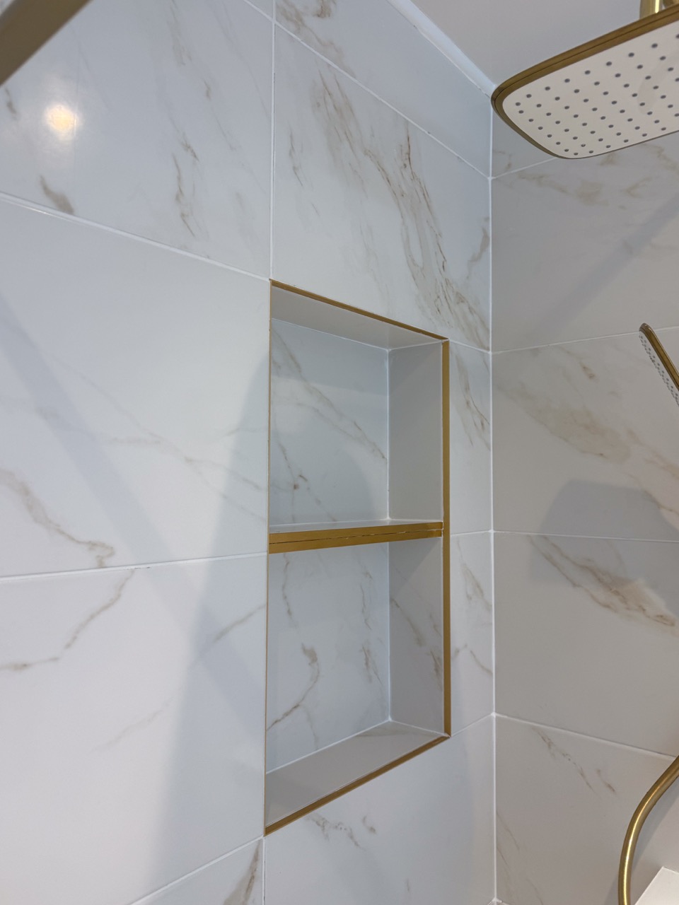 The bathroom was fully tiled on both walls and floor, finished with epoxy grout for a cleaner look and easier long-term maintenance. We also installed a practical shower recess for everyday storage, along with brass fittings and fluted glass to give the shower area a more premium, modern feel.